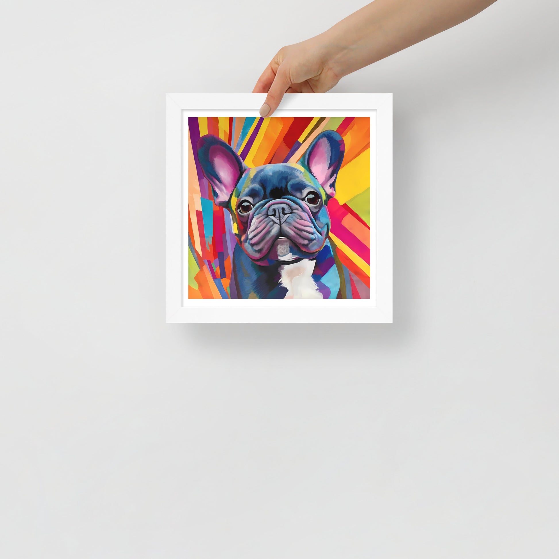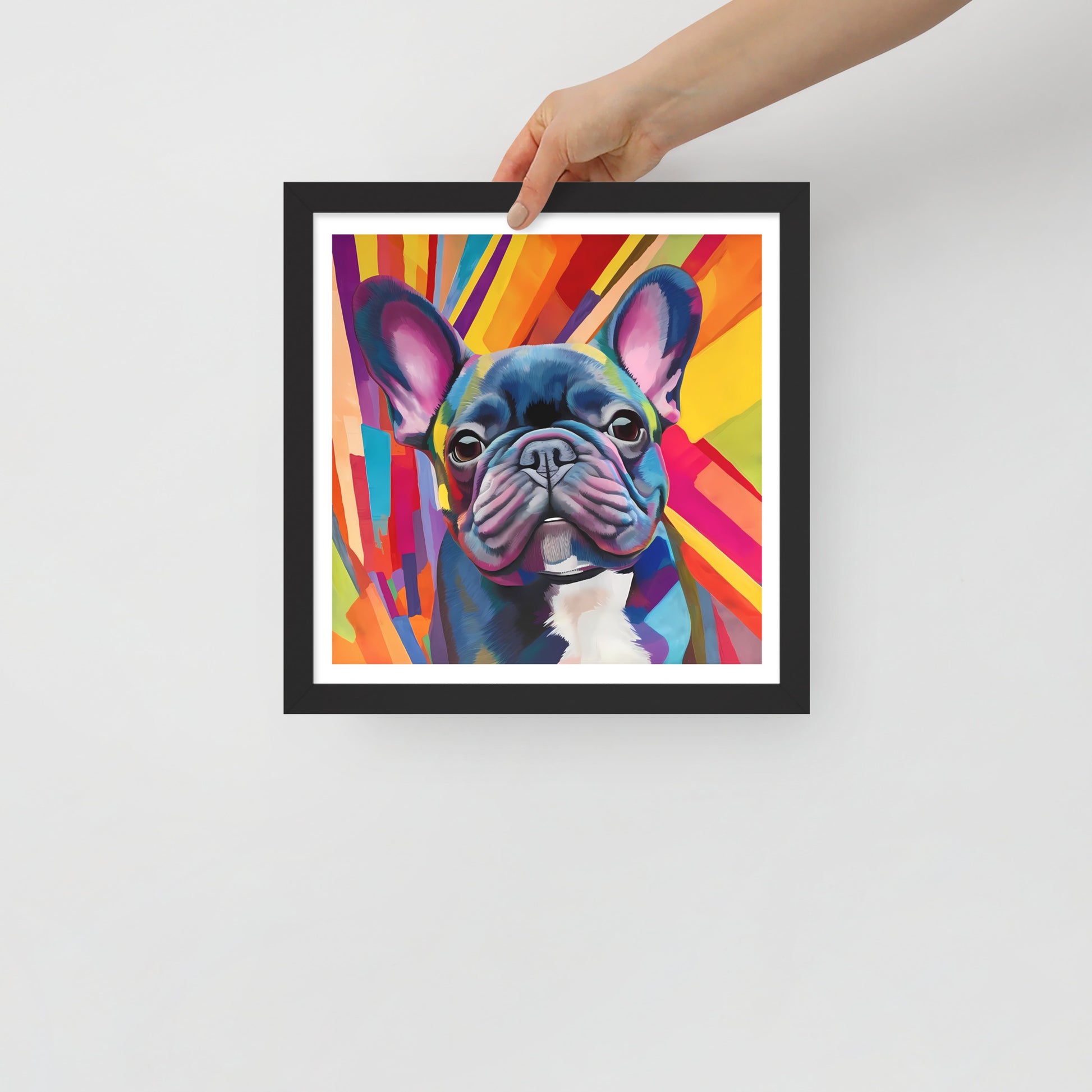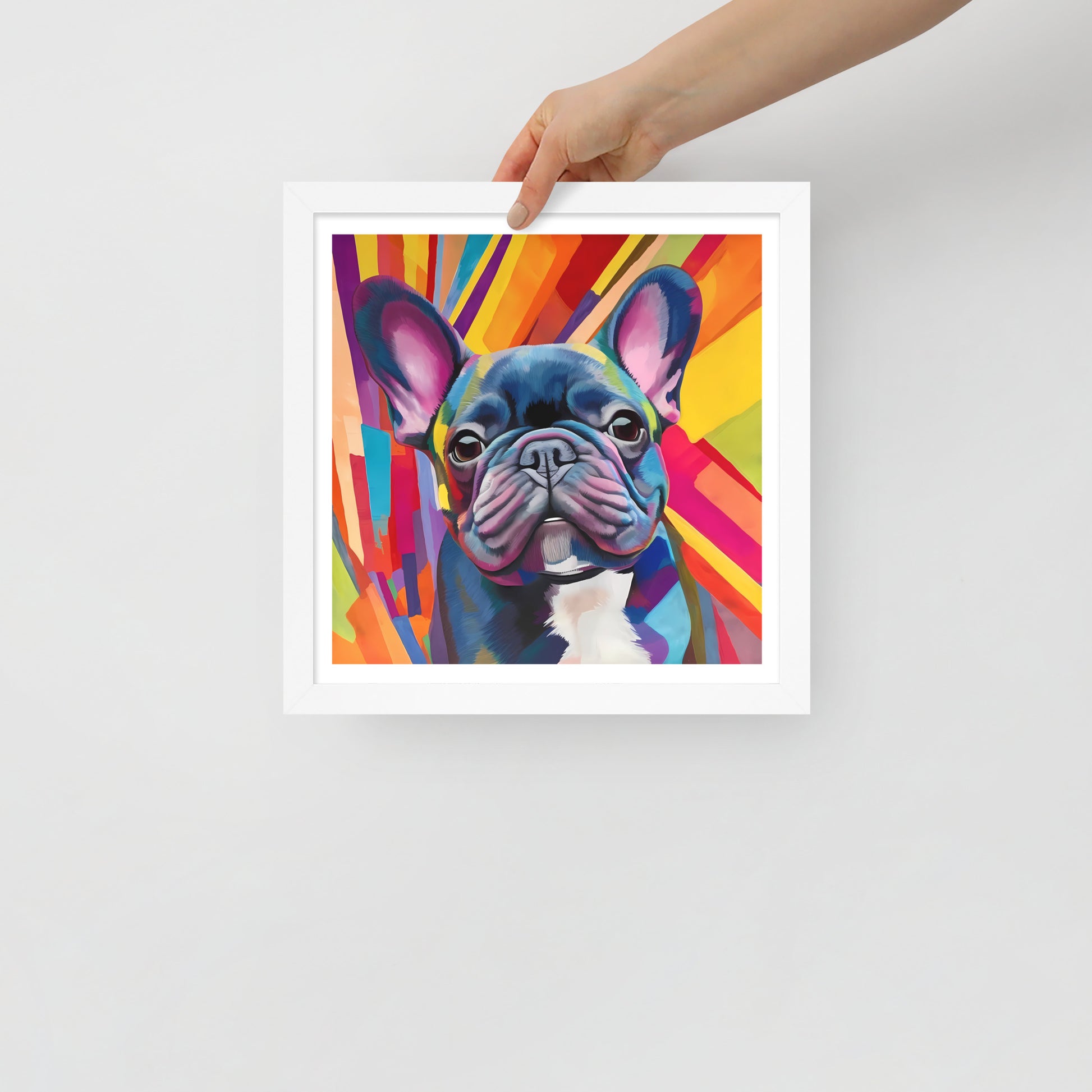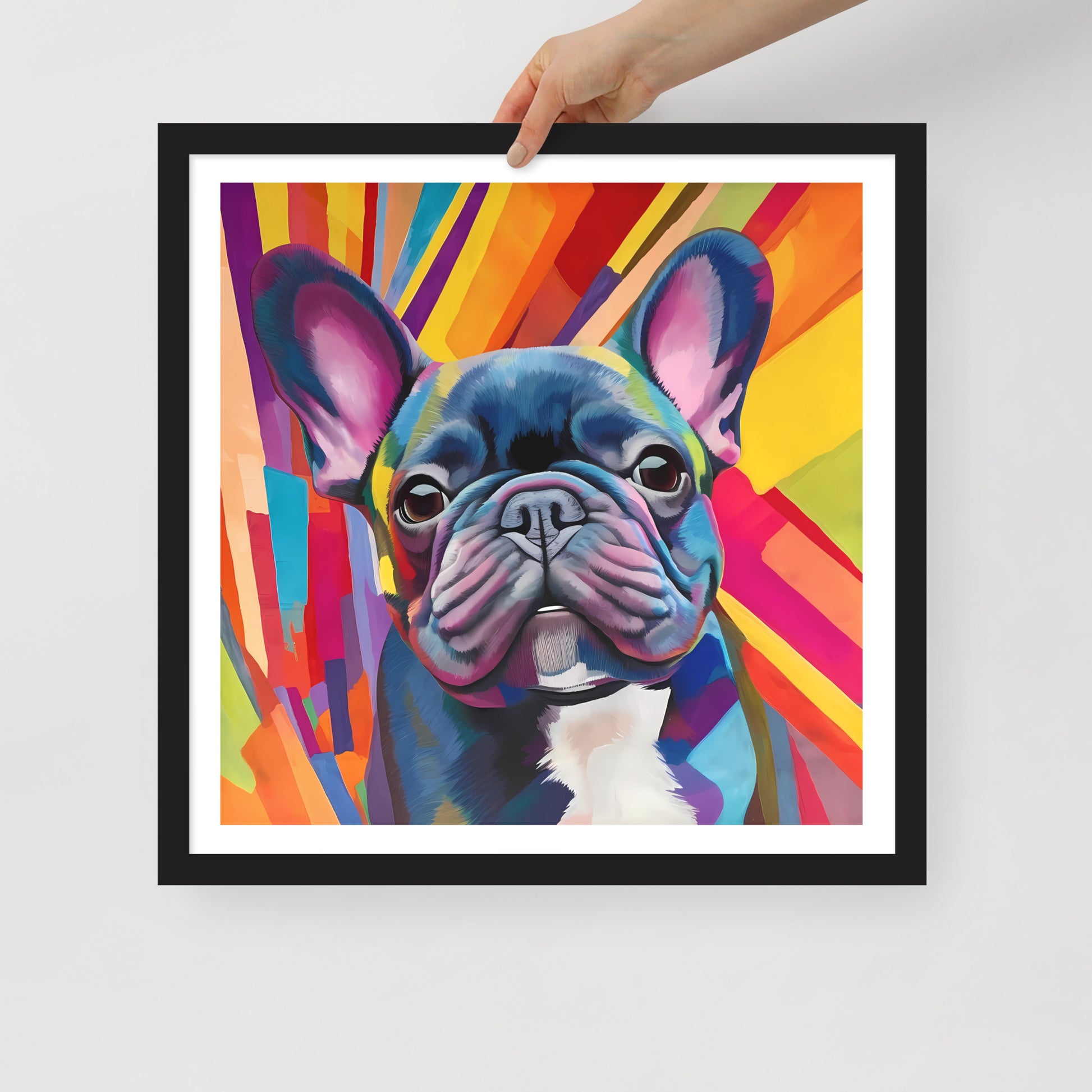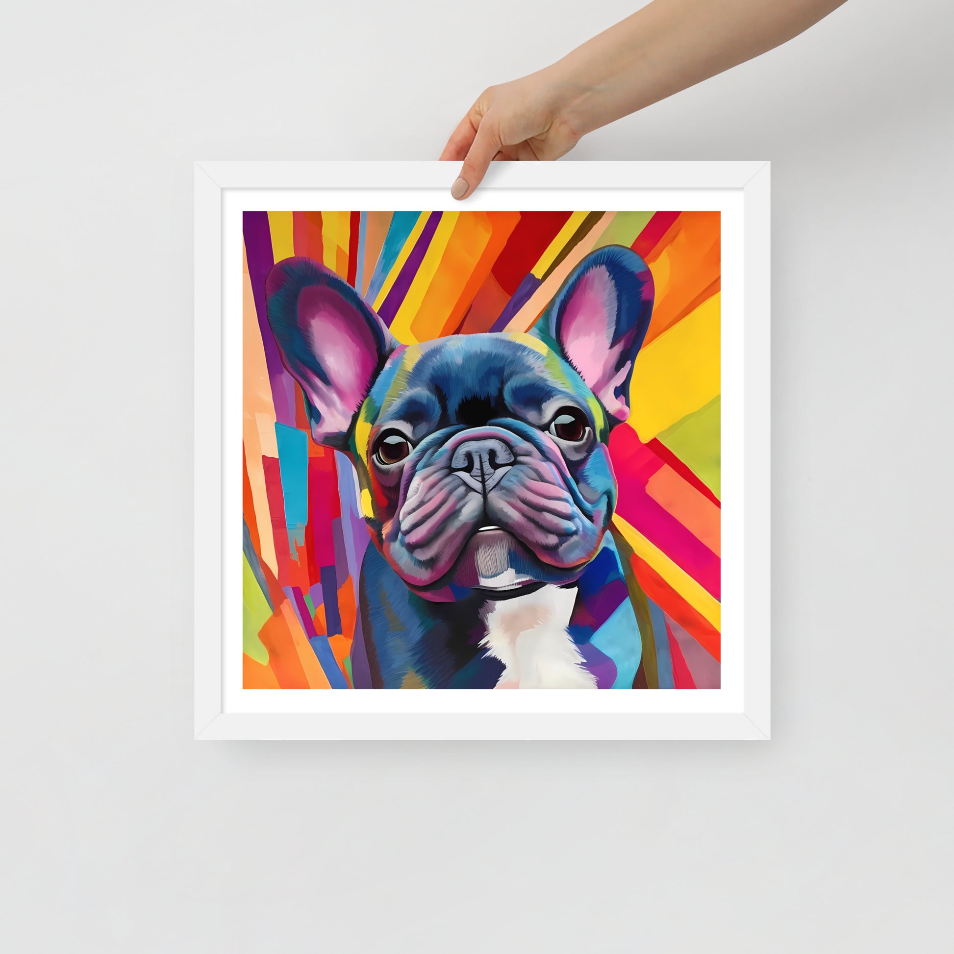 Introducing "Azure Abstraction," a framed artwork that is a true spectacle of chromatic charm. This piece features a blue French Bulldog, rendered in a cascade of radiant colors, its soulful eyes and playful demeanor brilliantly brought to life against an energetic backdrop of abstract lines and vibrant hues. The blue of the Frenchie is a calm epicenter in a storm of warm oranges, yellows, and cool purples, reminiscent of a kaleidoscope of dawn and dusk.