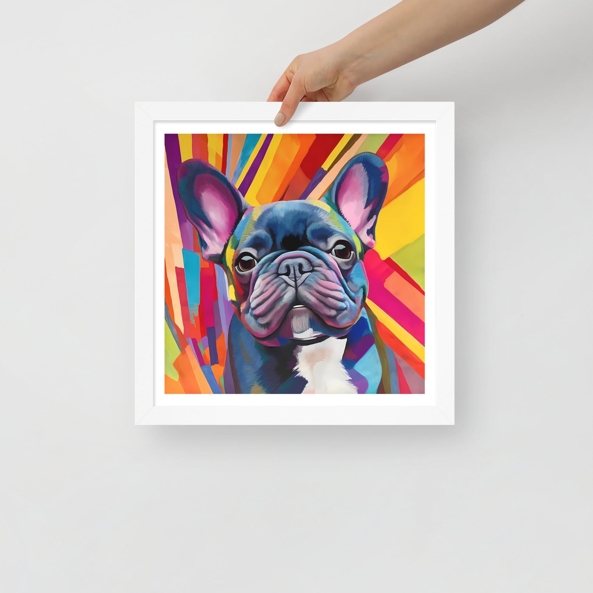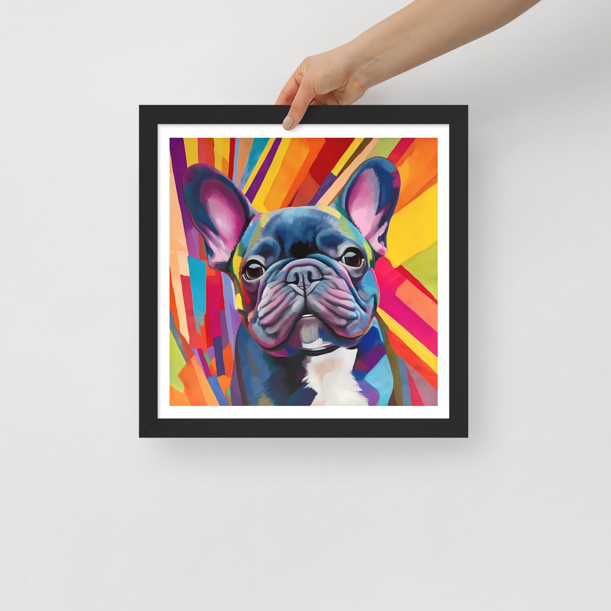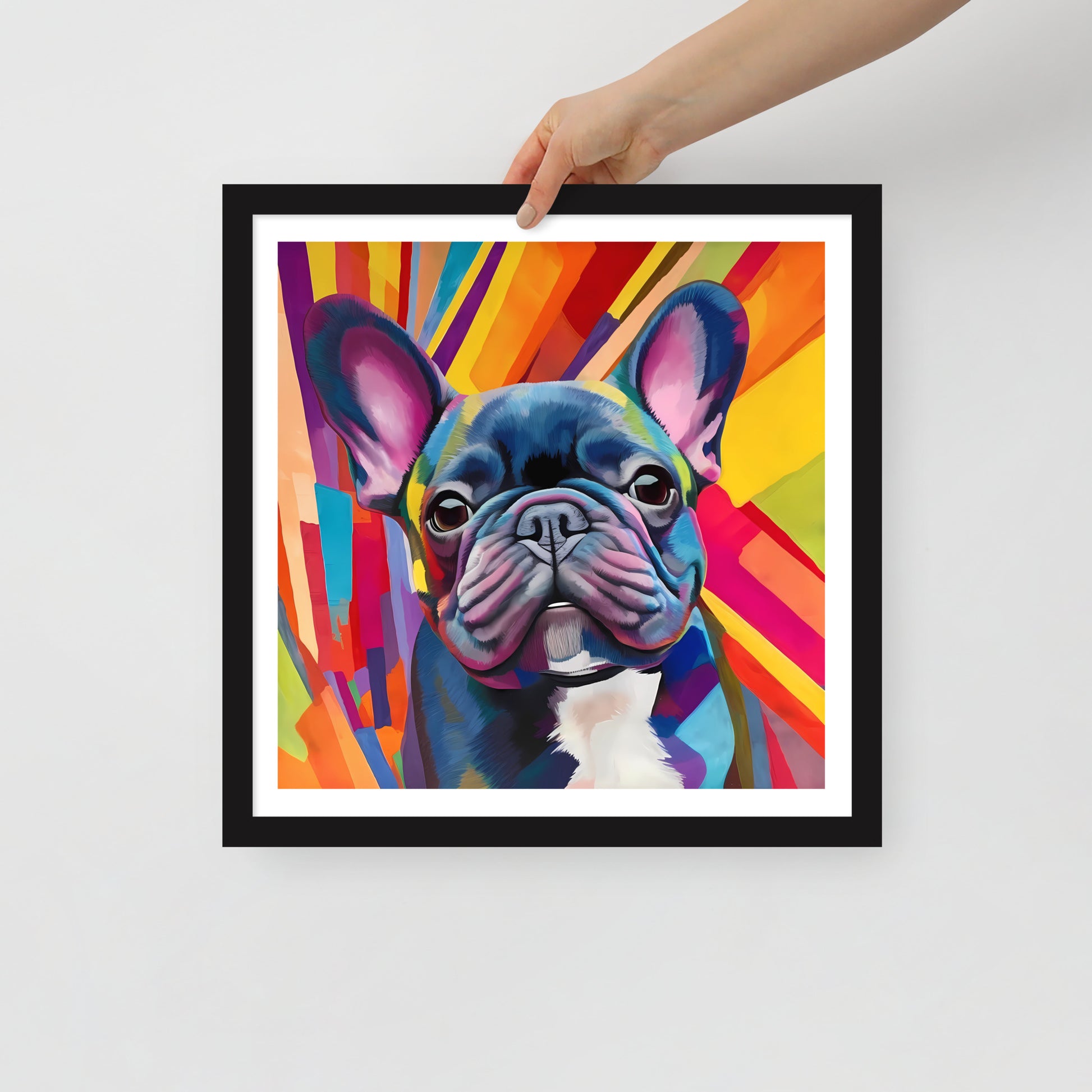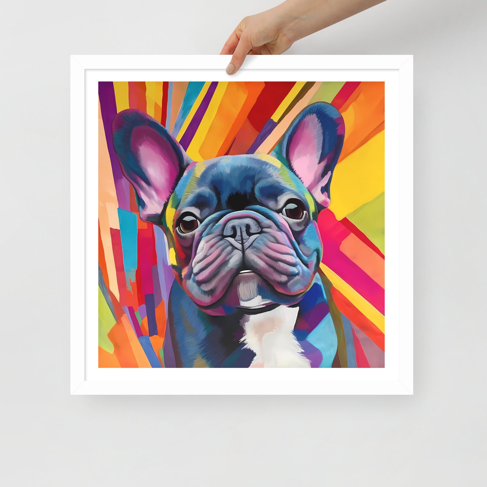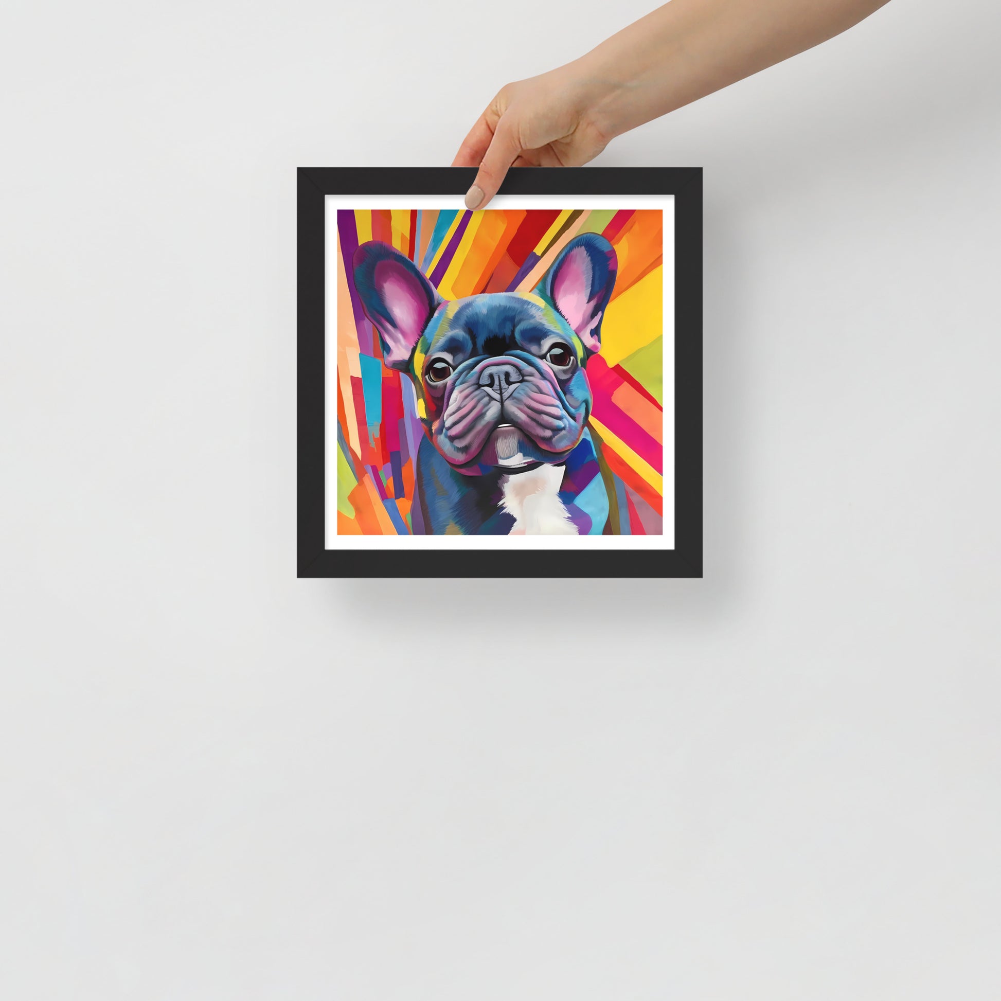 Introducing "Azure Abstraction," a framed artwork that is a true spectacle of chromatic charm. This piece features a blue French Bulldog, rendered in a cascade of radiant colors, its soulful eyes and playful demeanor brilliantly brought to life against an energetic backdrop of abstract lines and vibrant hues. The blue of the Frenchie is a calm epicenter in a storm of warm oranges, yellows, and cool purples, reminiscent of a kaleidoscope of dawn and dusk.