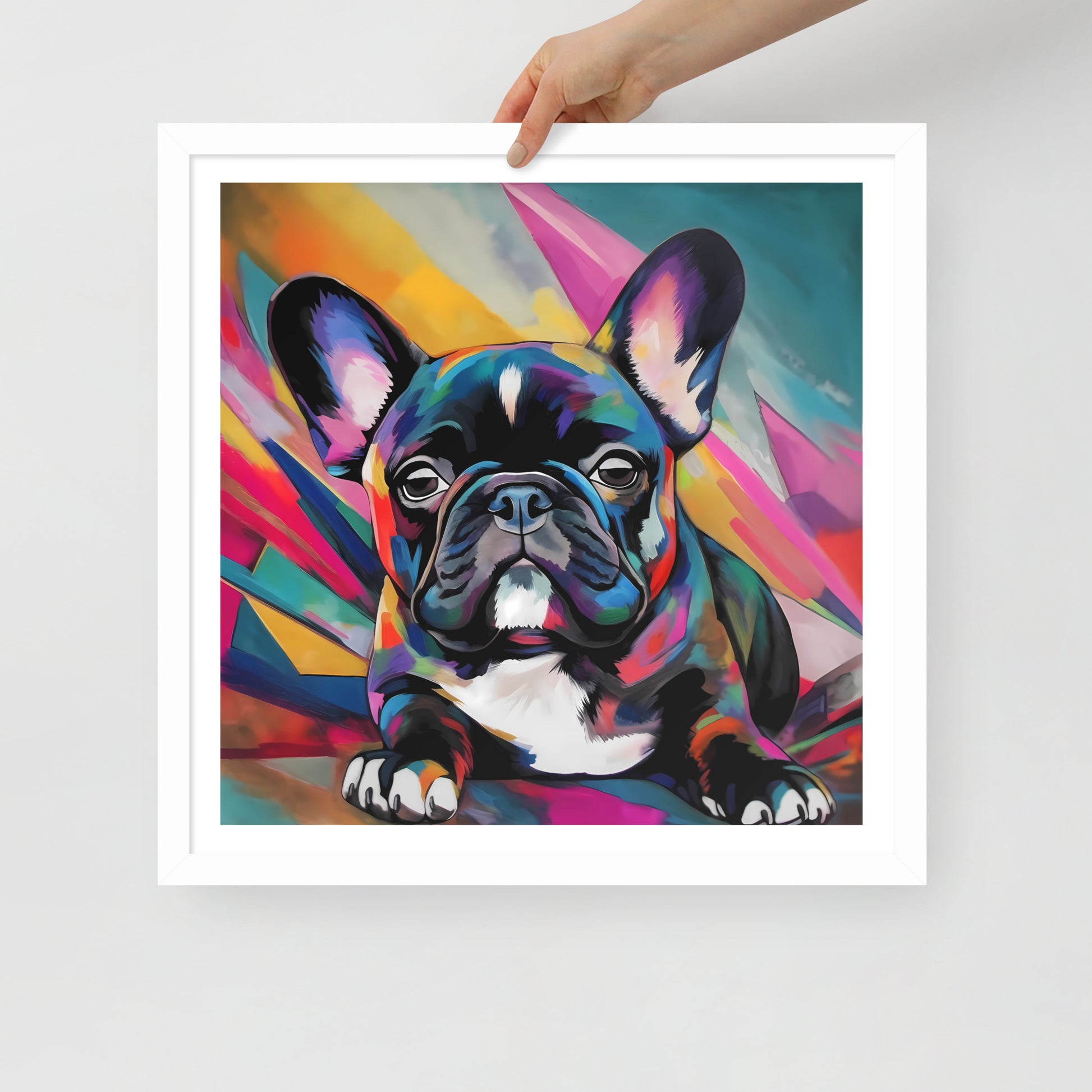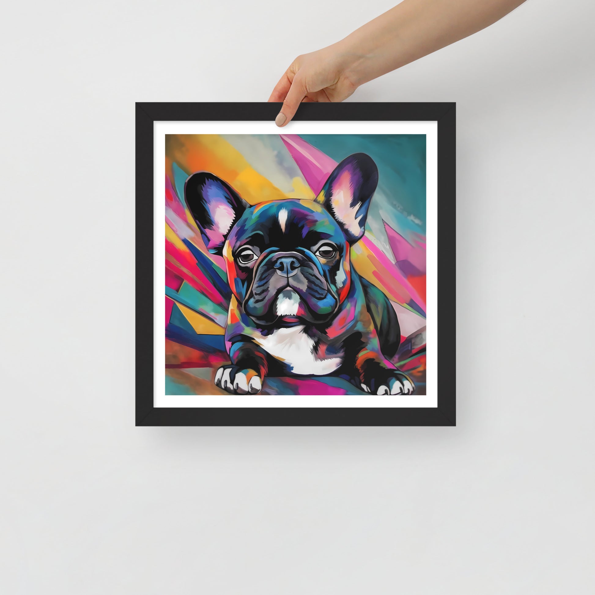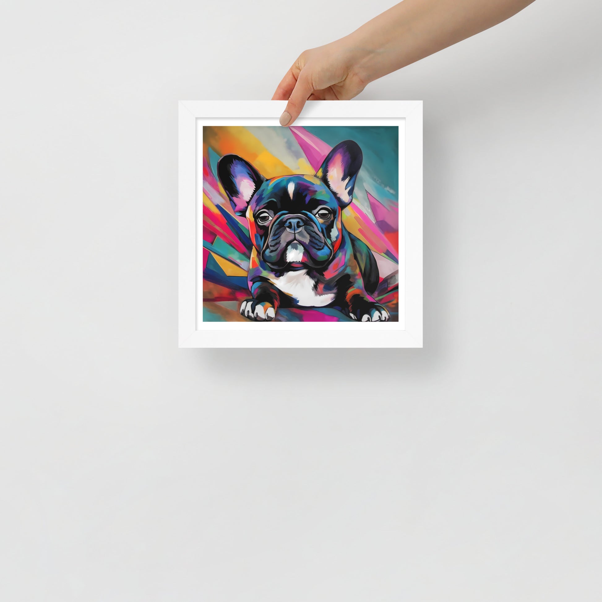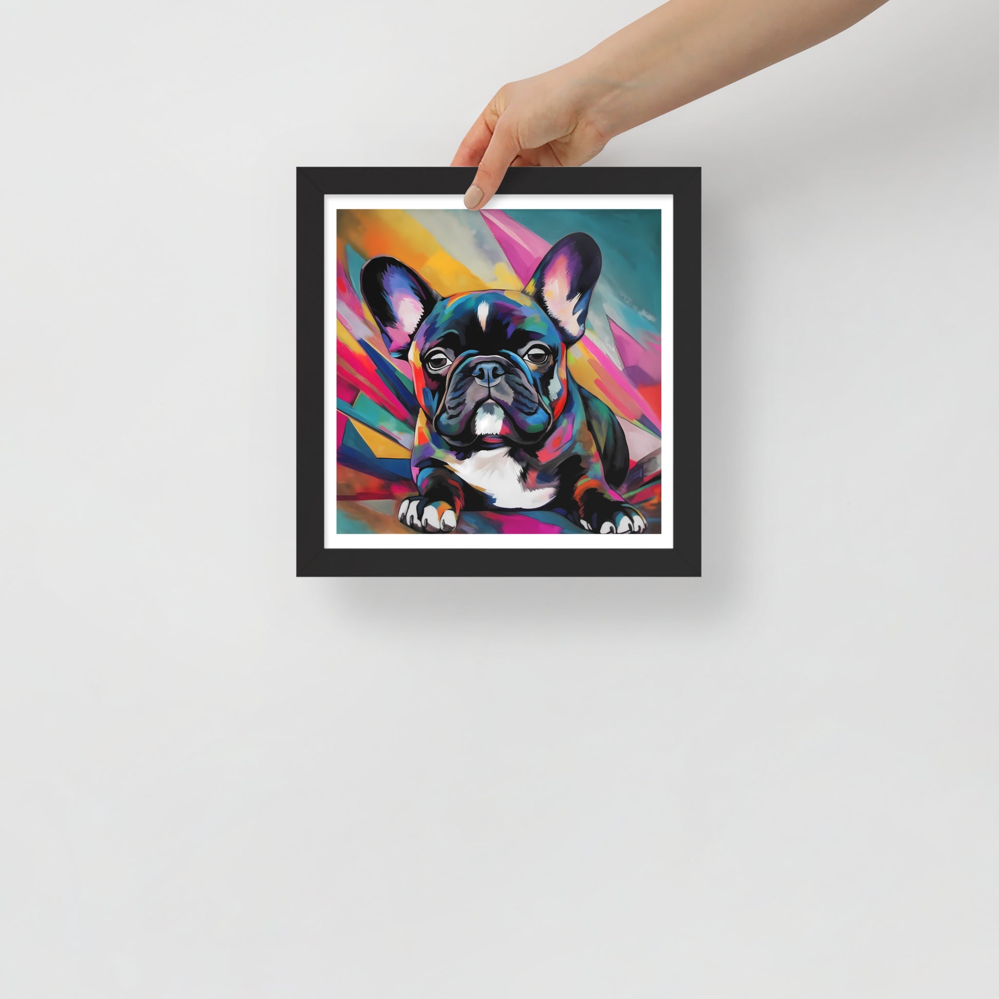 "Brindle Blaze" encapsulates the spirit of a brindle French Bulldog, a whimsical creature of color and vivacity. This framed artwork is a geometric dance of shapes and hues, a vivid mosaic that radiates from the canvas, framing the pup's poised demeanor. Each multi-faceted stroke adds depth and texture, creating a dynamic backdrop that exudes a sense of modernity and abstract edginess.