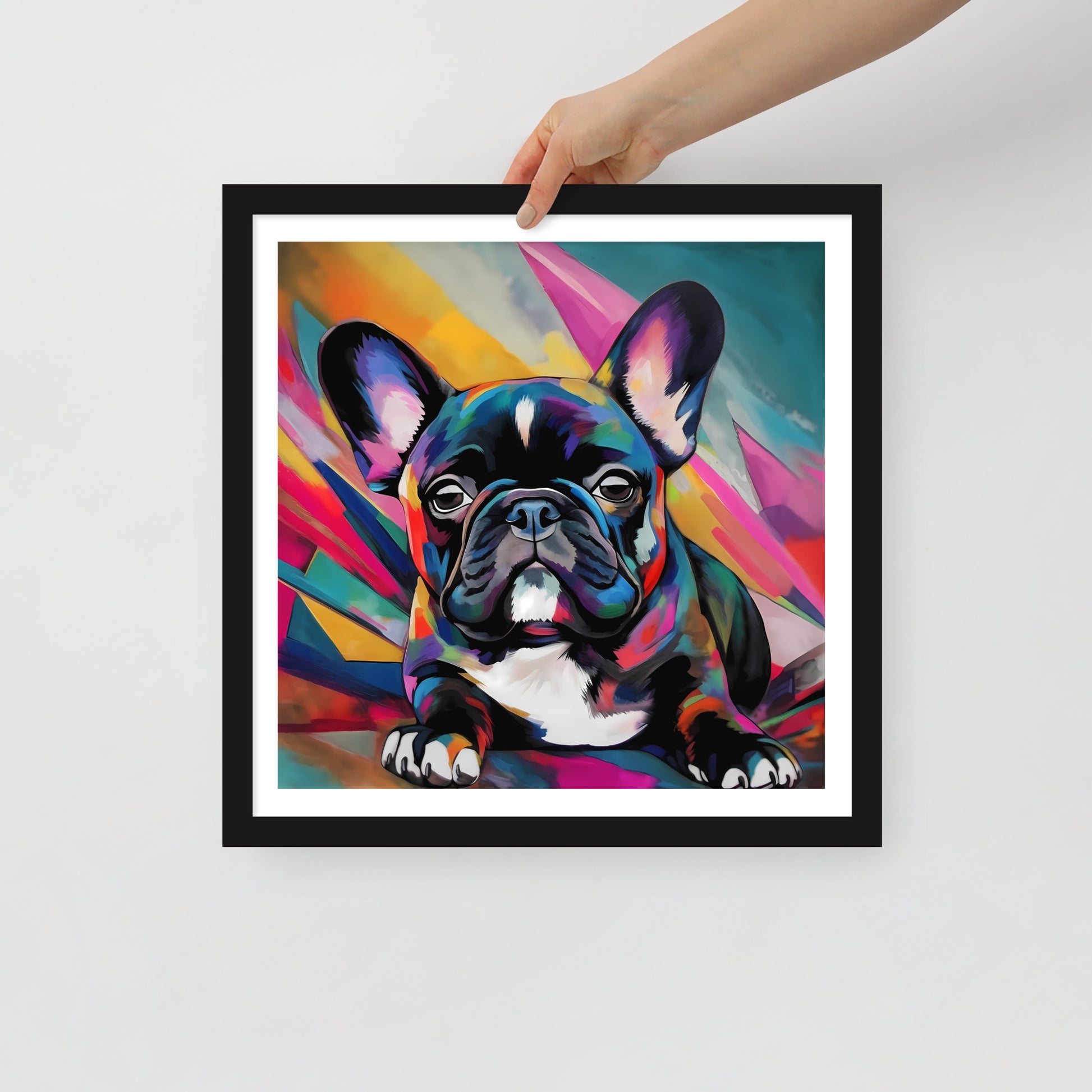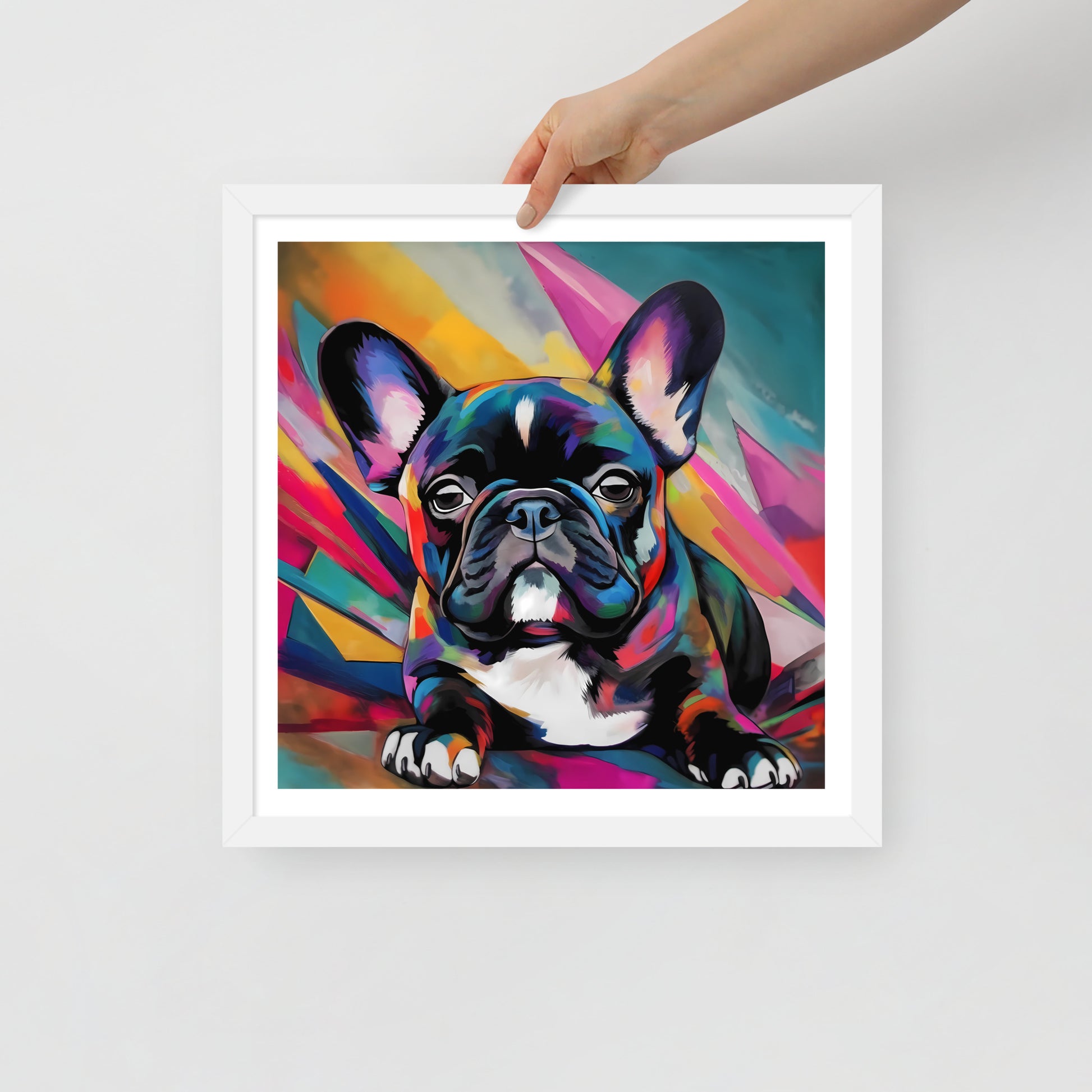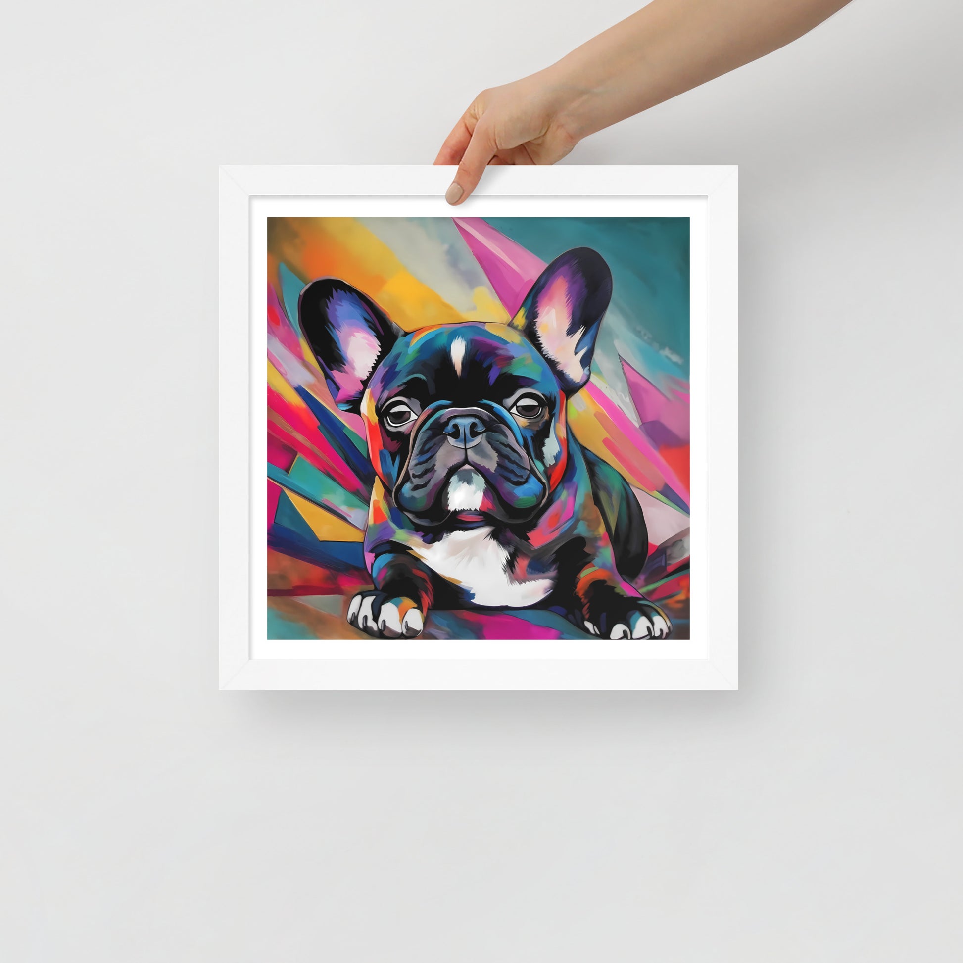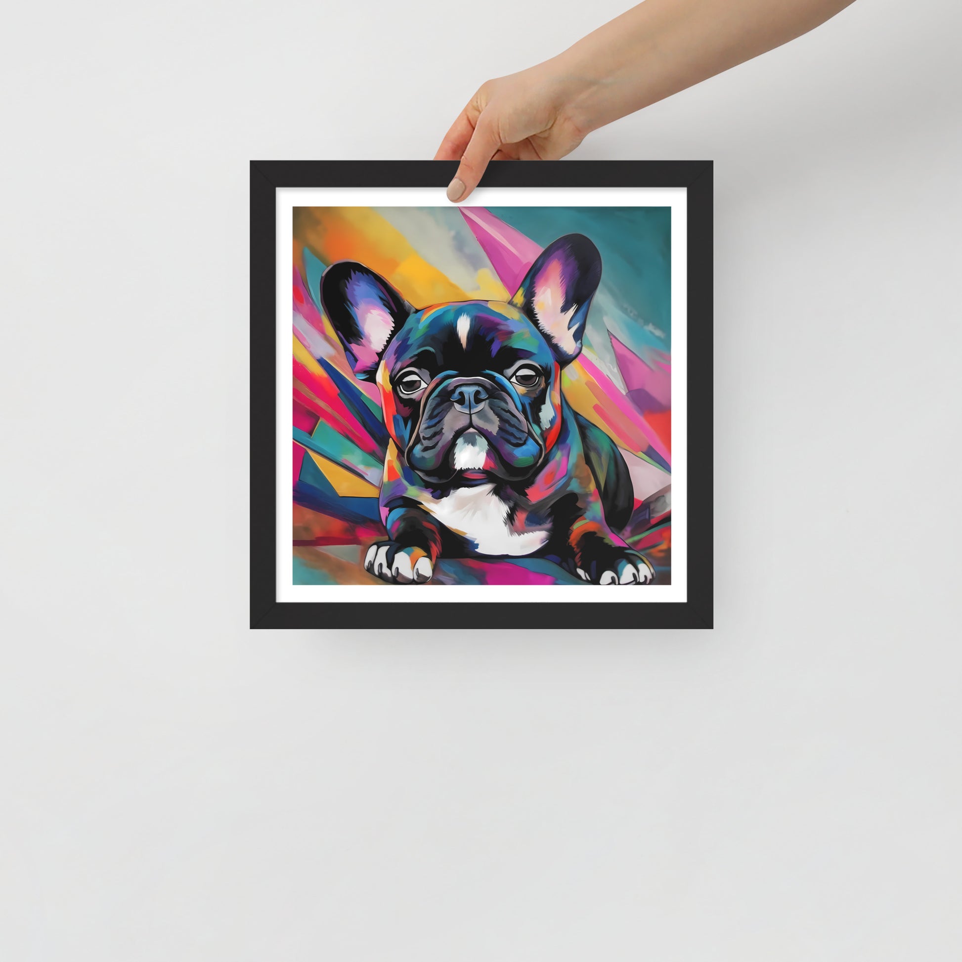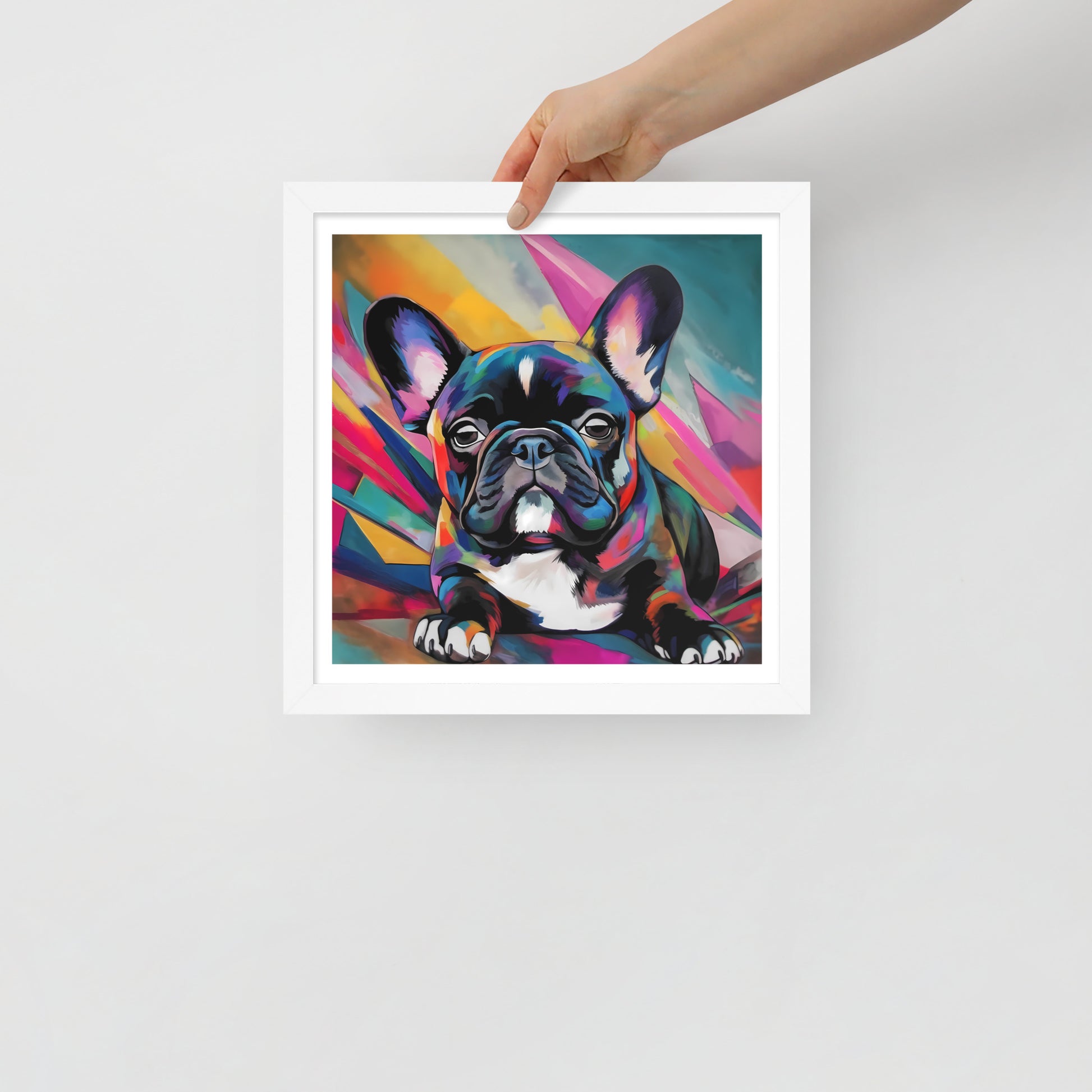 "Brindle Blaze" encapsulates the spirit of a brindle French Bulldog, a whimsical creature of color and vivacity. This framed artwork is a geometric dance of shapes and hues, a vivid mosaic that radiates from the canvas, framing the pup's poised demeanor. Each multi-faceted stroke adds depth and texture, creating a dynamic backdrop that exudes a sense of modernity and abstract edginess.