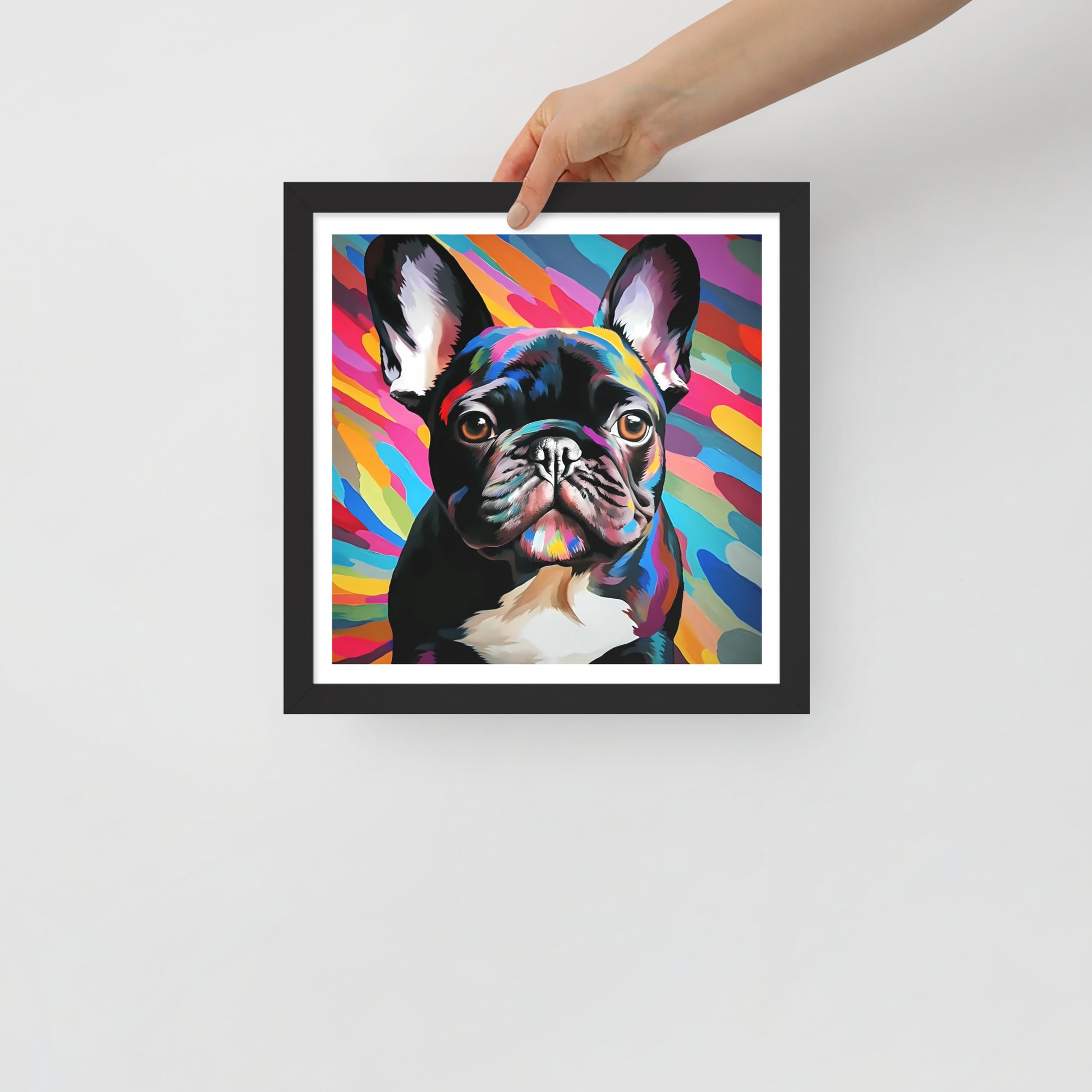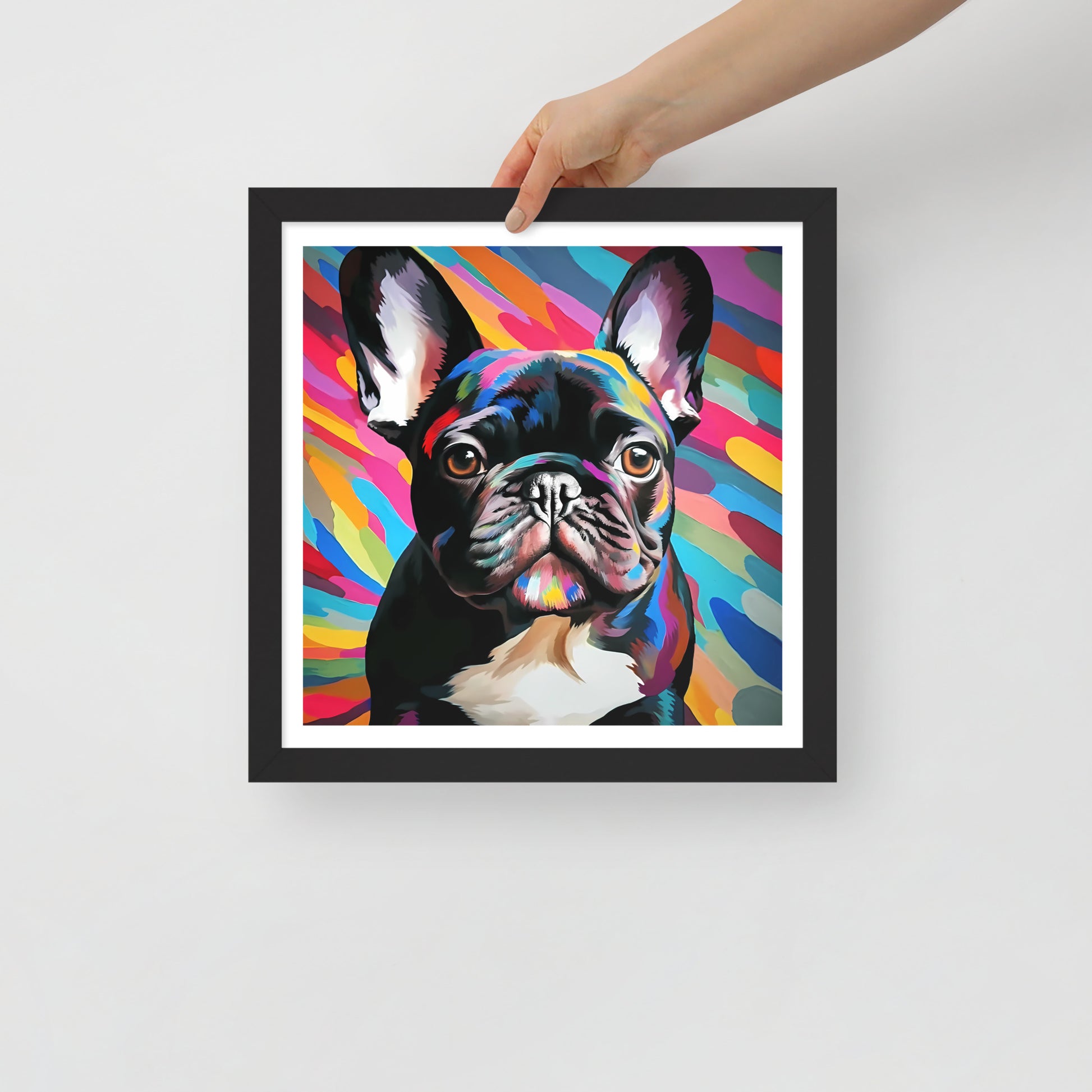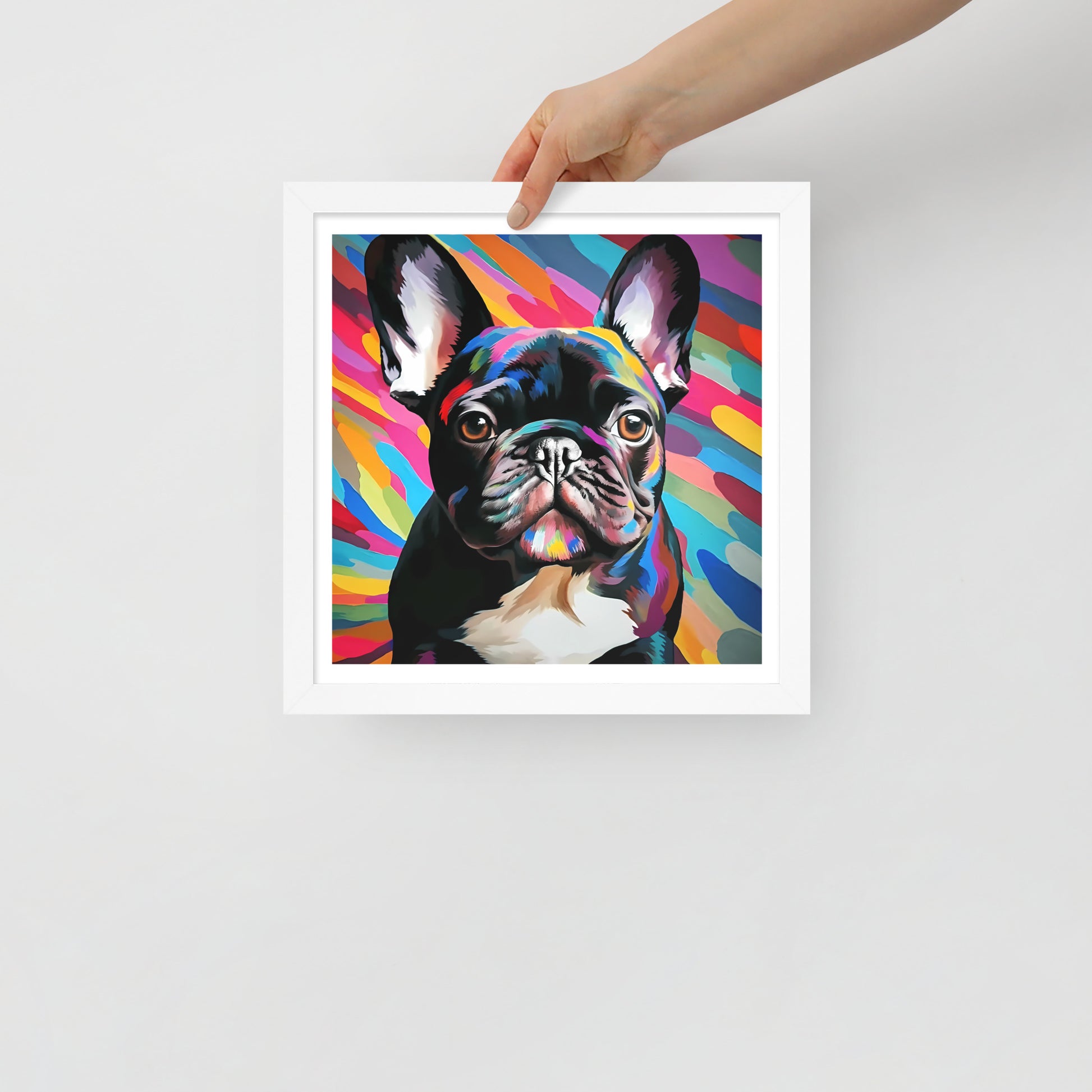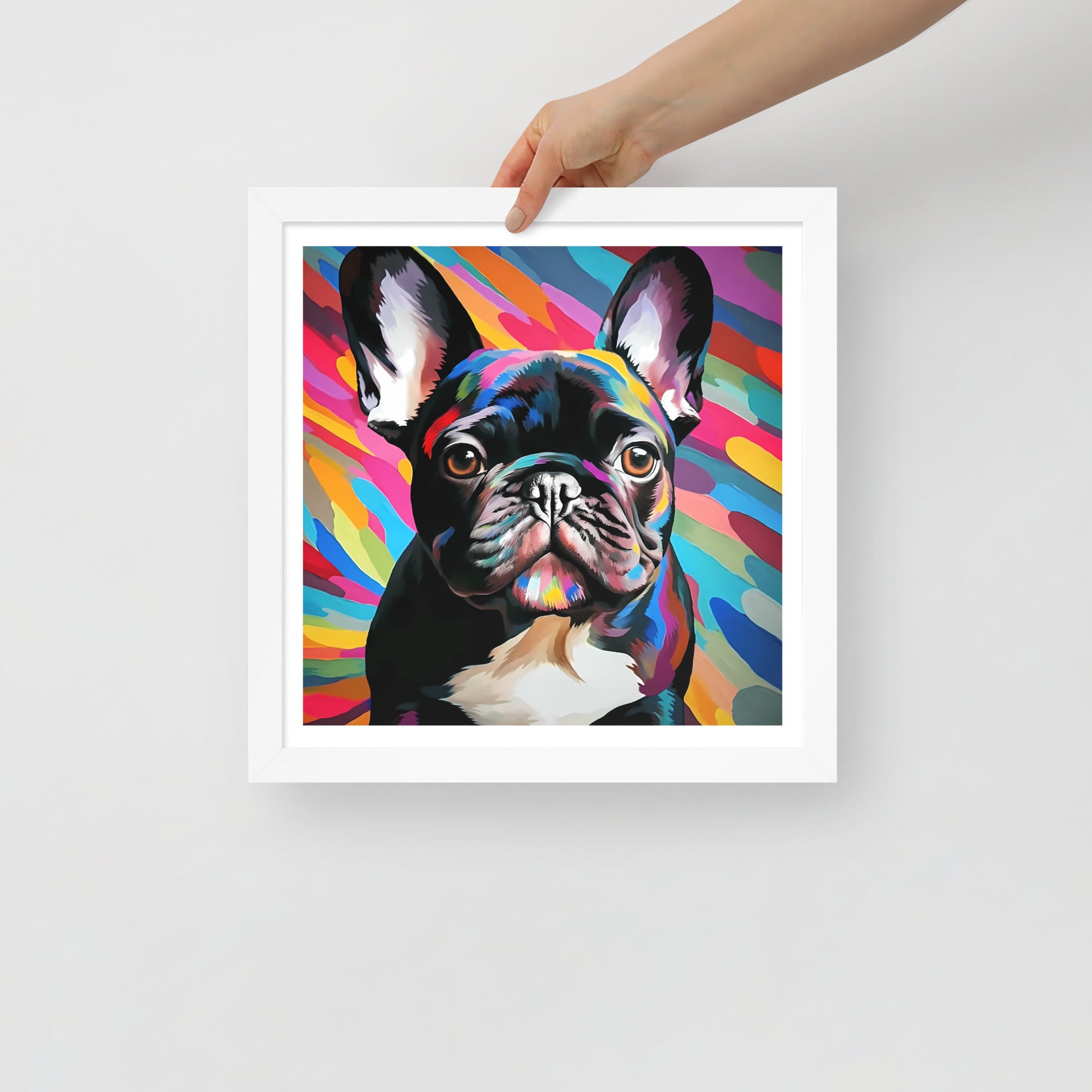 Introducing "Brindle Spectrum Splash" – a framed artwork that offers a mesmerizing blend of abstract art and the delightful charm of a brindle French Bulldog. This piece captures the spirited essence of the beloved Frenchie, set against a backdrop of swirling color waves that evoke a sense of movement and liveliness. The brindle hues of the Frenchie's coat are playfully reimagined in a kaleidoscope of vibrant colors, creating an artful contrast with the pastel-toned whirls that surround it.