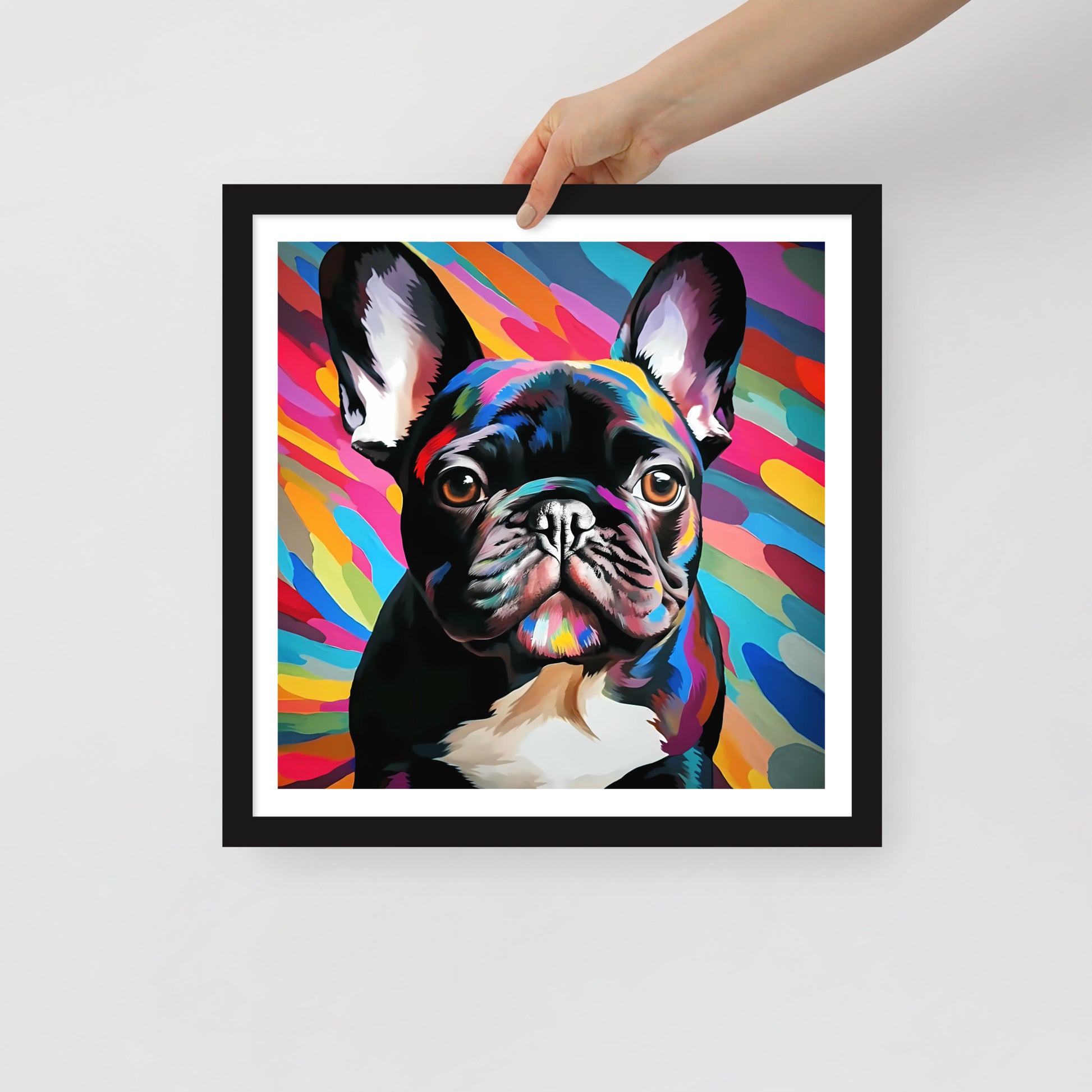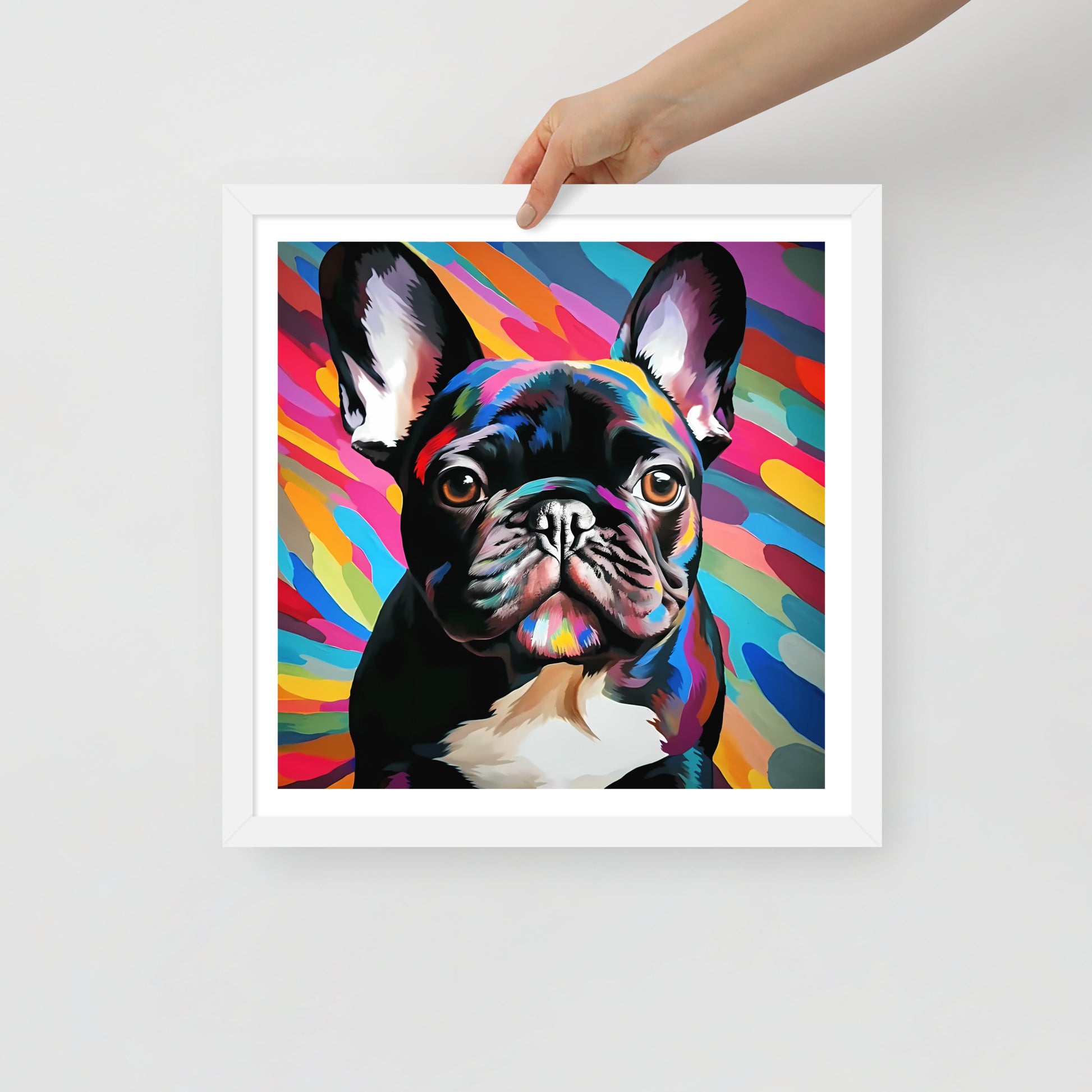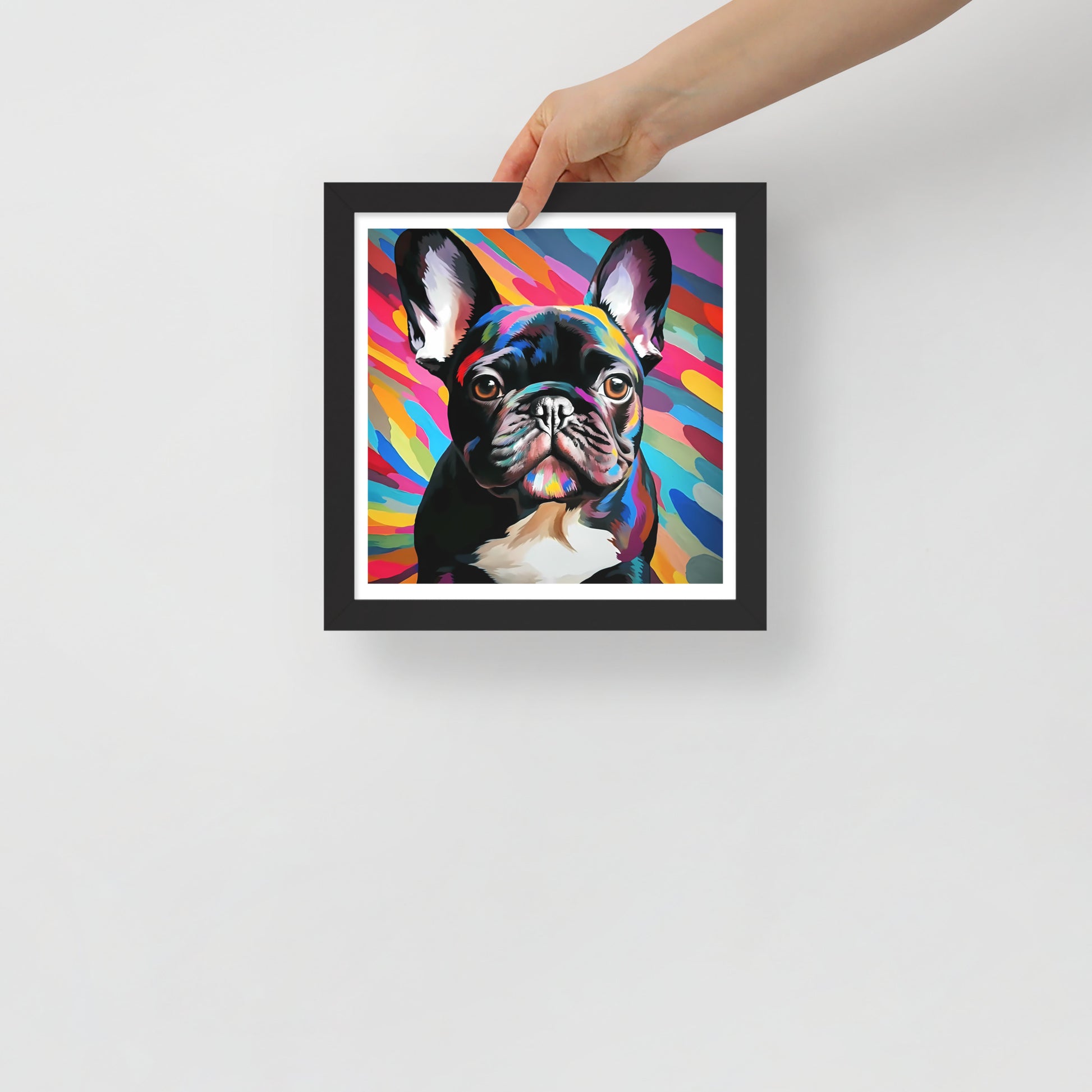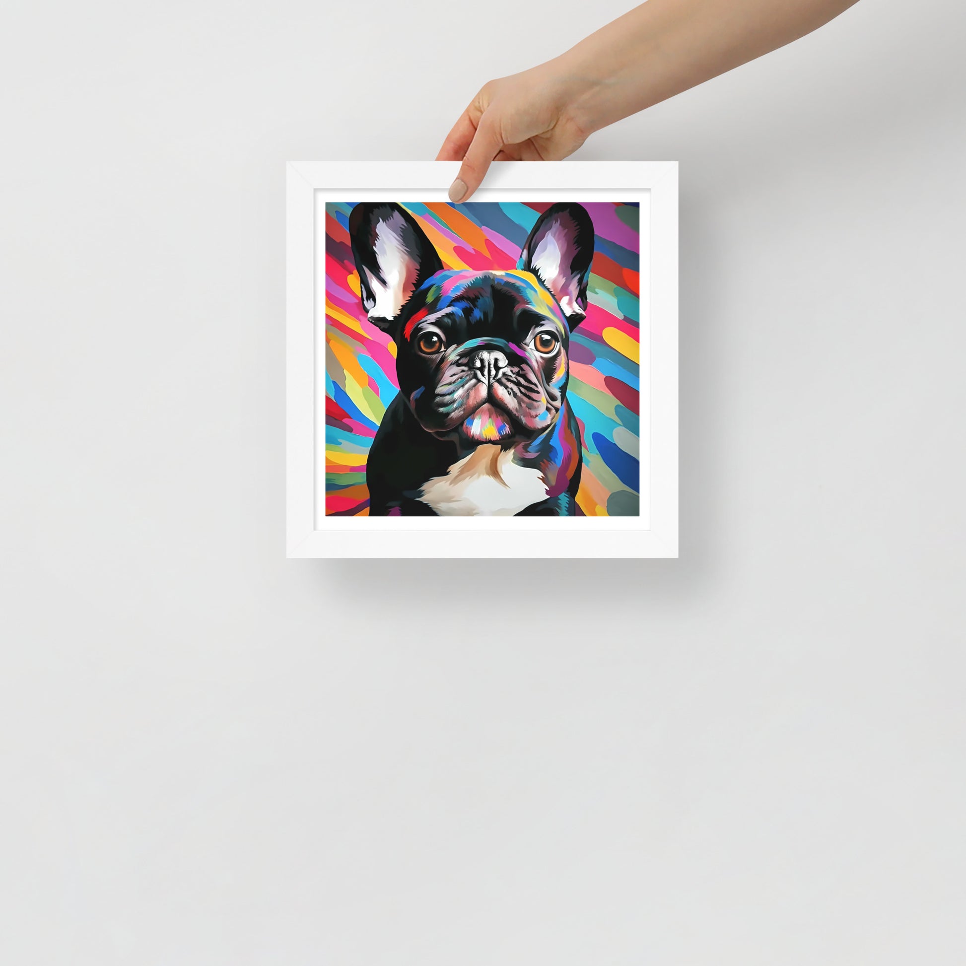 Introducing "Brindle Spectrum Splash" – a framed artwork that offers a mesmerizing blend of abstract art and the delightful charm of a brindle French Bulldog. This piece captures the spirited essence of the beloved Frenchie, set against a backdrop of swirling color waves that evoke a sense of movement and liveliness. The brindle hues of the Frenchie's coat are playfully reimagined in a kaleidoscope of vibrant colors, creating an artful contrast with the pastel-toned whirls that surround it.