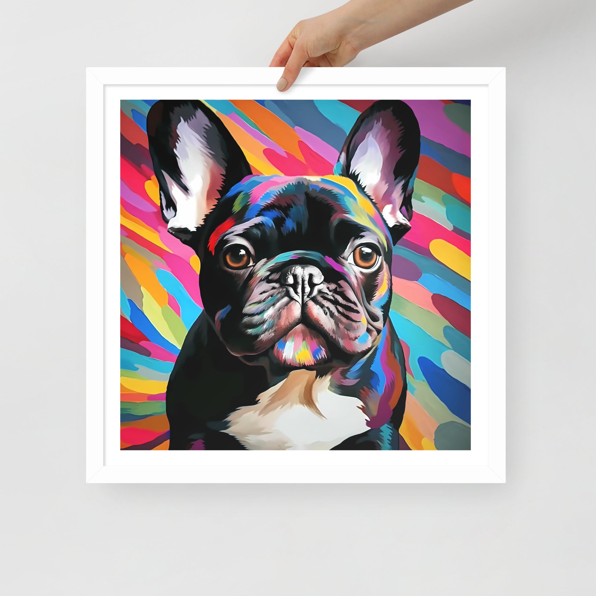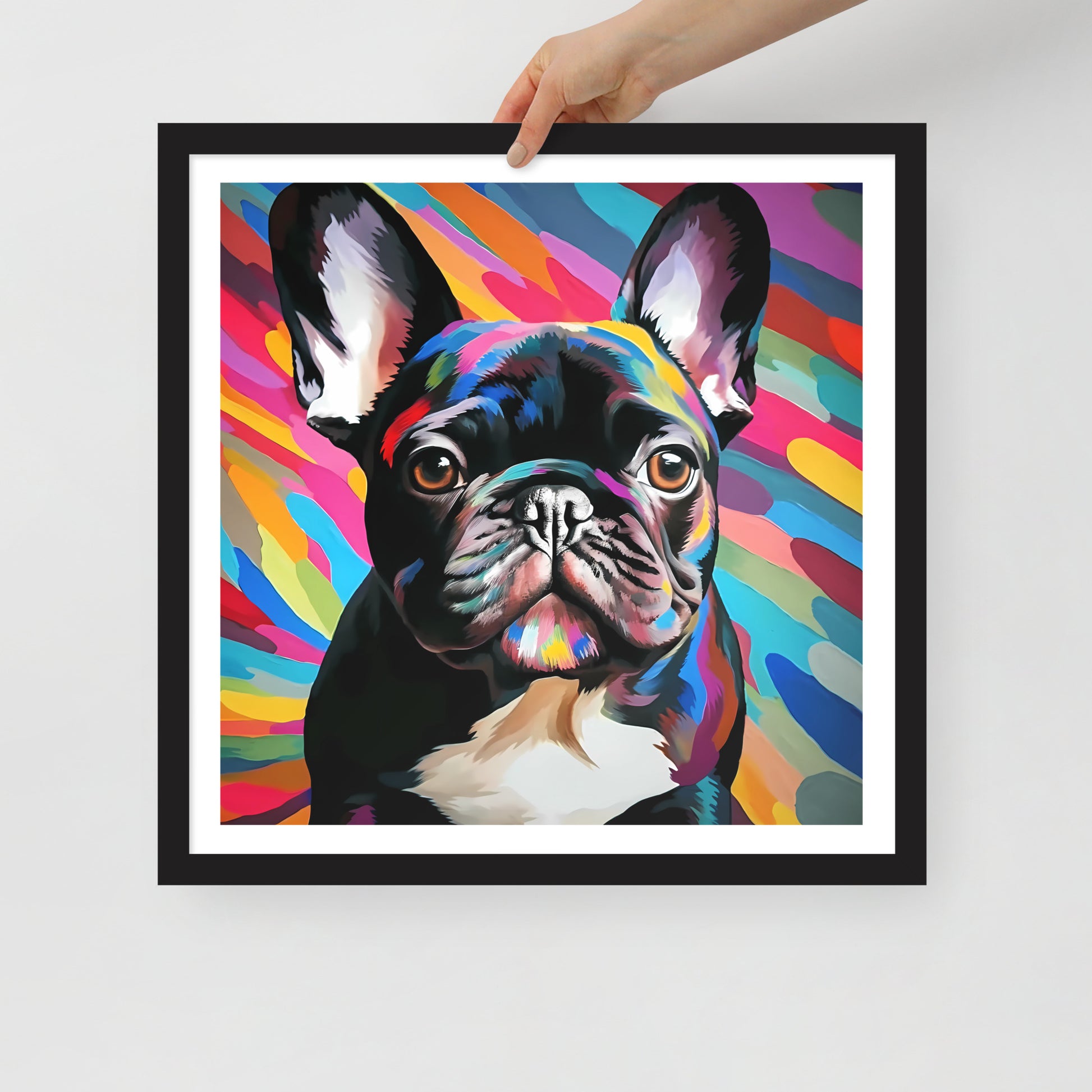 The detailed portrait of the Frenchie's features stands out amidst the riot of color, with each brushstroke contributing to a visual feast that captures both the imagination and the heart. This artwork isn't just a statement piece; it's a conversation starter, a joyous celebration of the unique personality and appearance of the French Bulldog breed.