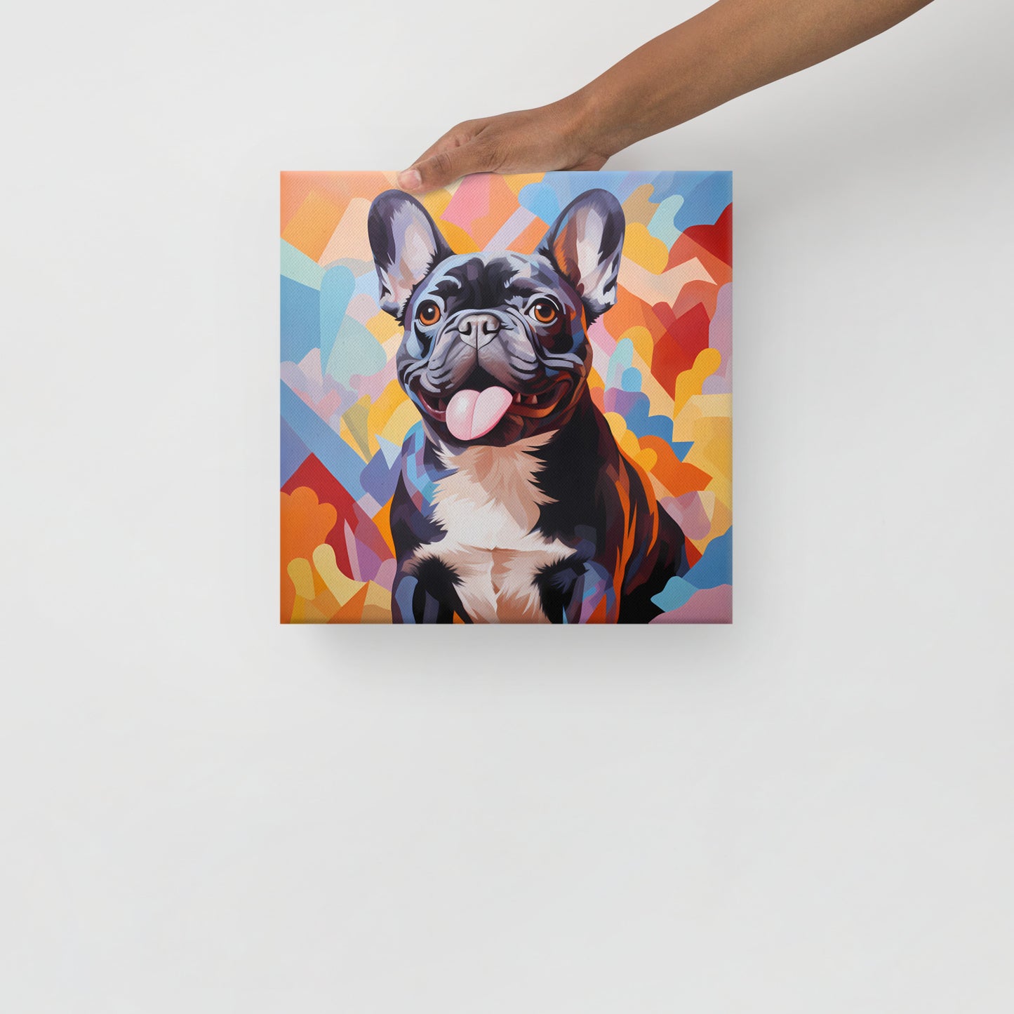 Discover "Canine Carnival," a canvas print that celebrates the playful and loving nature of the brindle French Bulldog through a vibrant display of abstract shapes and vivid colors. This piece captures the essence of the Frenchie's brindle coat, portrayed in a mosaic of bold, joyful hues that reflect the breed's spirited personality. The dynamic background features an array of colorful forms that evoke the excitement and fun of a carnival, creating a lively atmosphere that complements the Frenchie's cheerful demeanor.