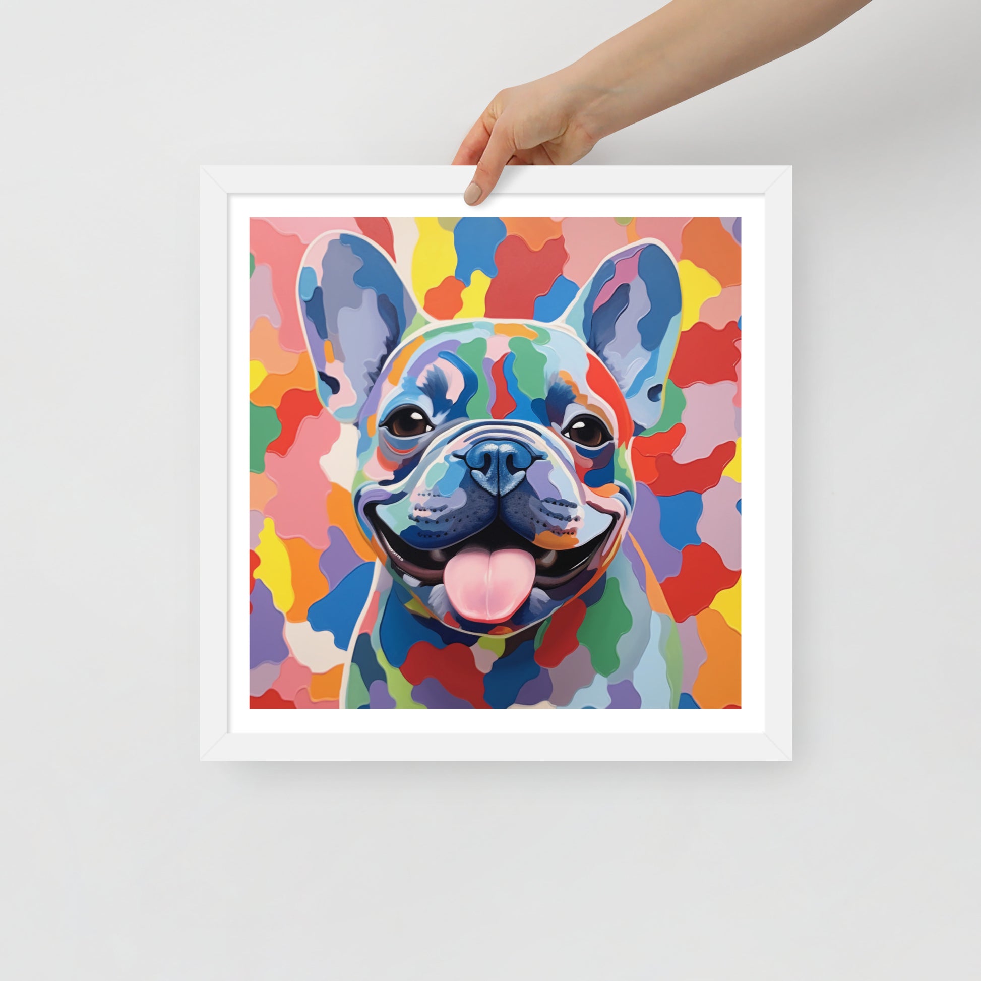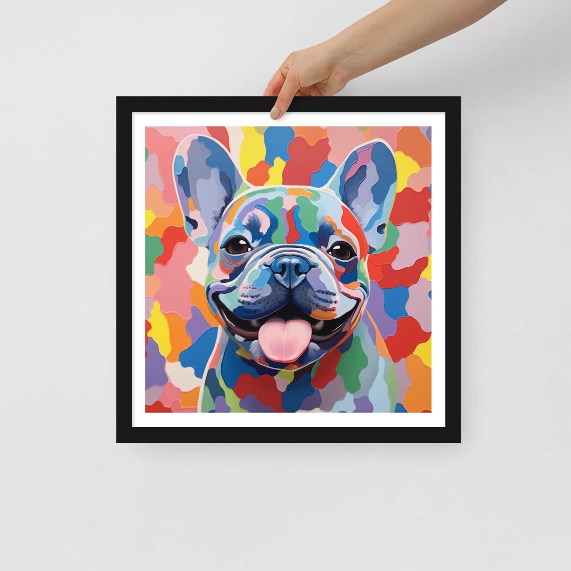 "Canine Colorplay" brings a splash of jubilance into your space with the charming depiction of a Blue French Bulldog, each stroke and splash of color celebrating the breed's joyful spirit. This framed poster is a masterful display of abstract artistry, where the playful energy of the beloved Blue Frenchie is immortalized in a vibrant tapestry of multicolored shapes that dance around the canvas.