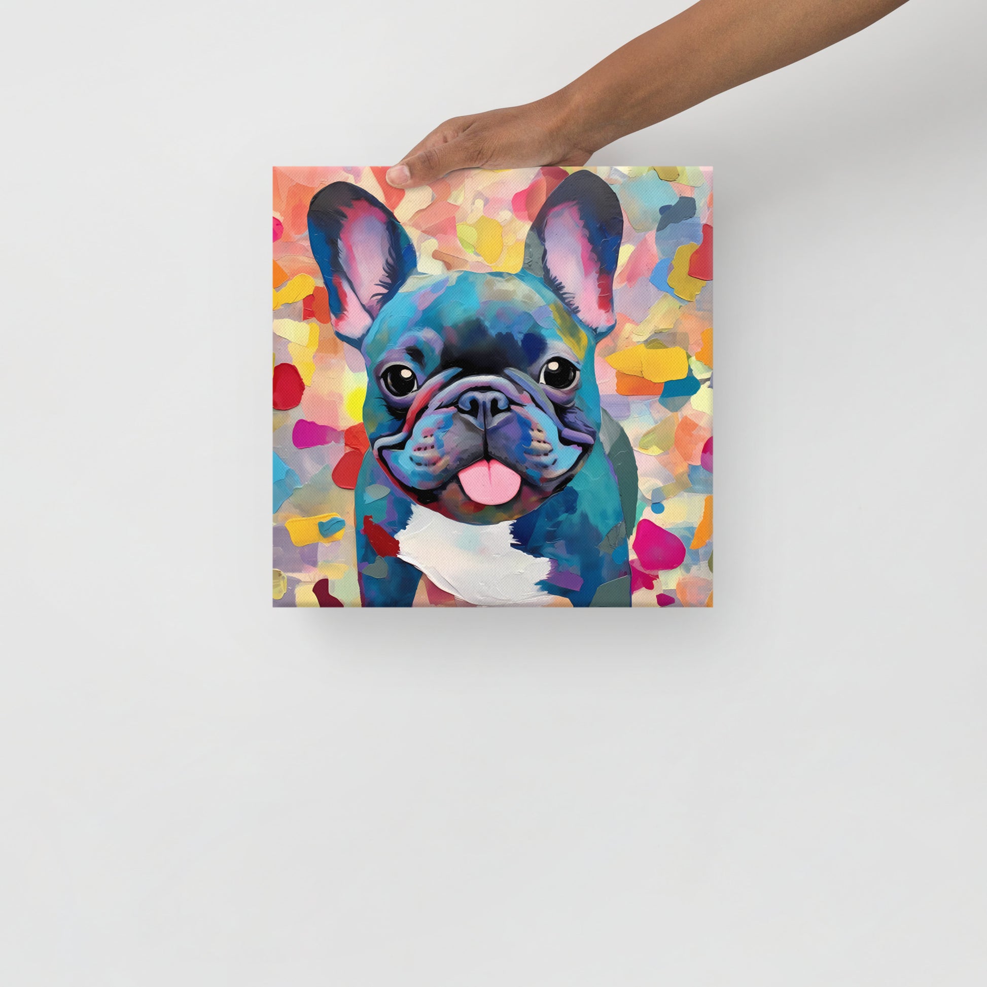 "Cerulean Confetti" is a canvas print that lovingly portrays a blue French Bulldog amidst a playful shower of colorful confetti-like shapes. The artwork beautifully captures the spirited essence of the Frenchie, its blue coat portrayed in a spectrum of harmonious shades that seem to dance and mingle with the abstract forms in the background. It's a visual celebration of the breed's cheerful and loving nature, with each color and shape enhancing the Frenchie's charming character.