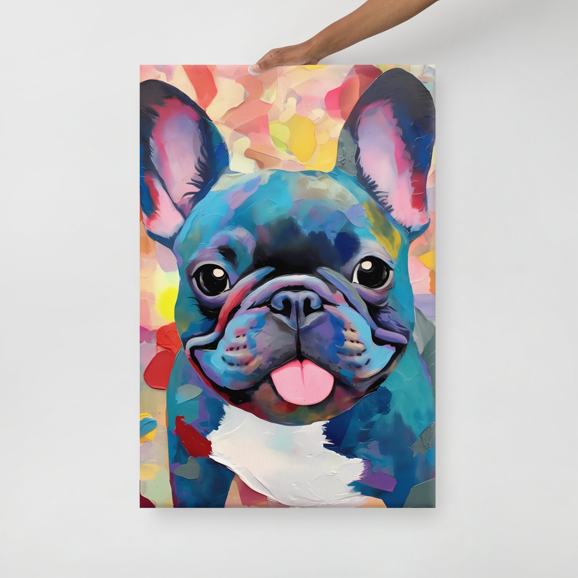 The canvas print is an artistic rendition that brings the blue Frenchie's joyful personality to life, turning it into a modern masterpiece. The piece radiates happiness and the warm, loving companionship associated with these adorable companions. The multitude of colors represents the Frenchie's multifaceted personality, from playful and affectionate to loyal and alert.