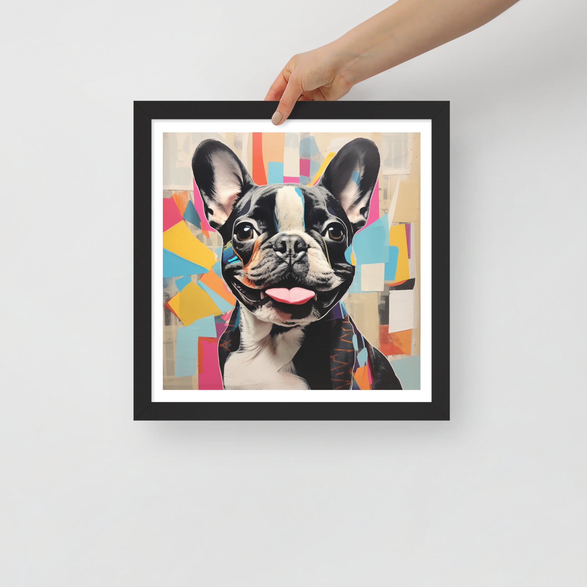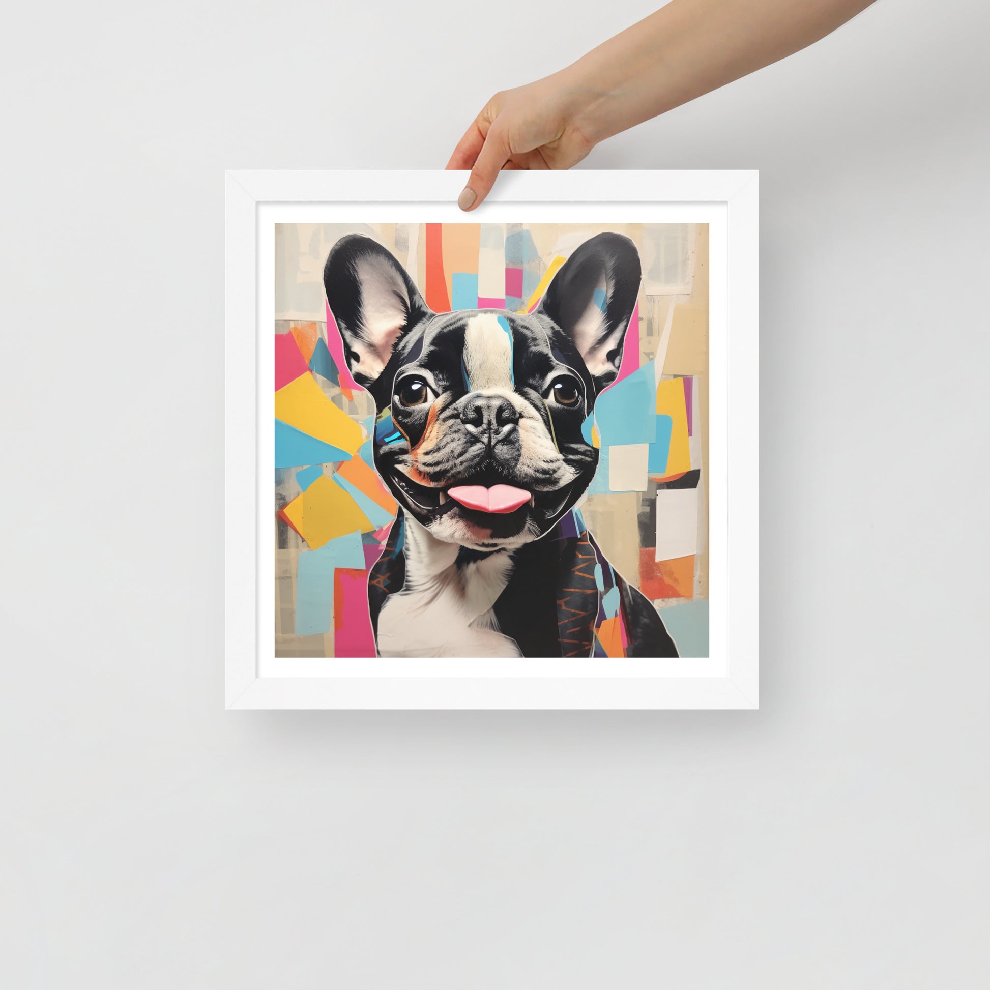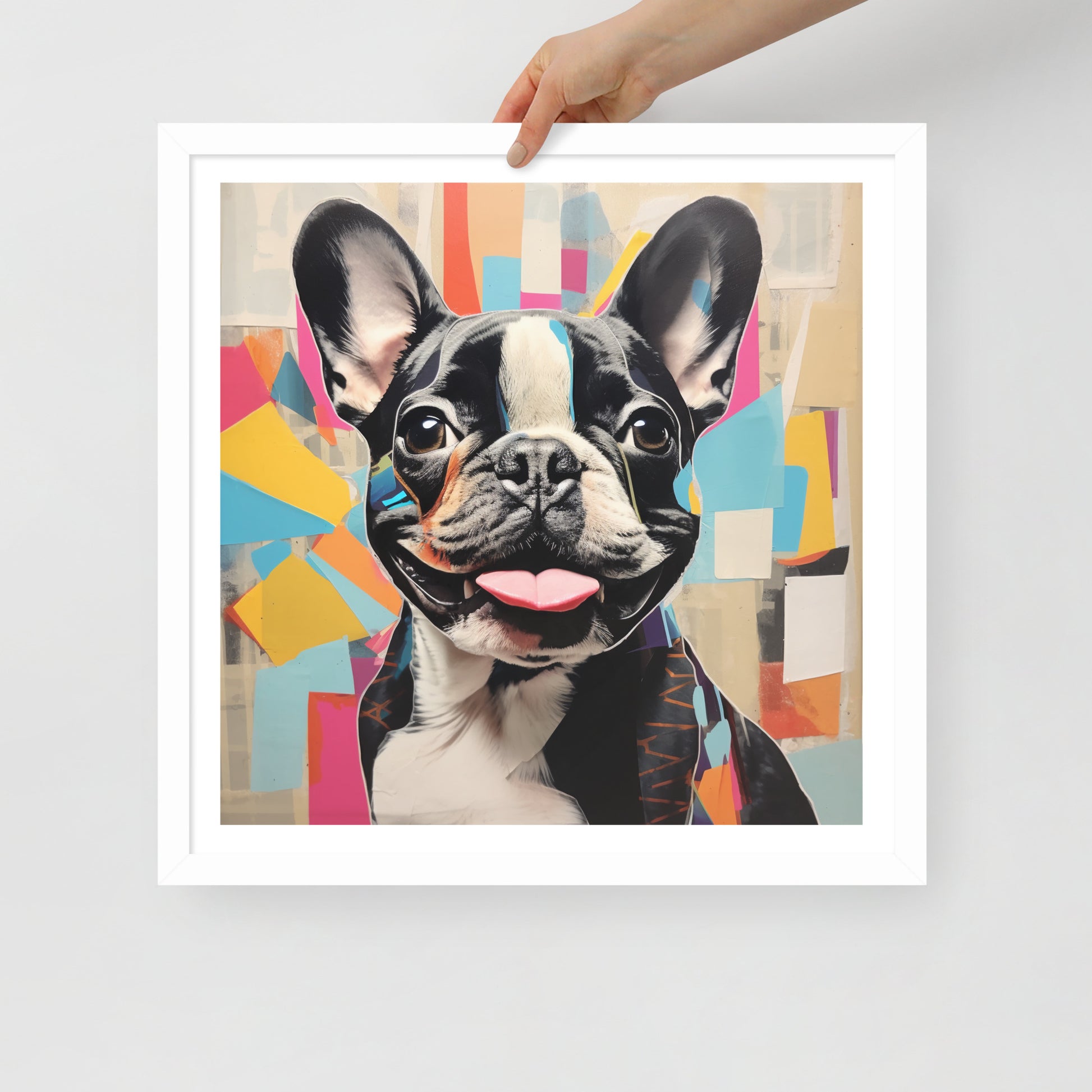 "Collage Canine" is a celebration of modern art meets the charm of a pied French Bulldog. This framed artwork is a playful tapestry of abstract shapes and vibrant colors, with the pied Frenchie's striking black and white coat punctuating the composition. The cheerful expression and the tongue-out pose of this beloved breed are central to the artwork, making it a joyful addition to any space.