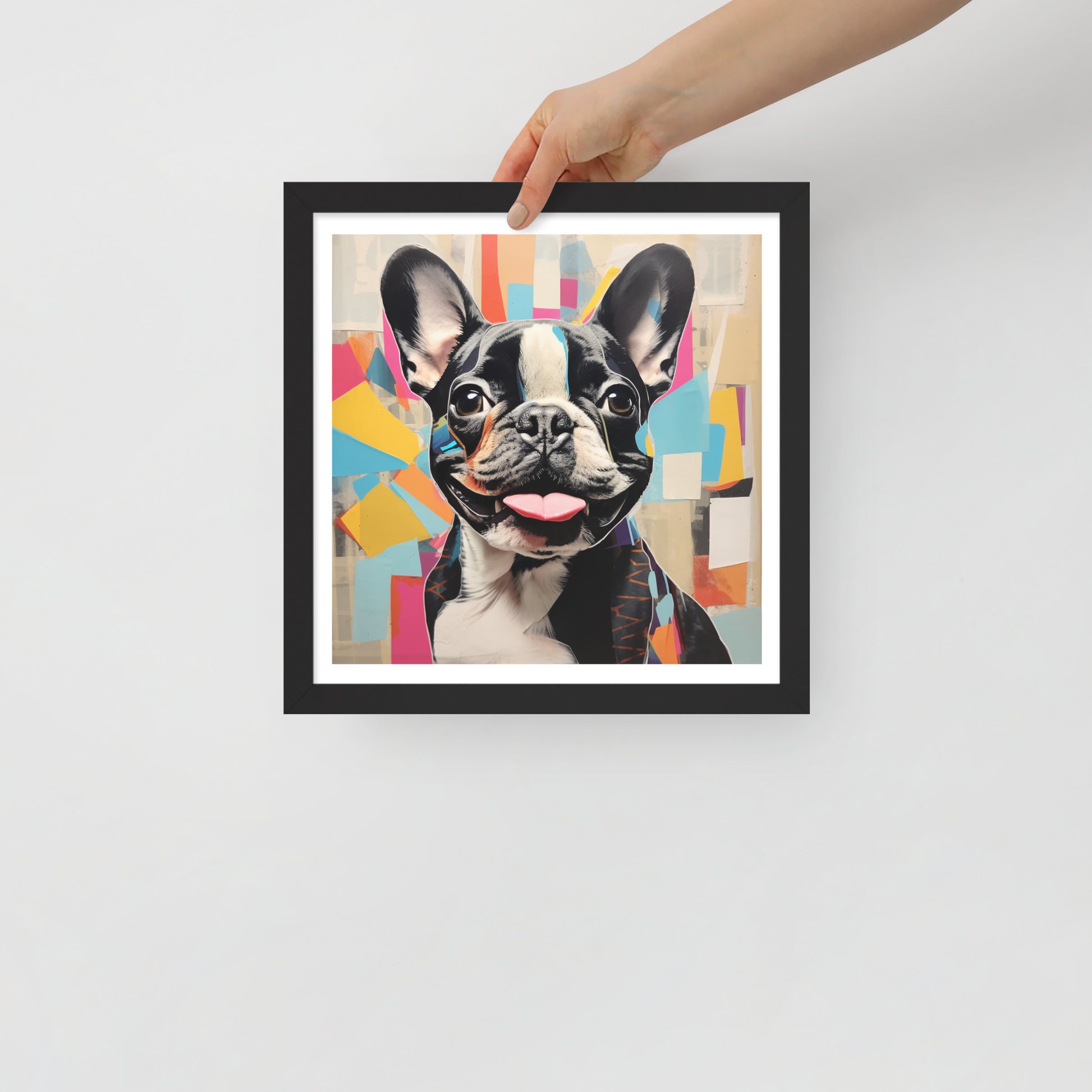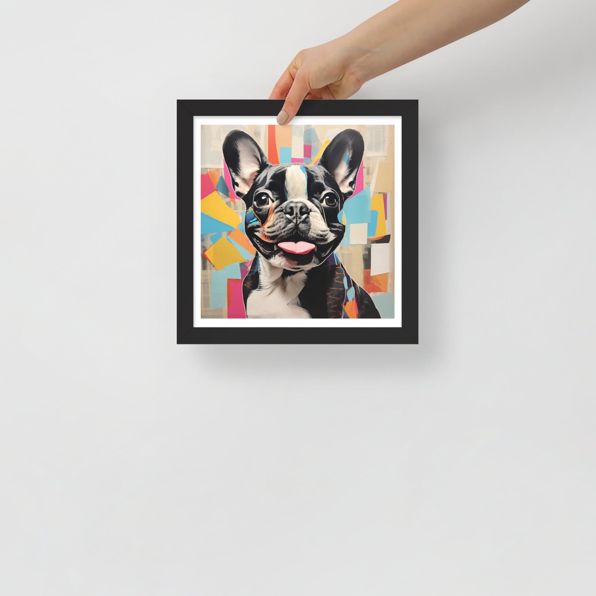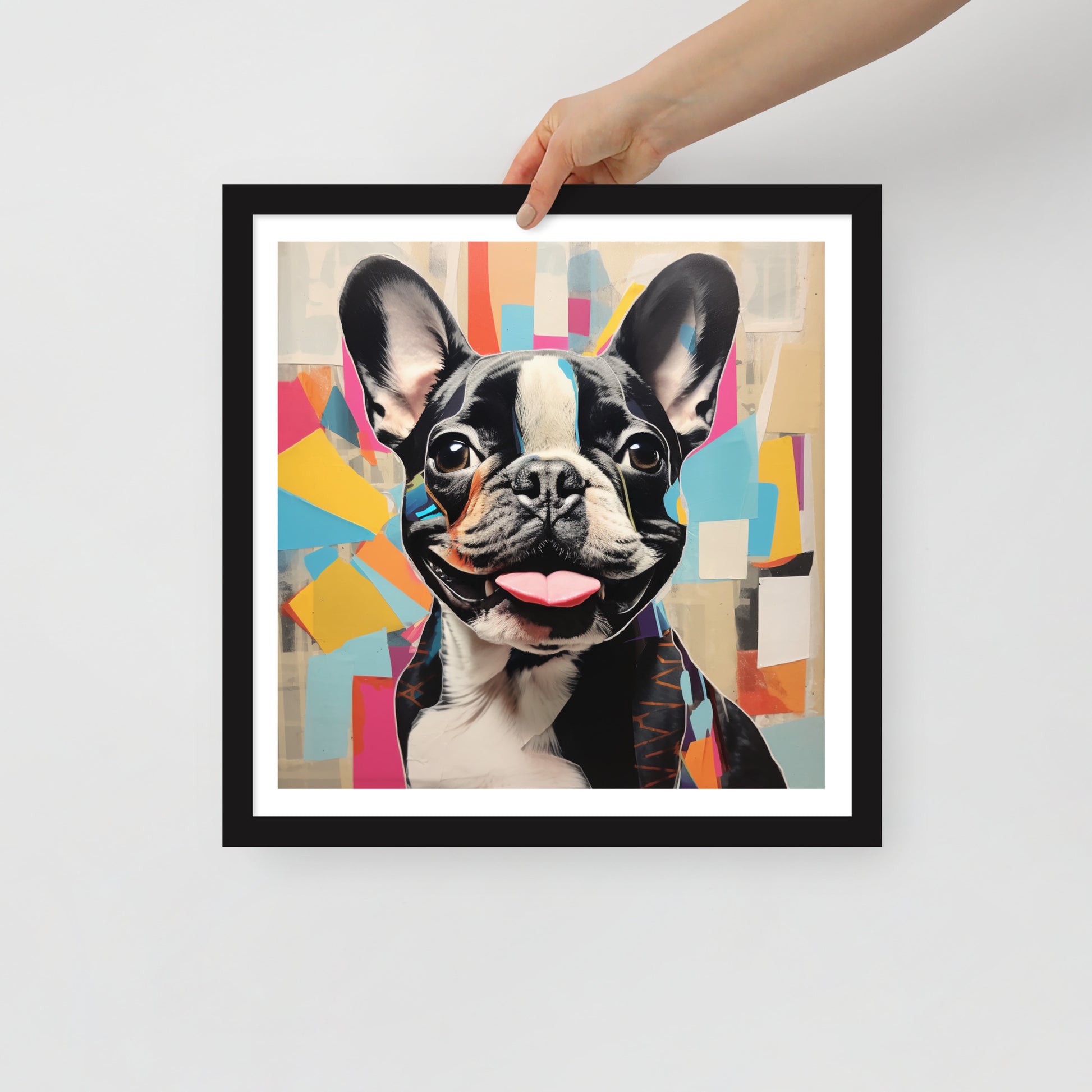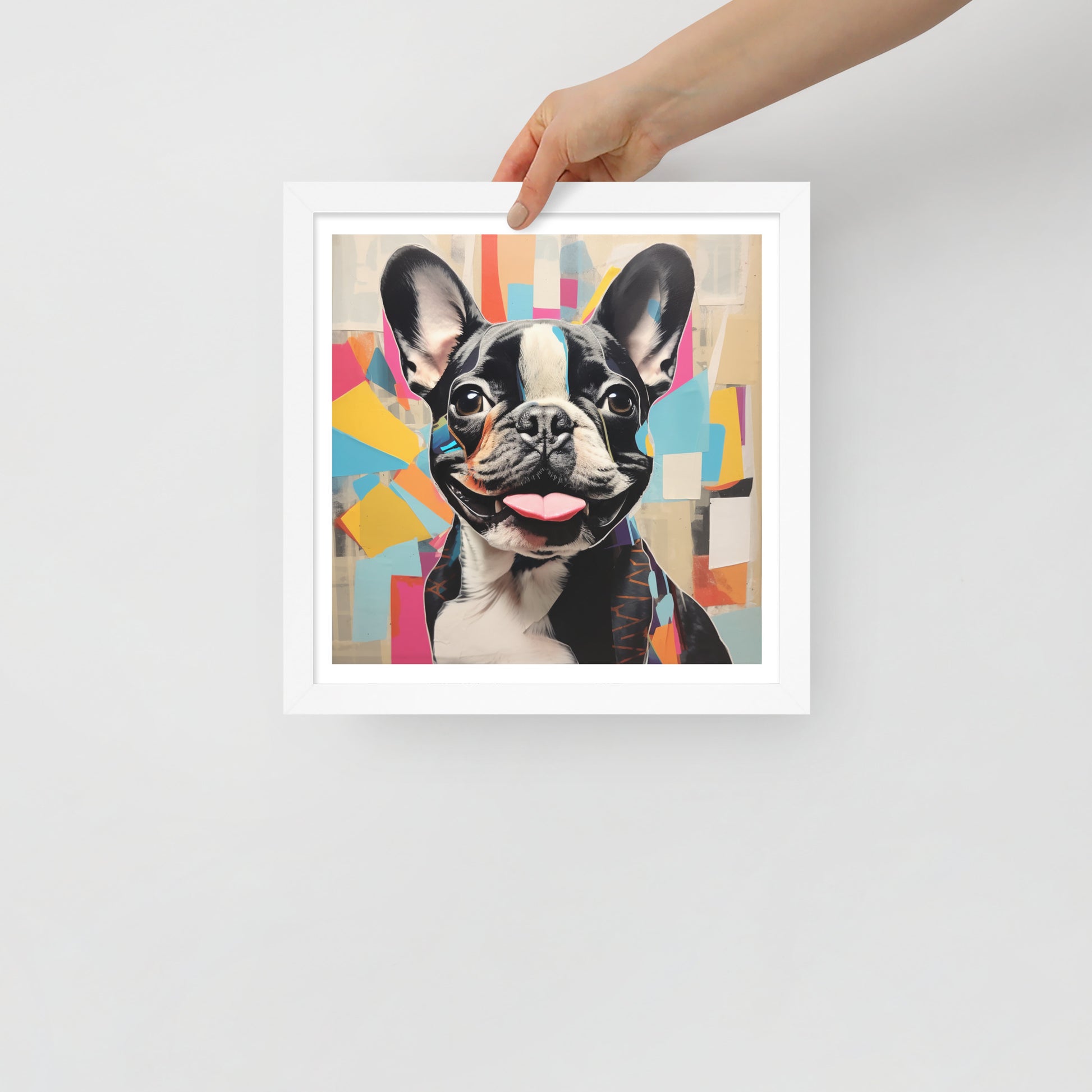 "Collage Canine" is a celebration of modern art meets the charm of a pied French Bulldog. This framed artwork is a playful tapestry of abstract shapes and vibrant colors, with the pied Frenchie's striking black and white coat punctuating the composition. The cheerful expression and the tongue-out pose of this beloved breed are central to the artwork, making it a joyful addition to any space.