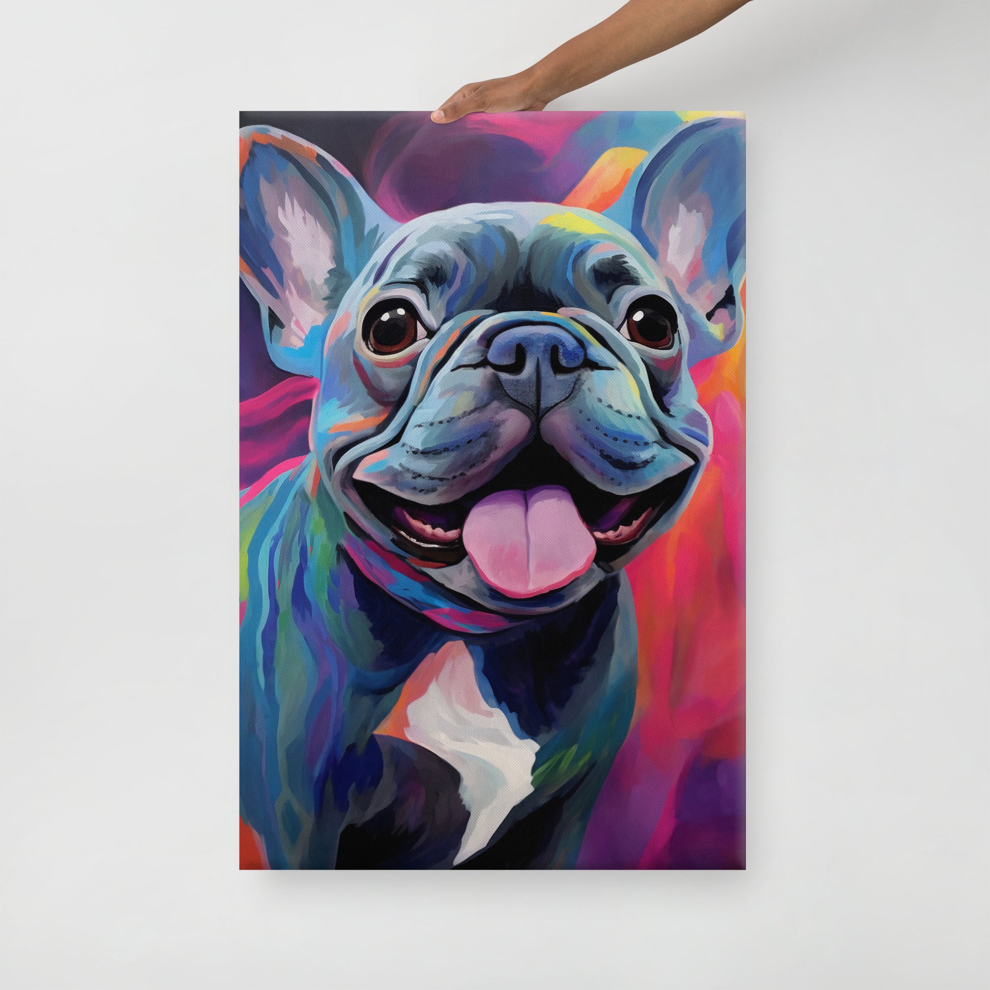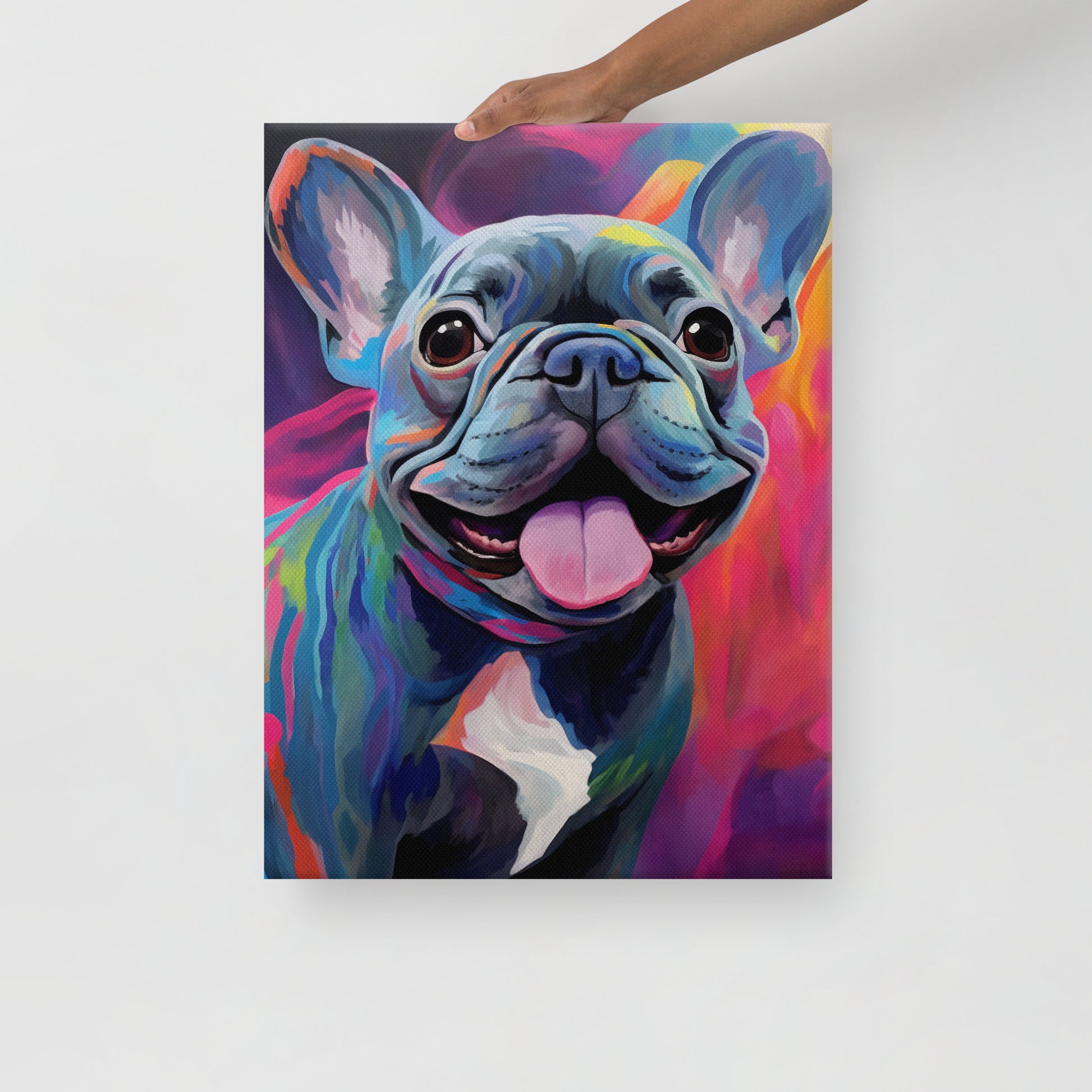 Step into the radiant world of "Essence of Euphoria," a canvas print that captures the exuberance of a blue French Bulldog enveloped in a vibrant, colorful aura. This artwork is a celebration of life and color, with each brushstroke contributing to a visual feast that is as infectious as the Frenchie's signature smile. The backdrop is a dynamic display of abstract hues, blending into the Frenchie's blue coat, creating an almost ethereal quality, as if the pup is part of a vivid dream.