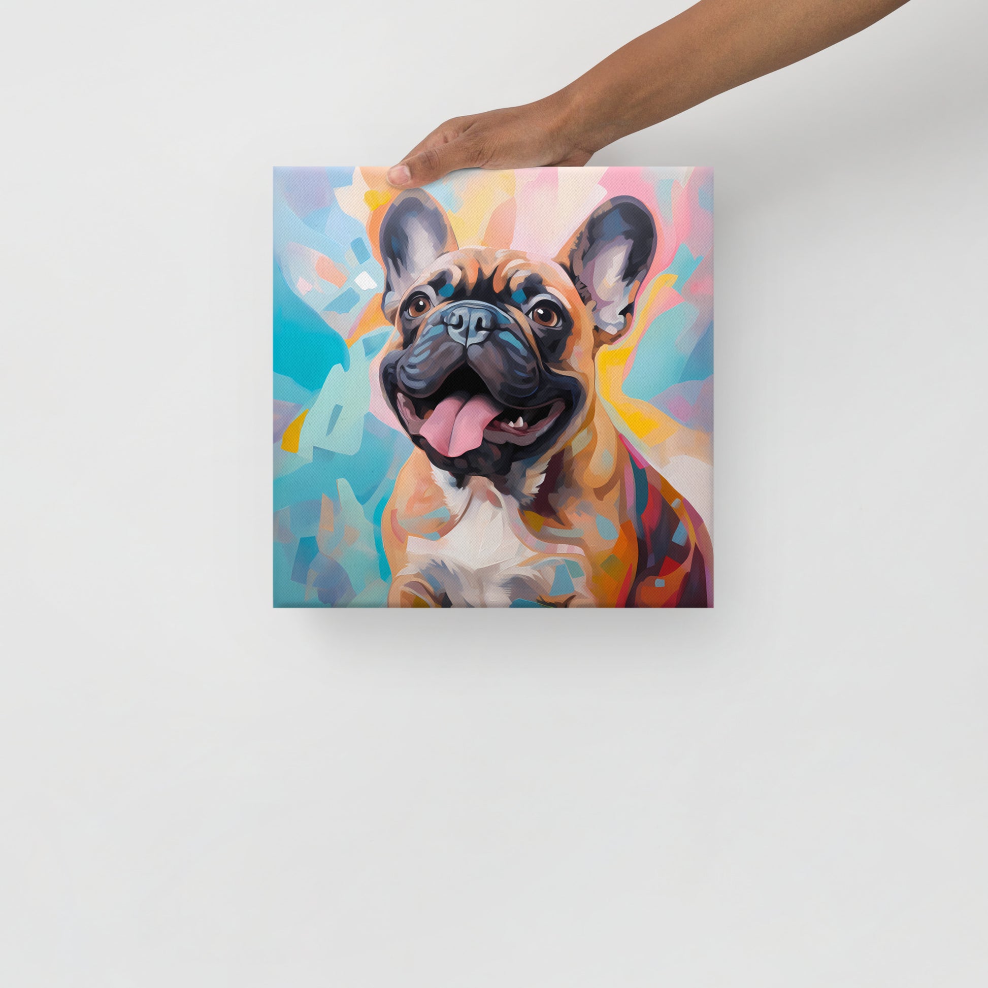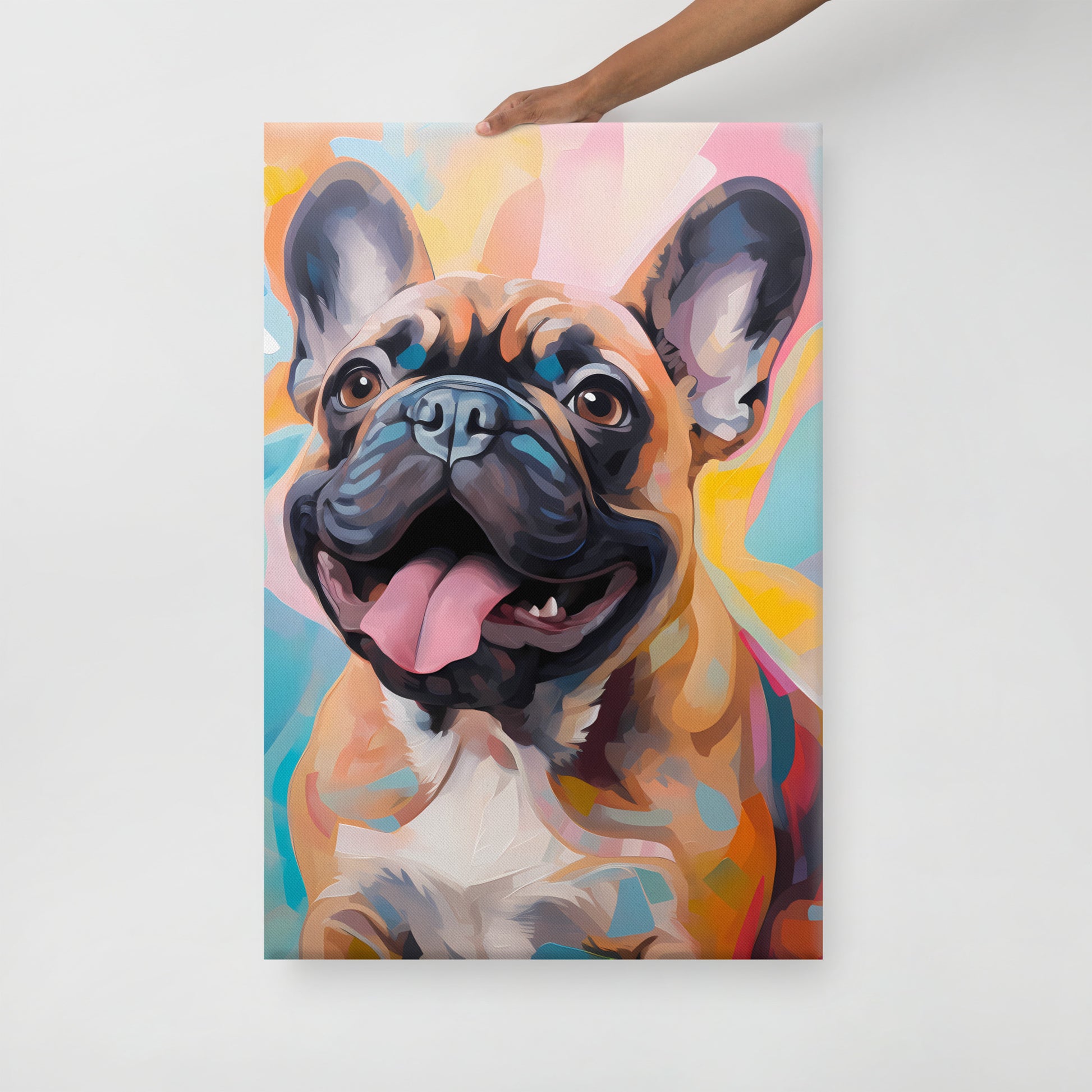 Welcome to the jubilant world of "Fawn Delight," where the warmth and playful spirit of a fawn-colored French Bulldog spring to life against a cascade of soft pastels and sharp hues. This canvas print is a celebration of the fawn Frenchie's affectionate personality, beautifully portrayed through a vibrant palette that exudes happiness and charm. The artwork's background is a dreamy blend of colors, suggesting a carefree day under a sunlit sky, perfectly complementing the pup's joyful expression.