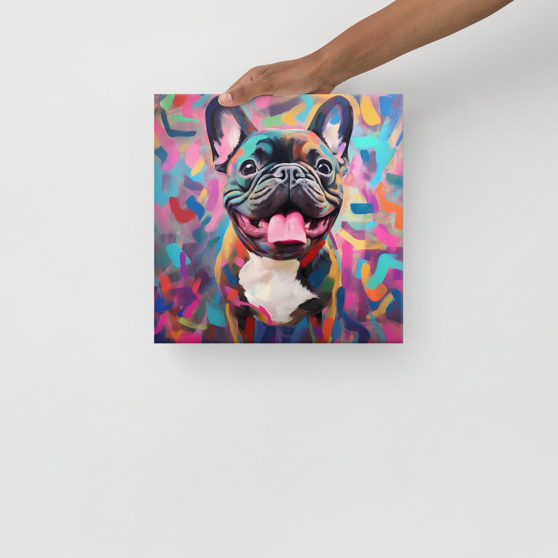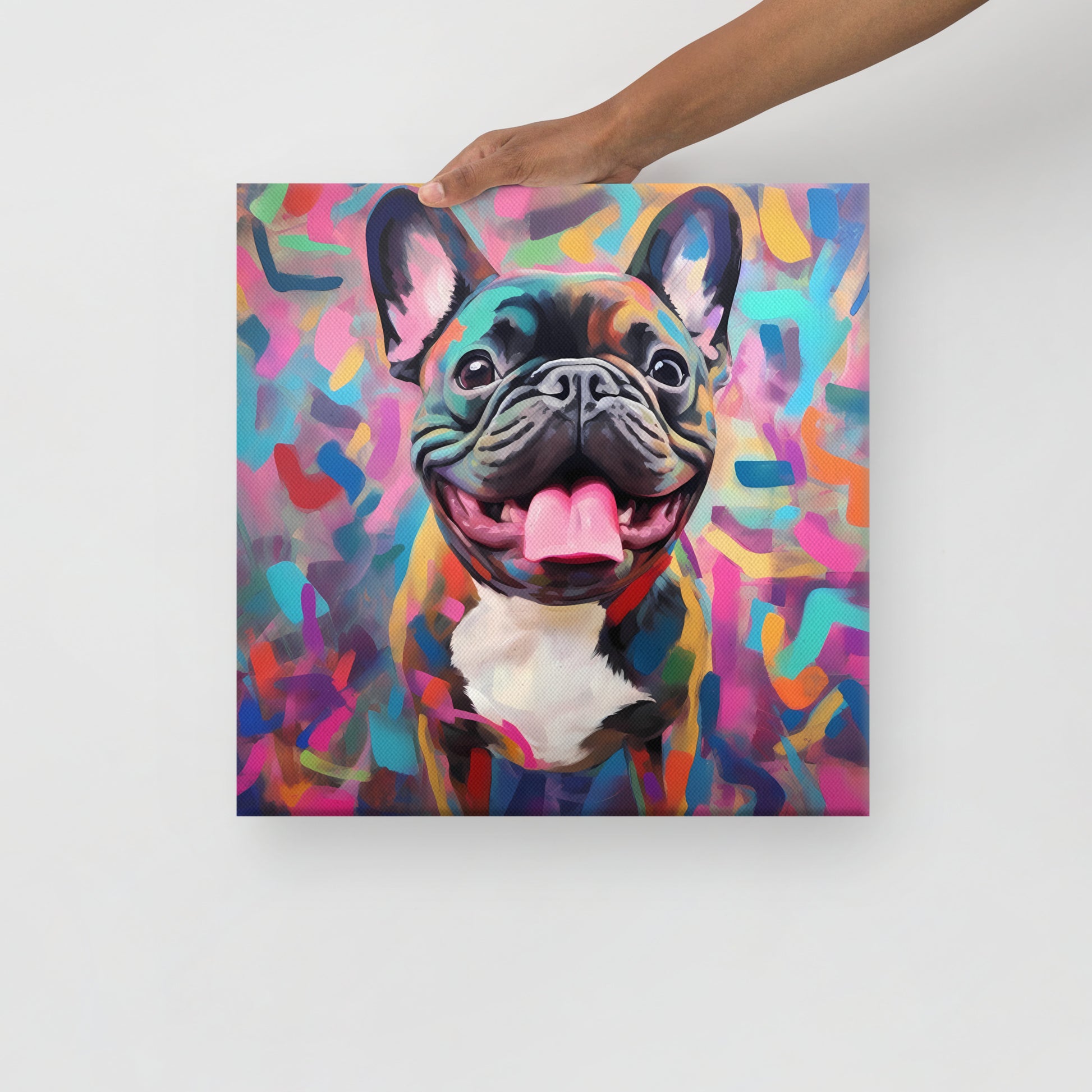 The "Fawn Fantasia" canvas print is a dynamic and heartwarming portrayal of a fawn-colored French Bulldog, whose cheerful expression and lolling tongue are the epitome of pure joy. This piece is a celebration of the breed's charming personality, captured against a canvas exploding with vibrant abstract shapes and colors. The playful composition of this artwork, with its free-form splashes and strokes, creates a sense of movement and energy that reflects the lovable and vivacious spirit of the Frenchie.