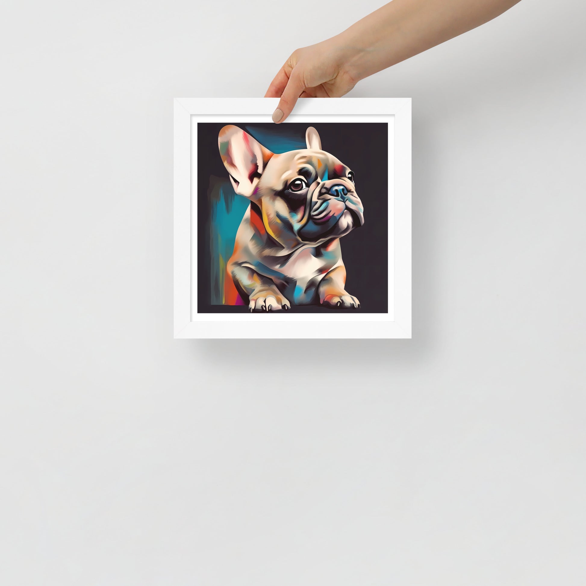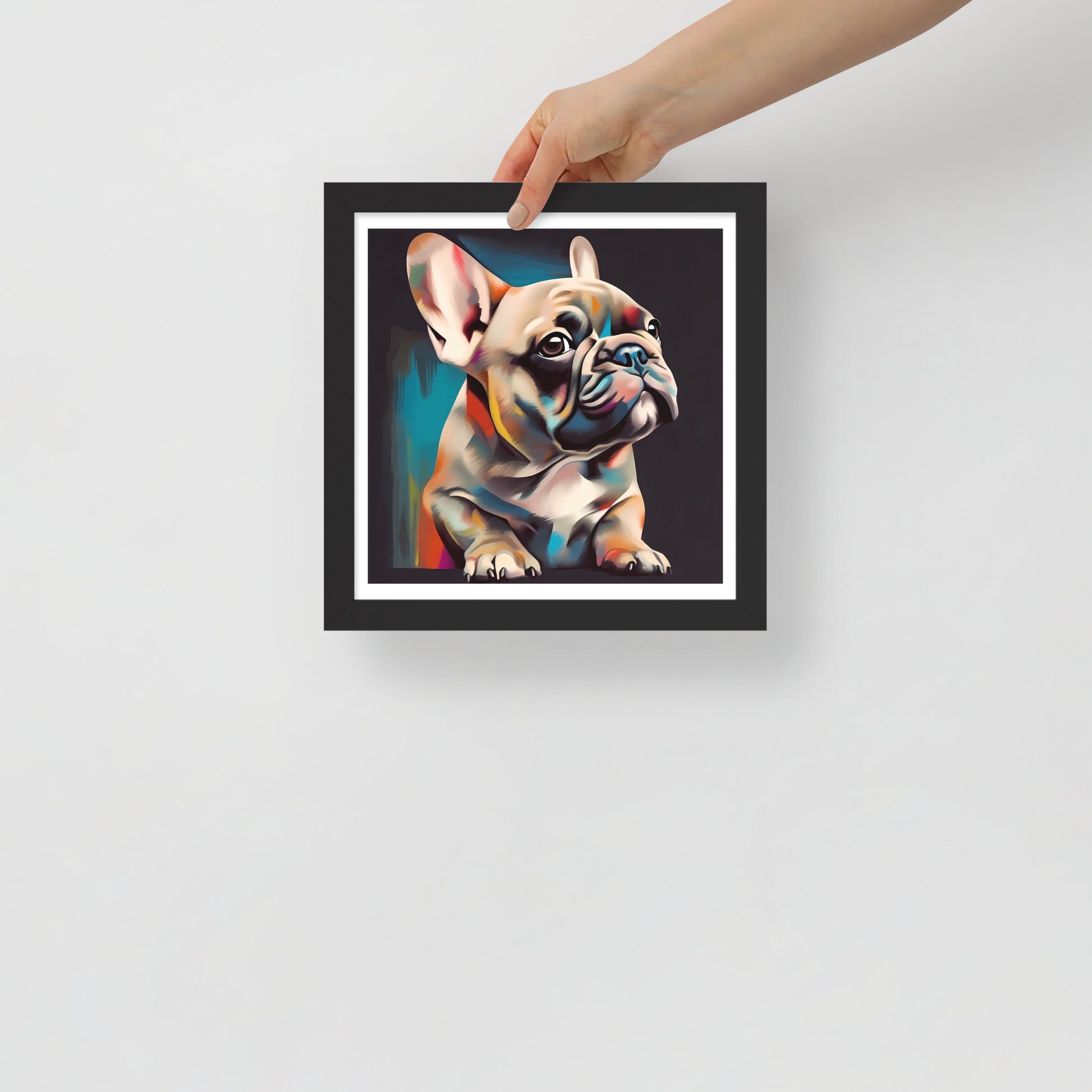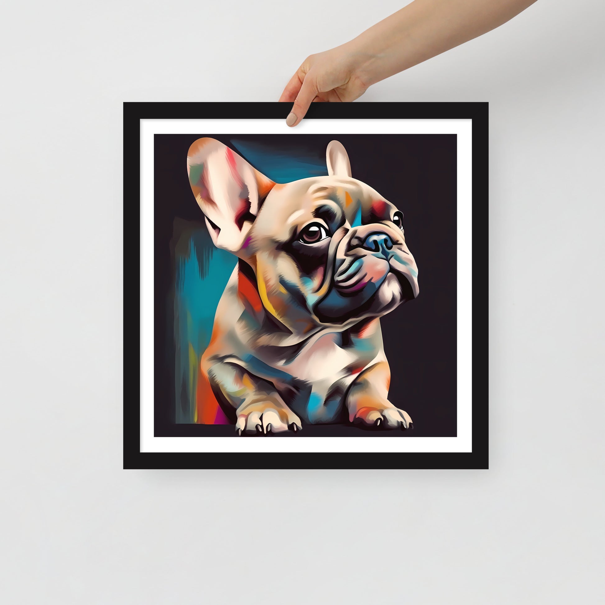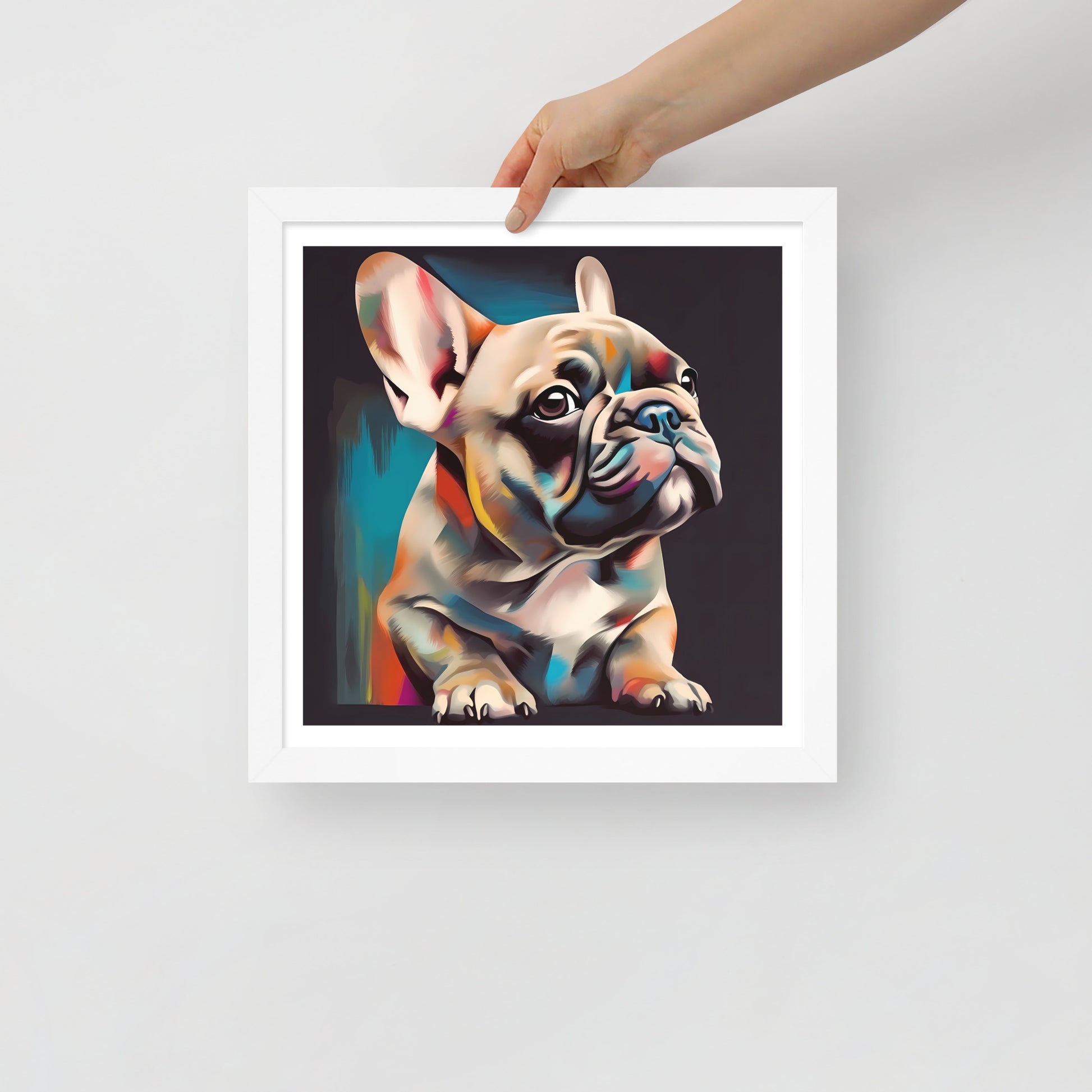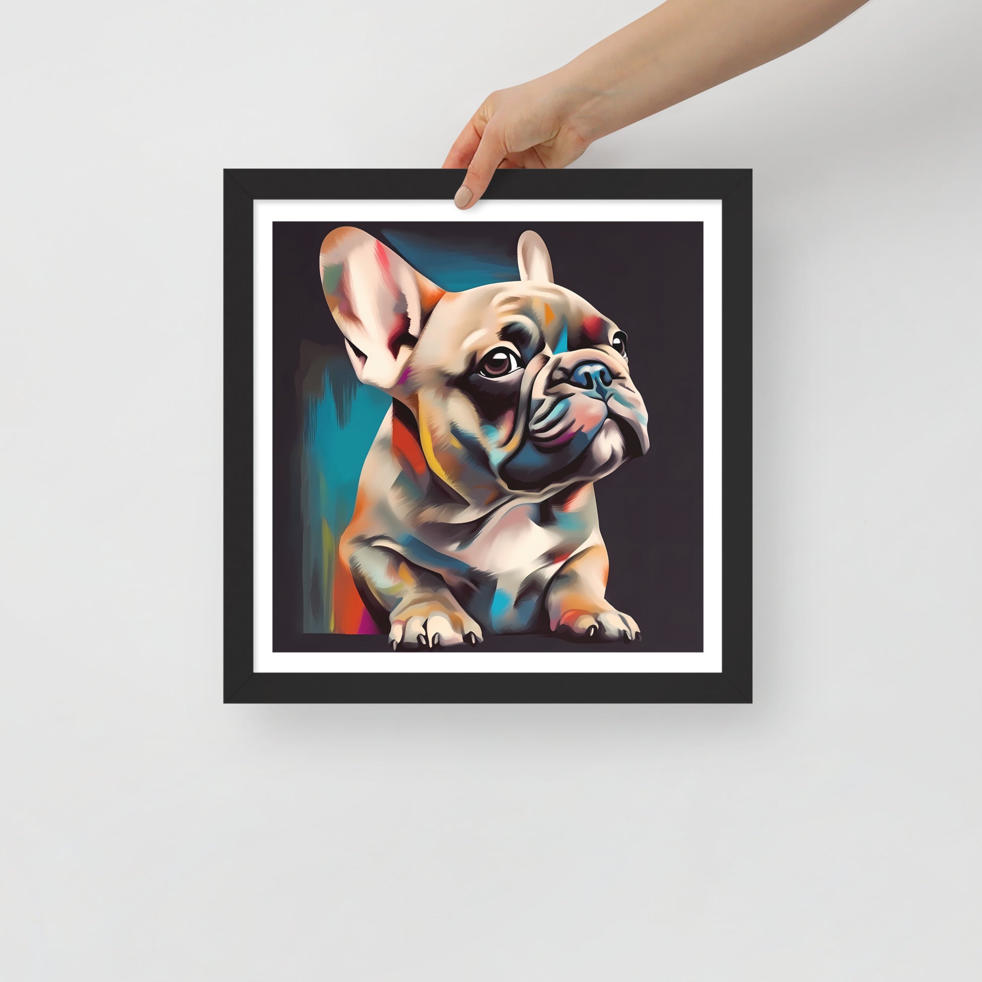 Every brushstroke on this piece is a celebration of the Frenchie's distinctive features, from the alert bat-like ears to the gentle gaze that seems to follow you with affection. The interplay of colors around the Frenchie creates a striking contrast, highlighting the creamy fawn tones against a backdrop of abstracted darkness, invoking a sense of intrigue and wonder.