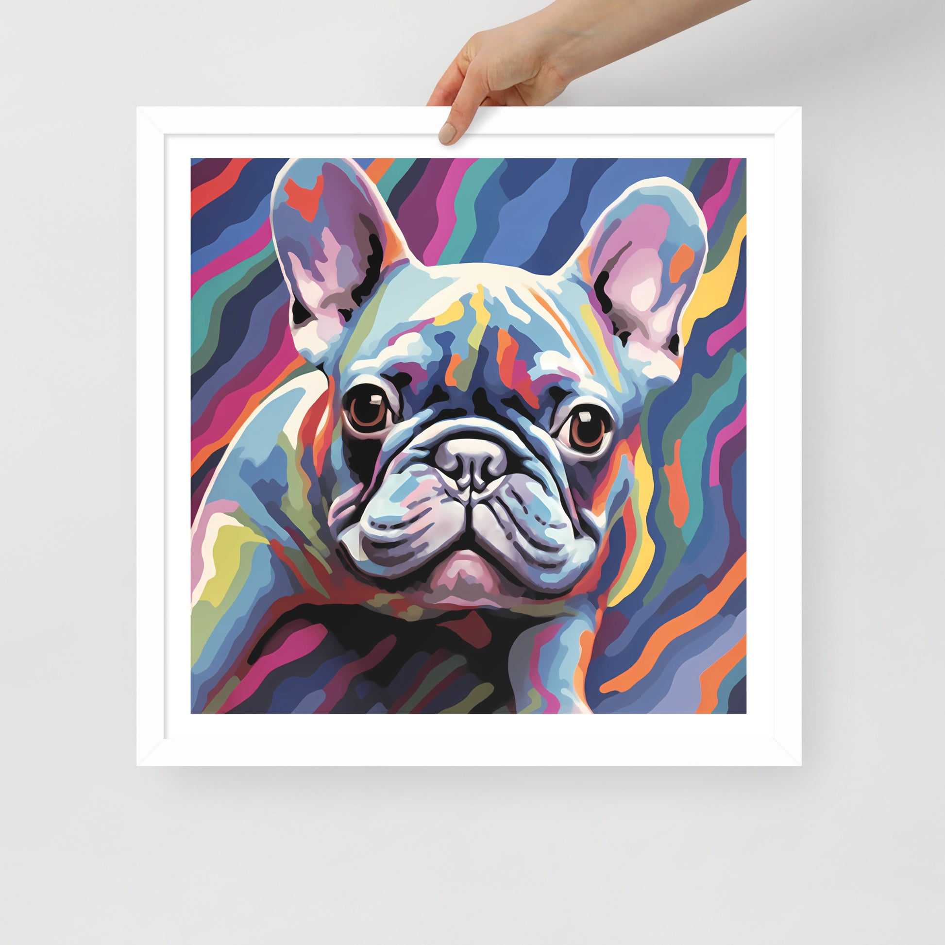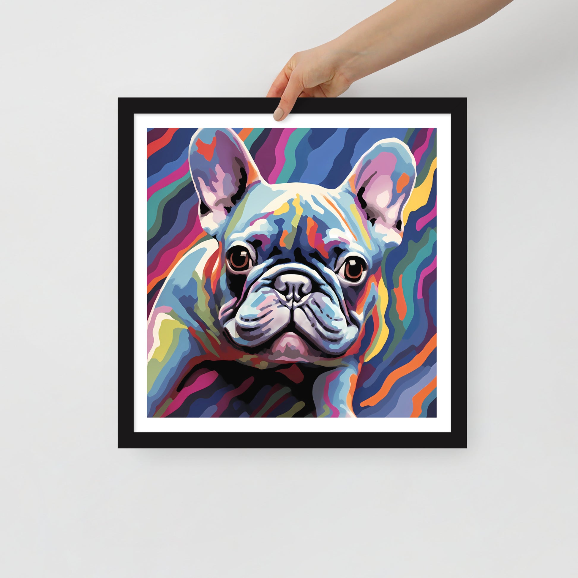 "Frenchie in Colorflow" is more than just a decorative piece; it is printed on substantial matte paper and encased in a classy matte frame made from wood harvested from renewable forests. The details attest to its quality: