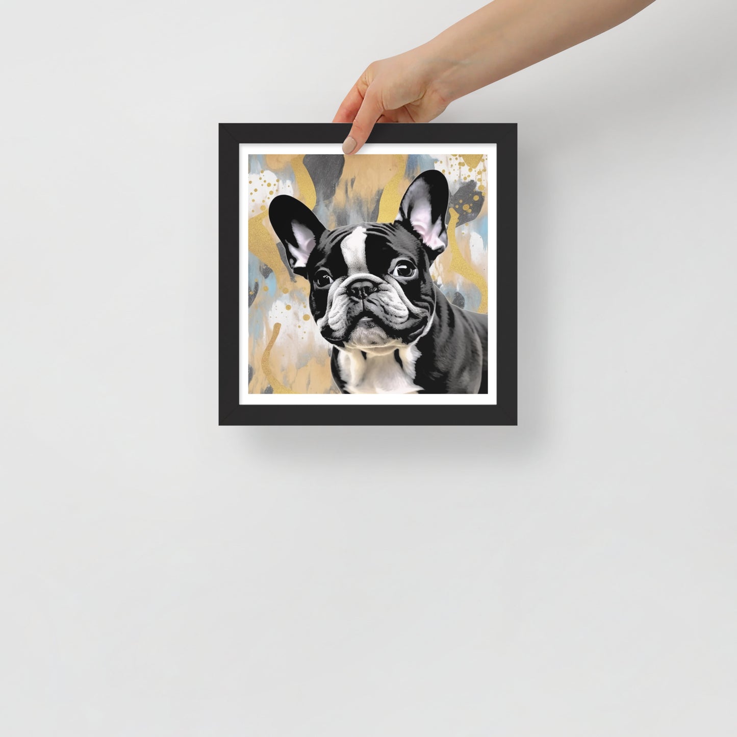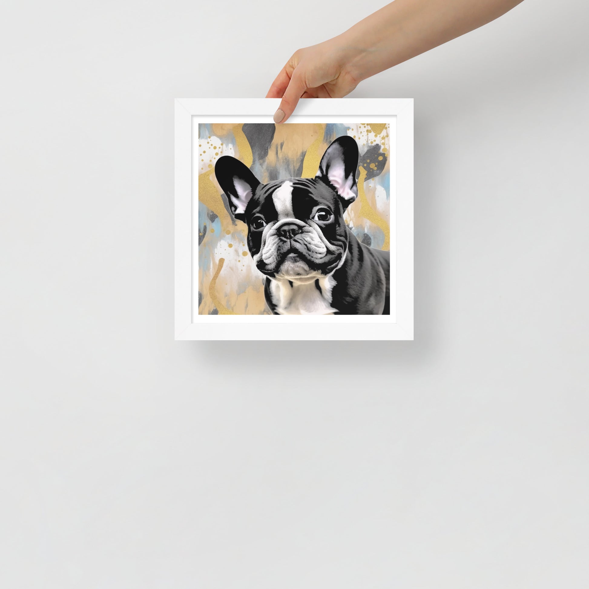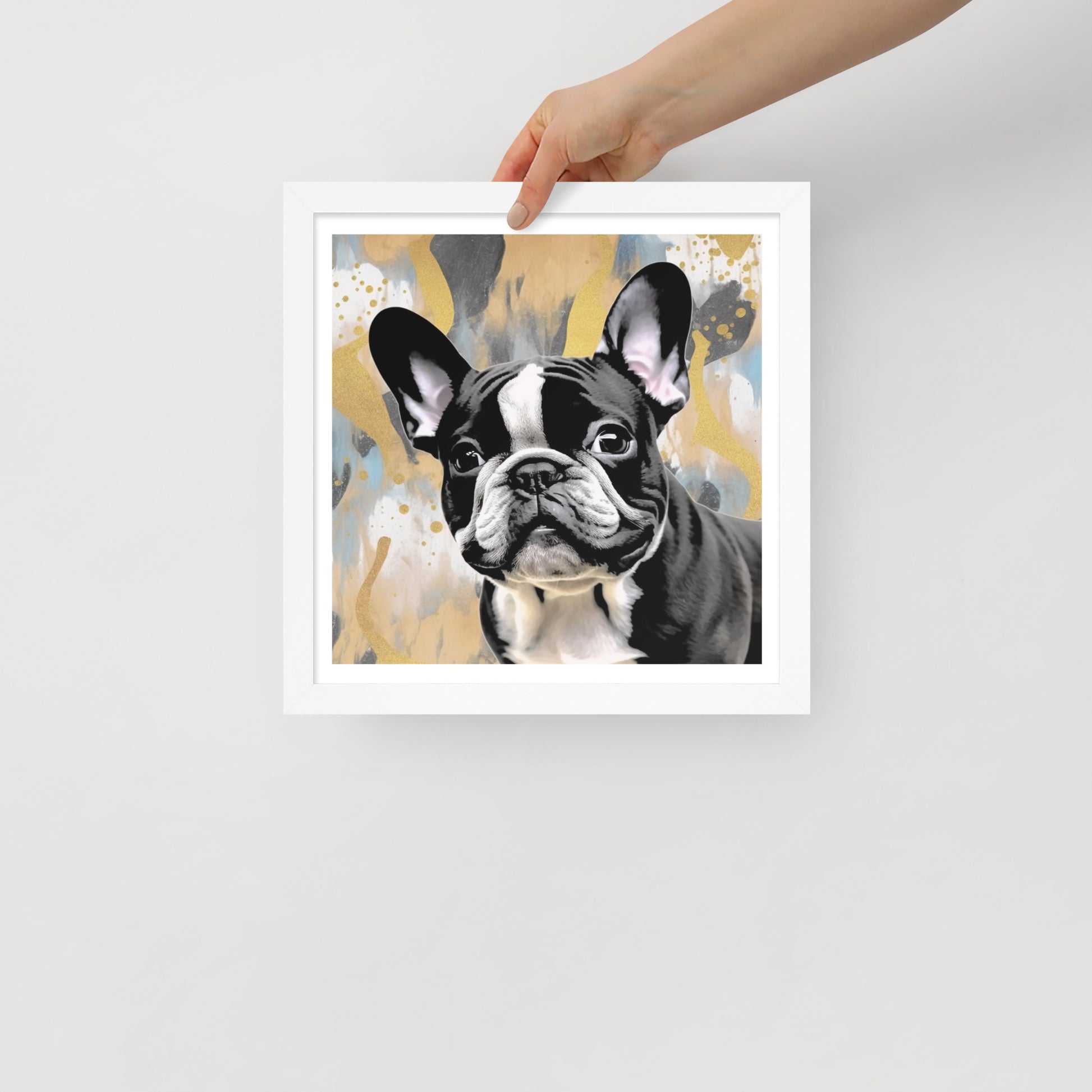 Introducing "Golden Reverie," a framed artwork that artfully captures the whimsical charm of a pied French Bulldog against a luxurious backdrop of golden hues and abstract elements. This artwork is a serene contemplation of joy and sophistication, celebrating the pied beauty's distinct coat with splashes of gold that symbolize the richness of companionship these dogs provide.