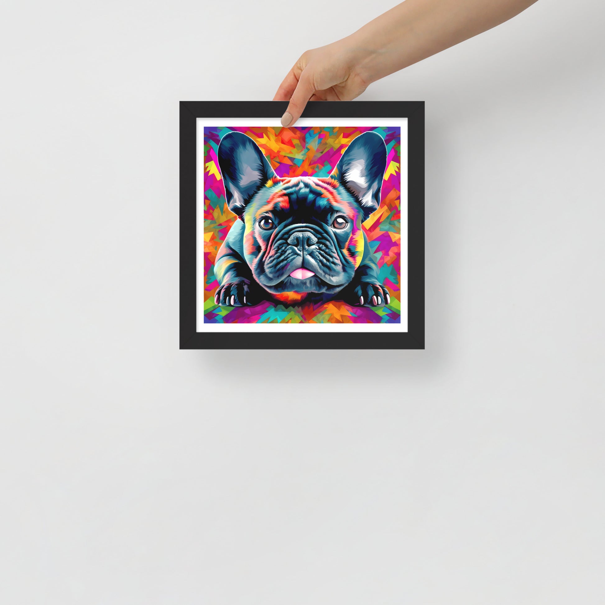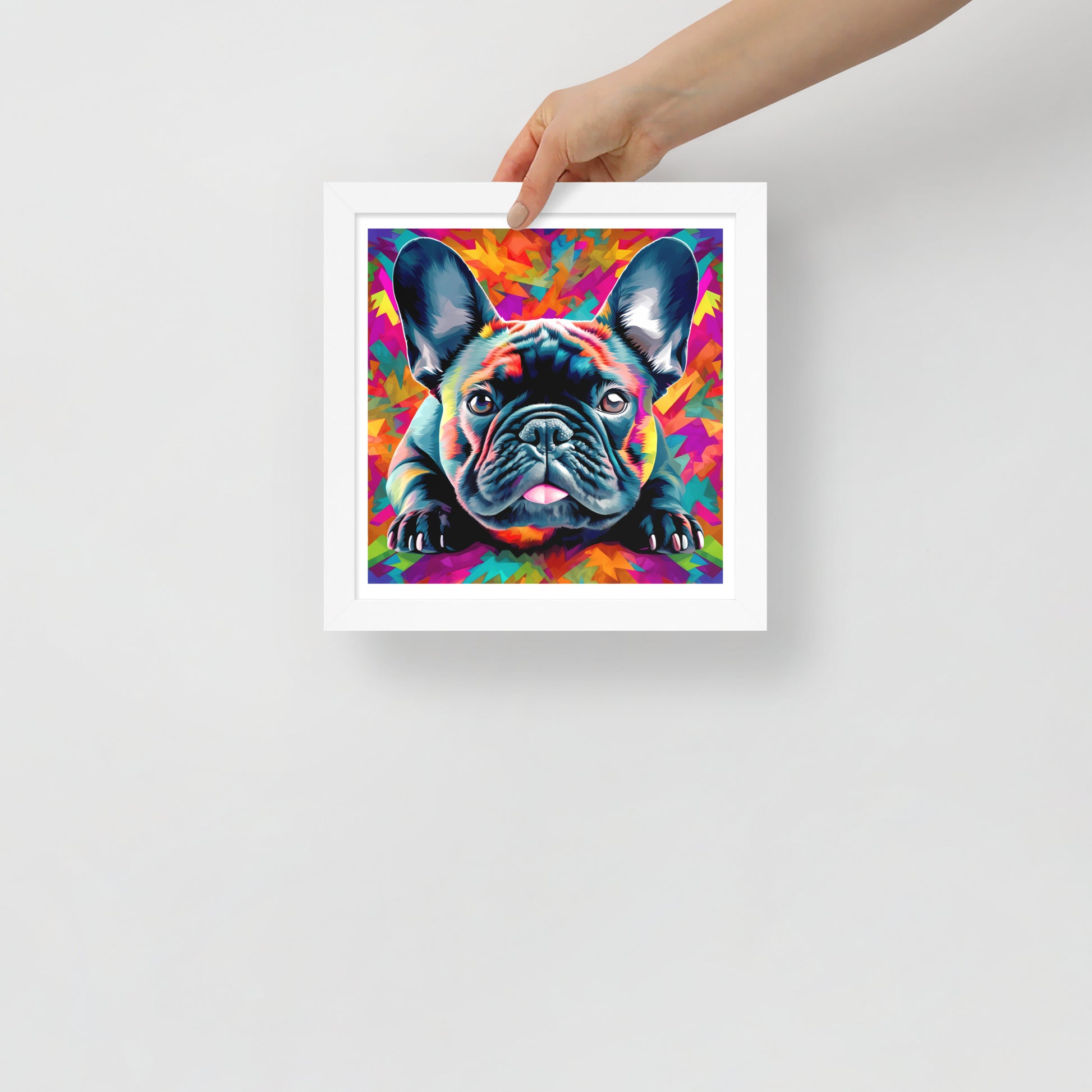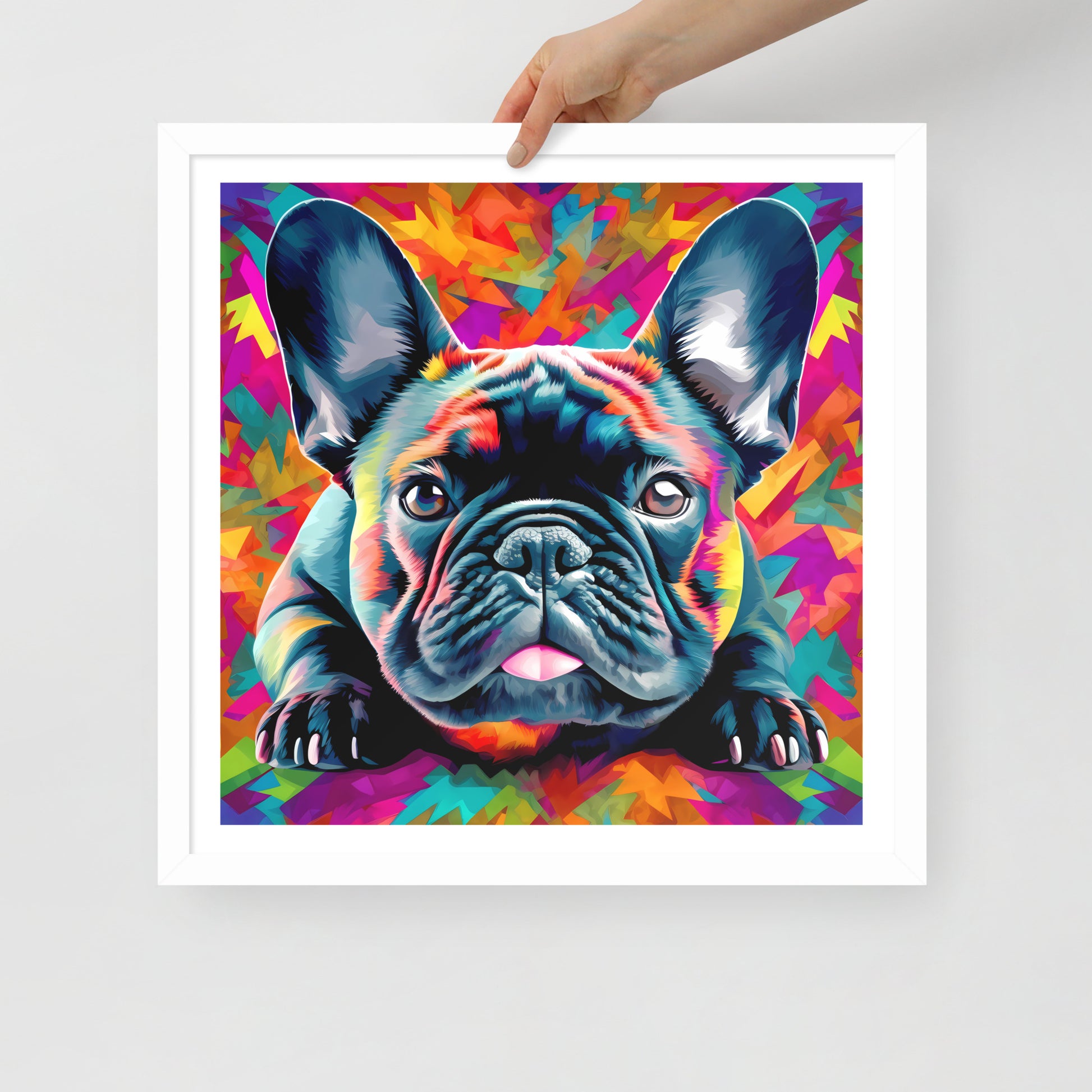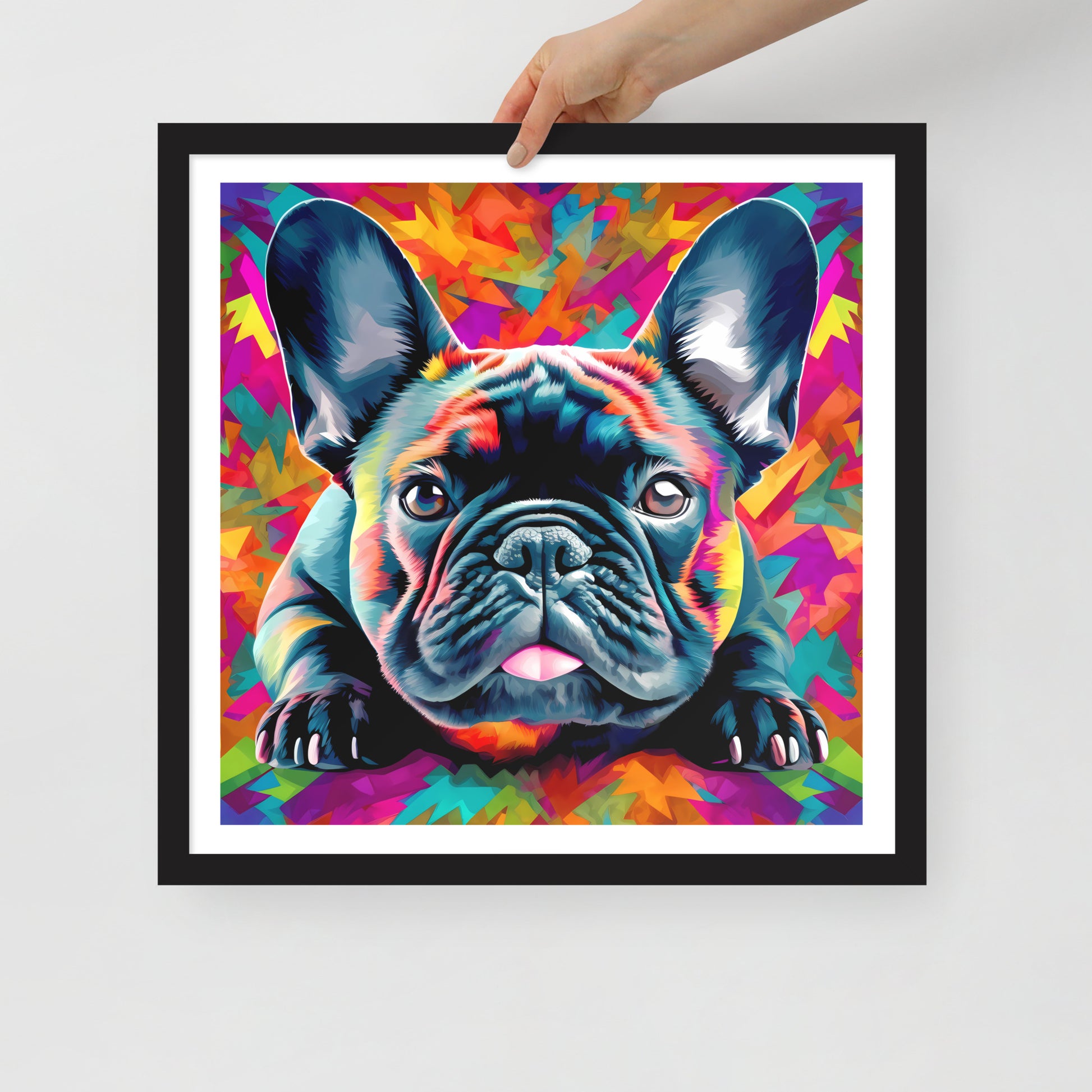 The artwork’s mosaic of vibrant colors, from the fiery oranges to the deep purples, blends seamlessly with the natural brindle patterns of the Frenchie, portraying a lively and spirited essence that the breed is known for. It's not merely a framed piece; it's a statement of joy and artistic flair that captures the imagination.