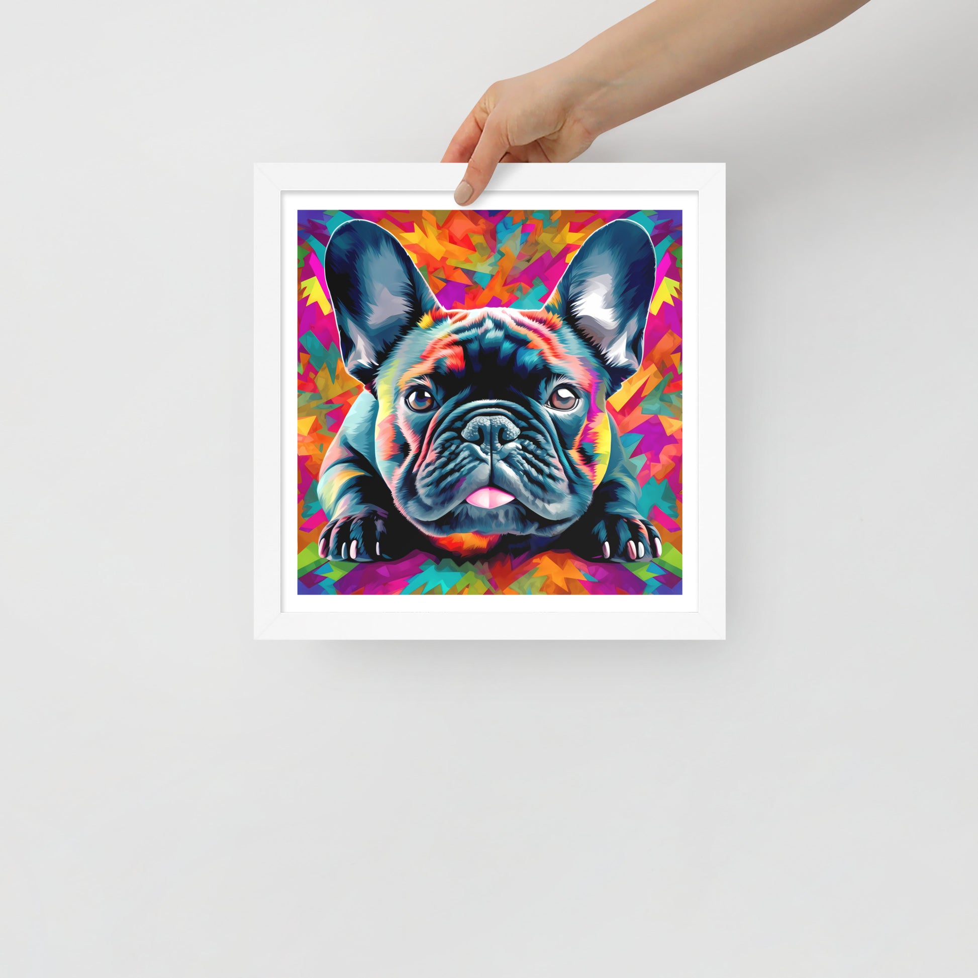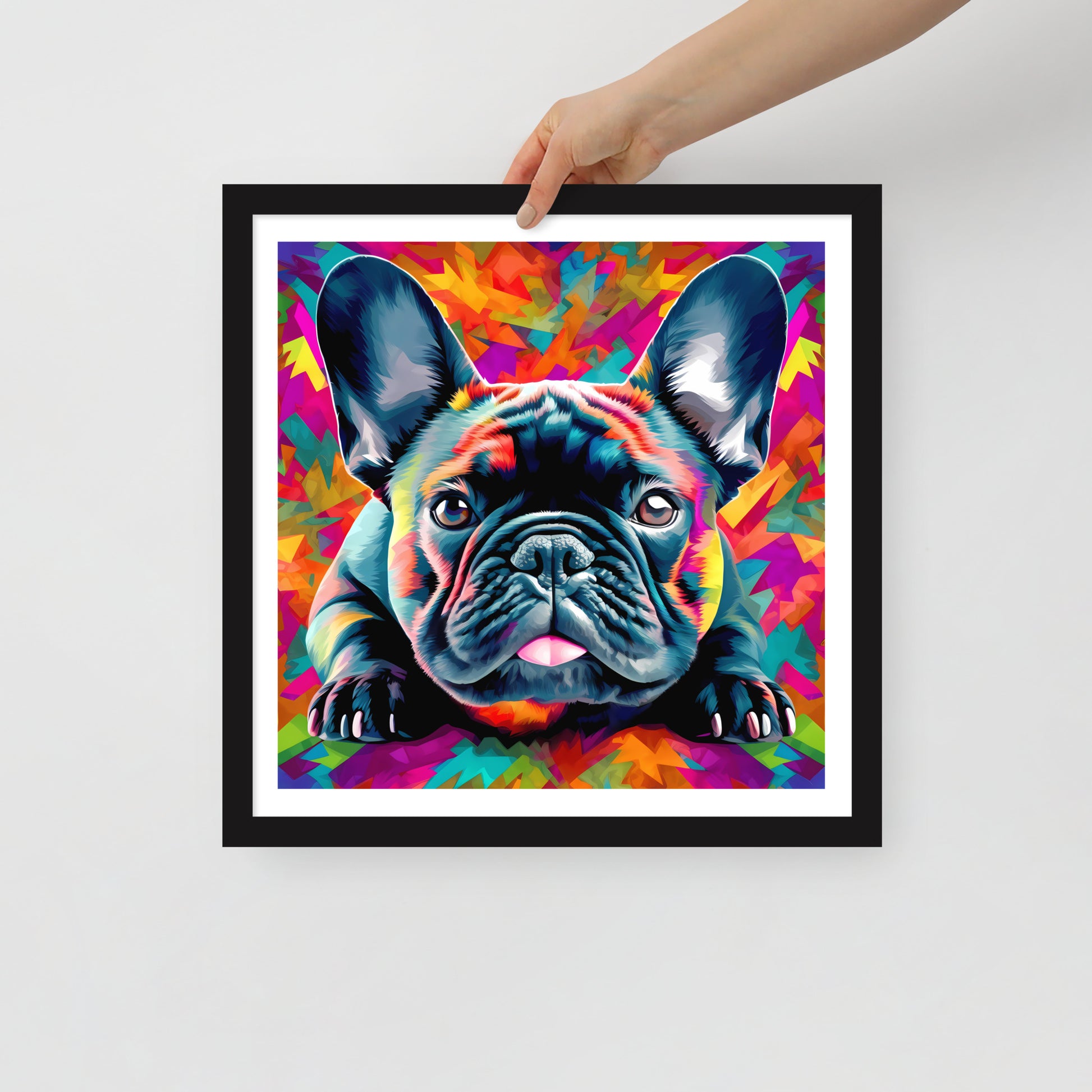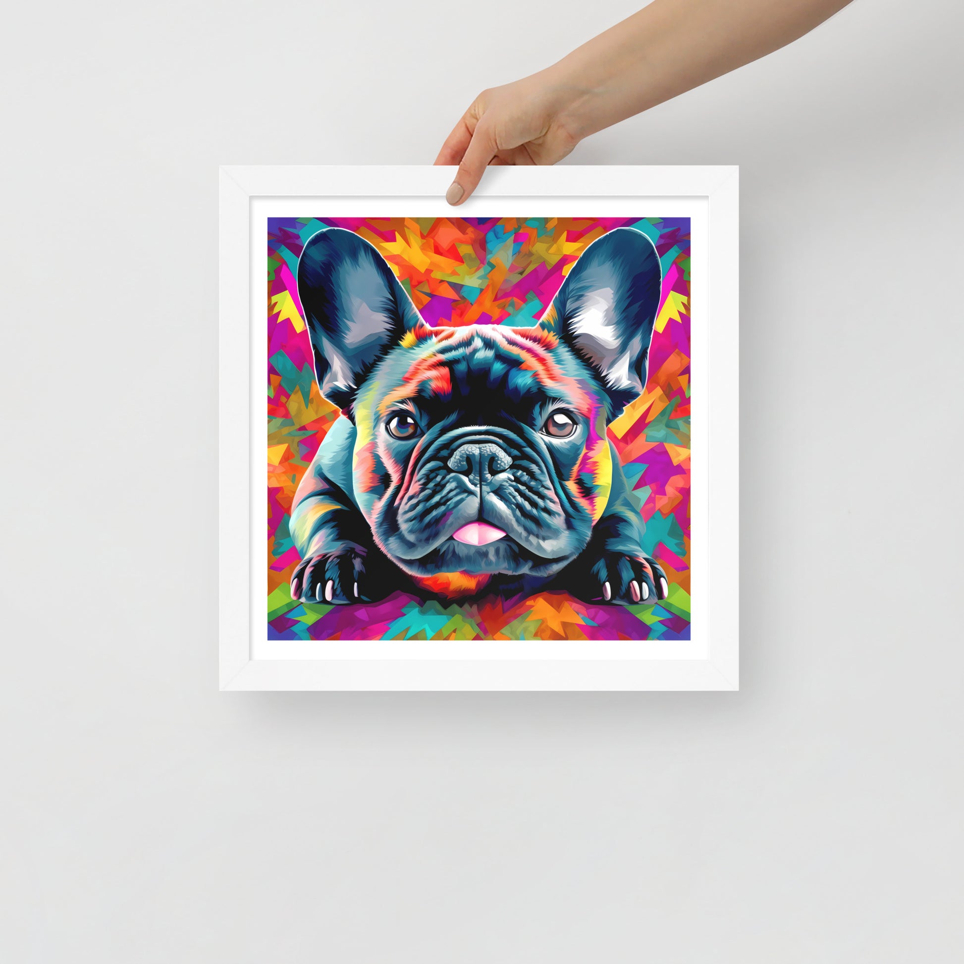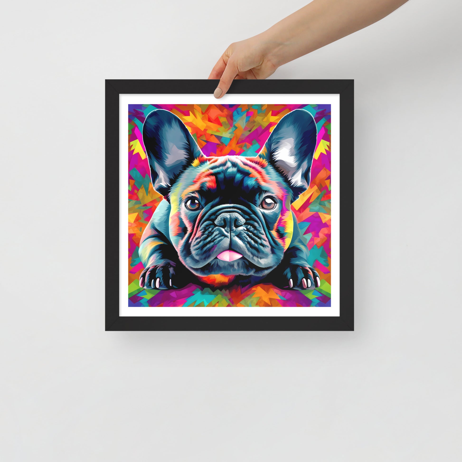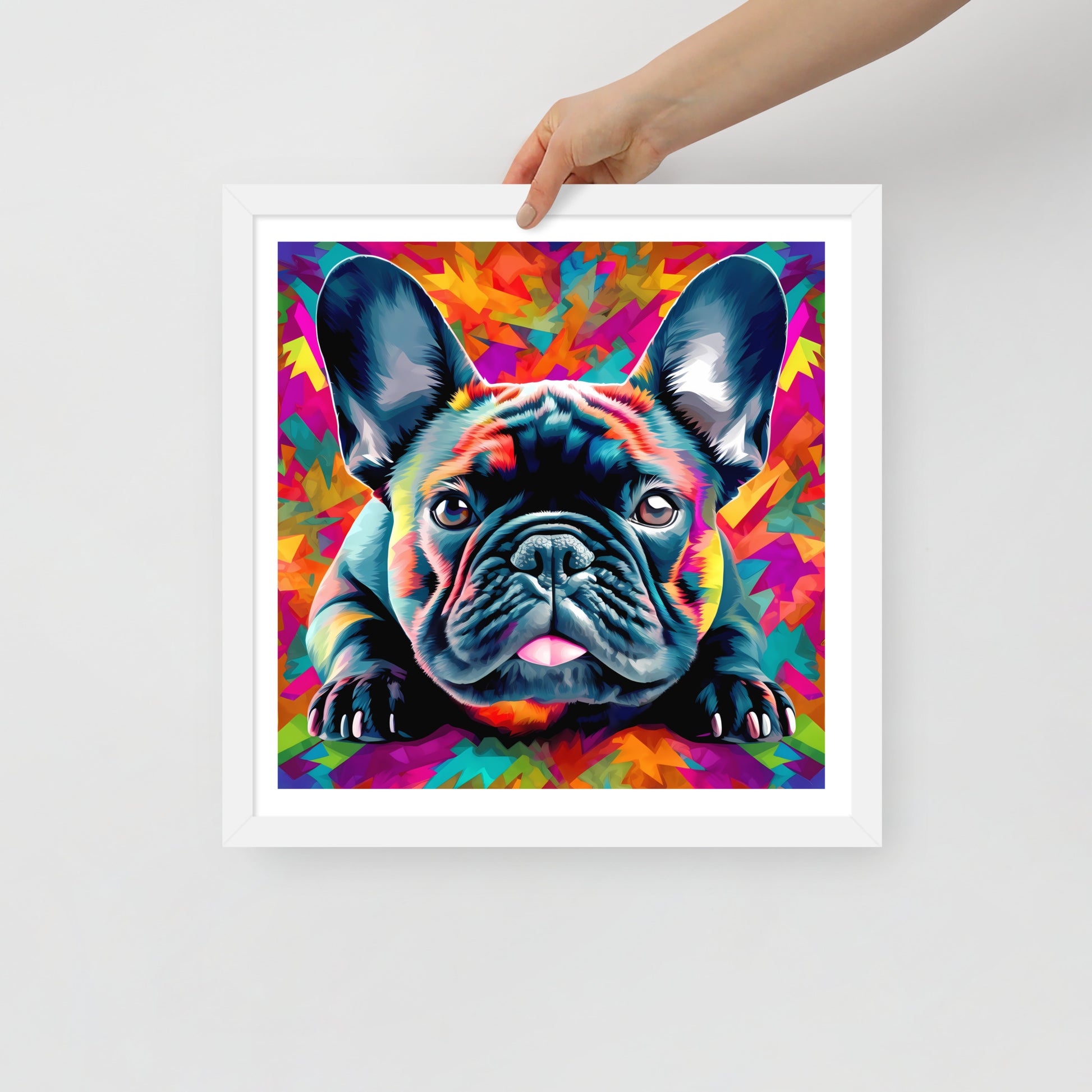 The artwork’s mosaic of vibrant colors, from the fiery oranges to the deep purples, blends seamlessly with the natural brindle patterns of the Frenchie, portraying a lively and spirited essence that the breed is known for. It's not merely a framed piece; it's a statement of joy and artistic flair that captures the imagination.