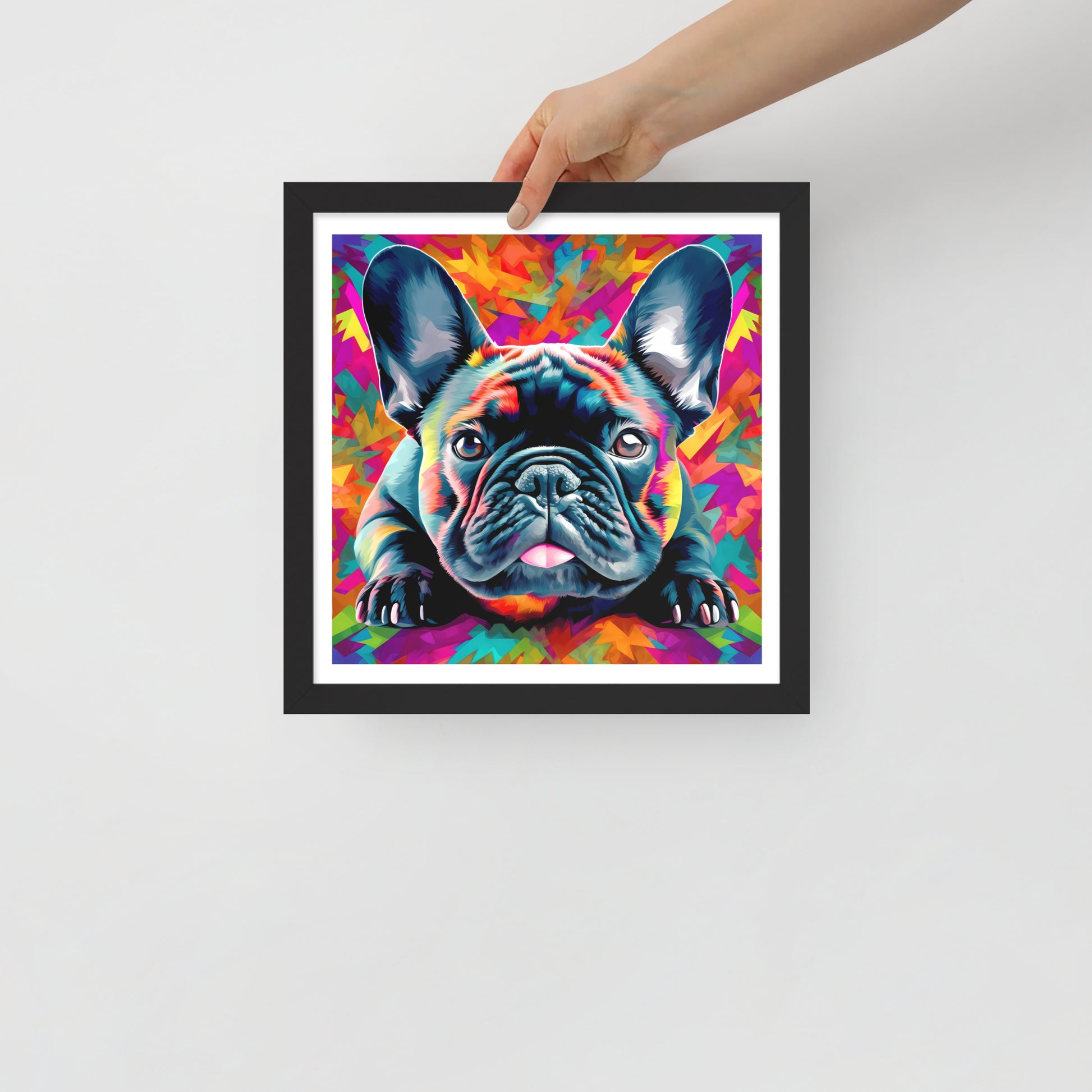 Introducing "Kaleidoscope Canine," a framed artwork that invites you to revel in the intricate dance of colors and canine allure. This piece showcases a brindle French Bulldog whose intricate coat patterns are amplified by the dazzling array of geometric shapes that envelop the backdrop, creating a dynamic, almost hypnotic visual experience.