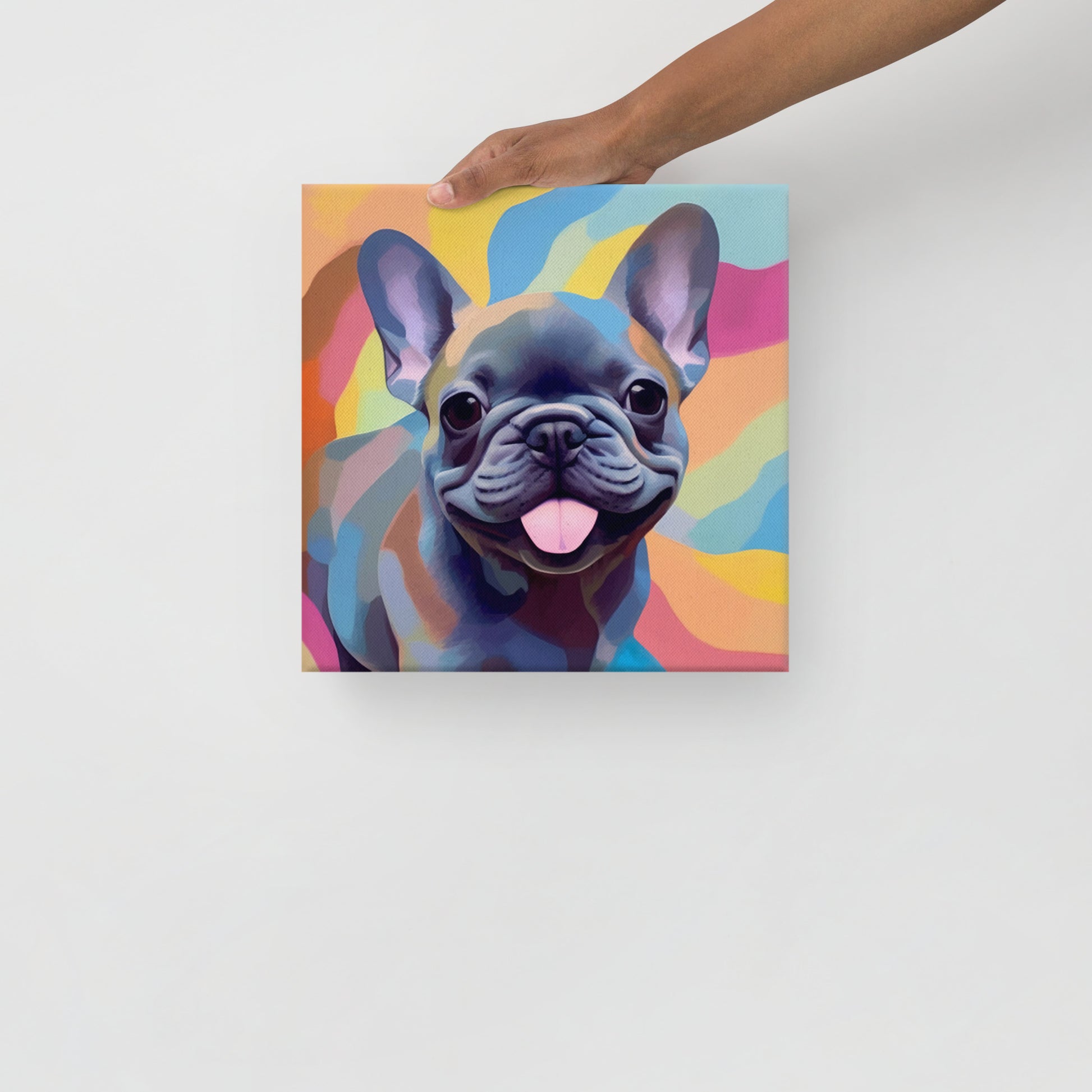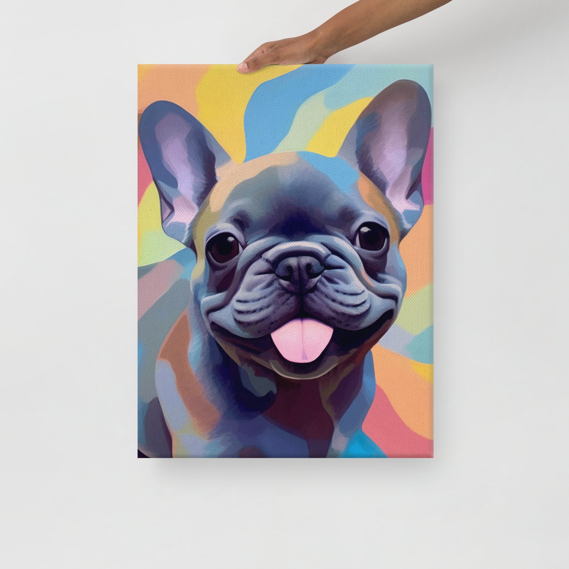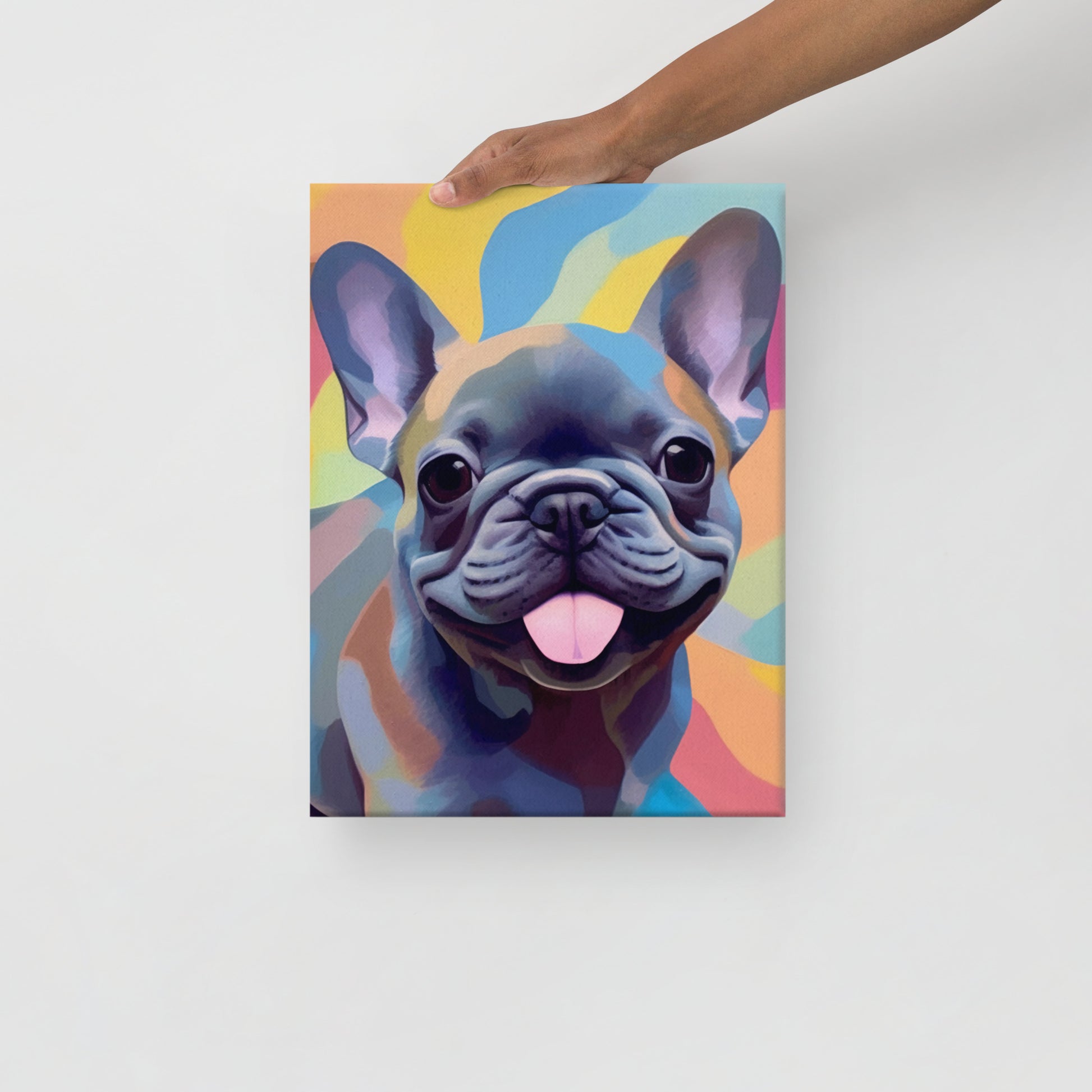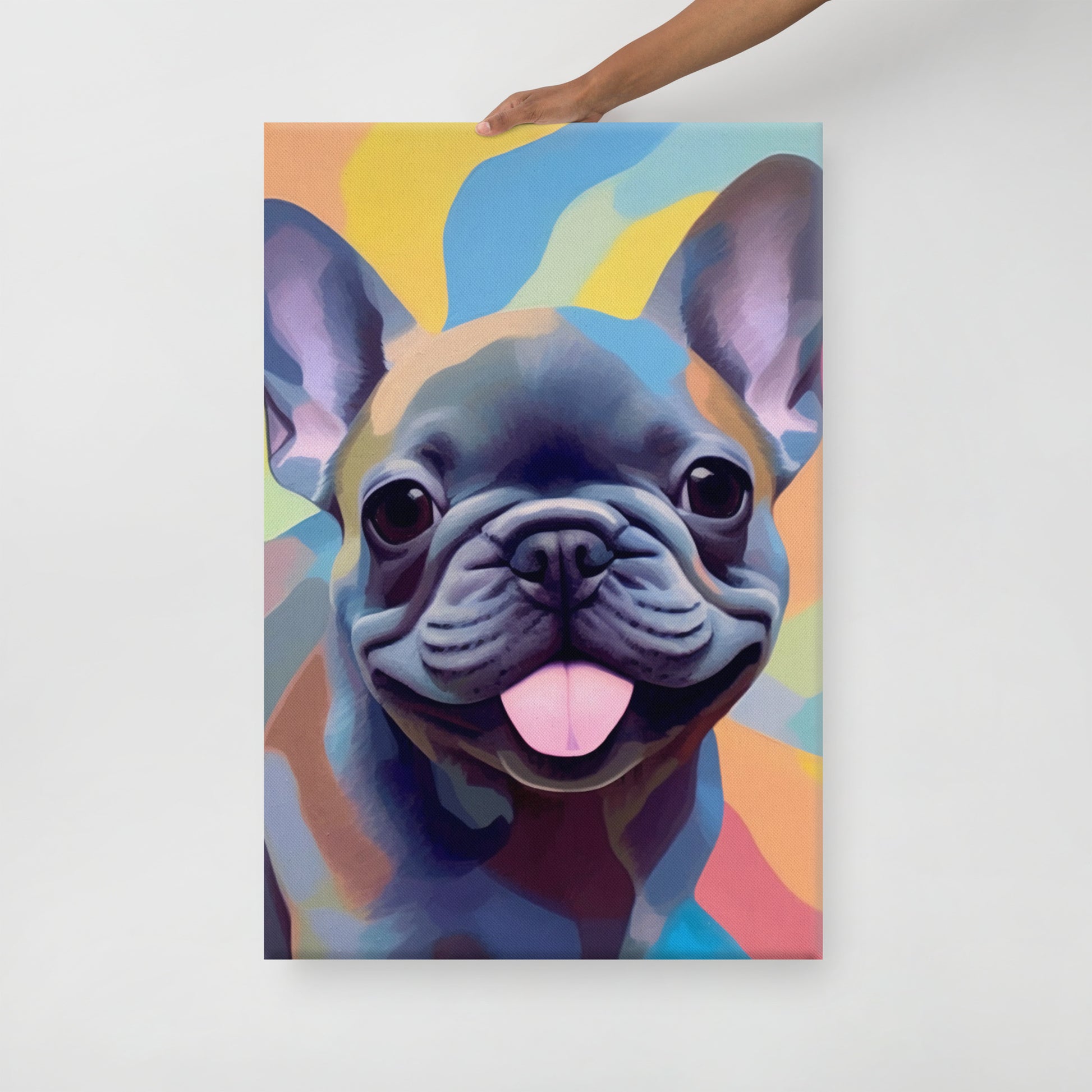 "Pastel Pal" is a canvas print that captures the exuberance and charm of a blue French Bulldog, framed within a playful tapestry of abstract, pastel waves. The artwork is a celebration of color and canine beauty, featuring a blue Frenchie with an infectious grin, tongue playfully out, inviting you into its joyful world. The backdrop is a flowing array of soft, yet vibrant, colors that emulate the warm embrace of a sunlit day, full of promise and playful delight.