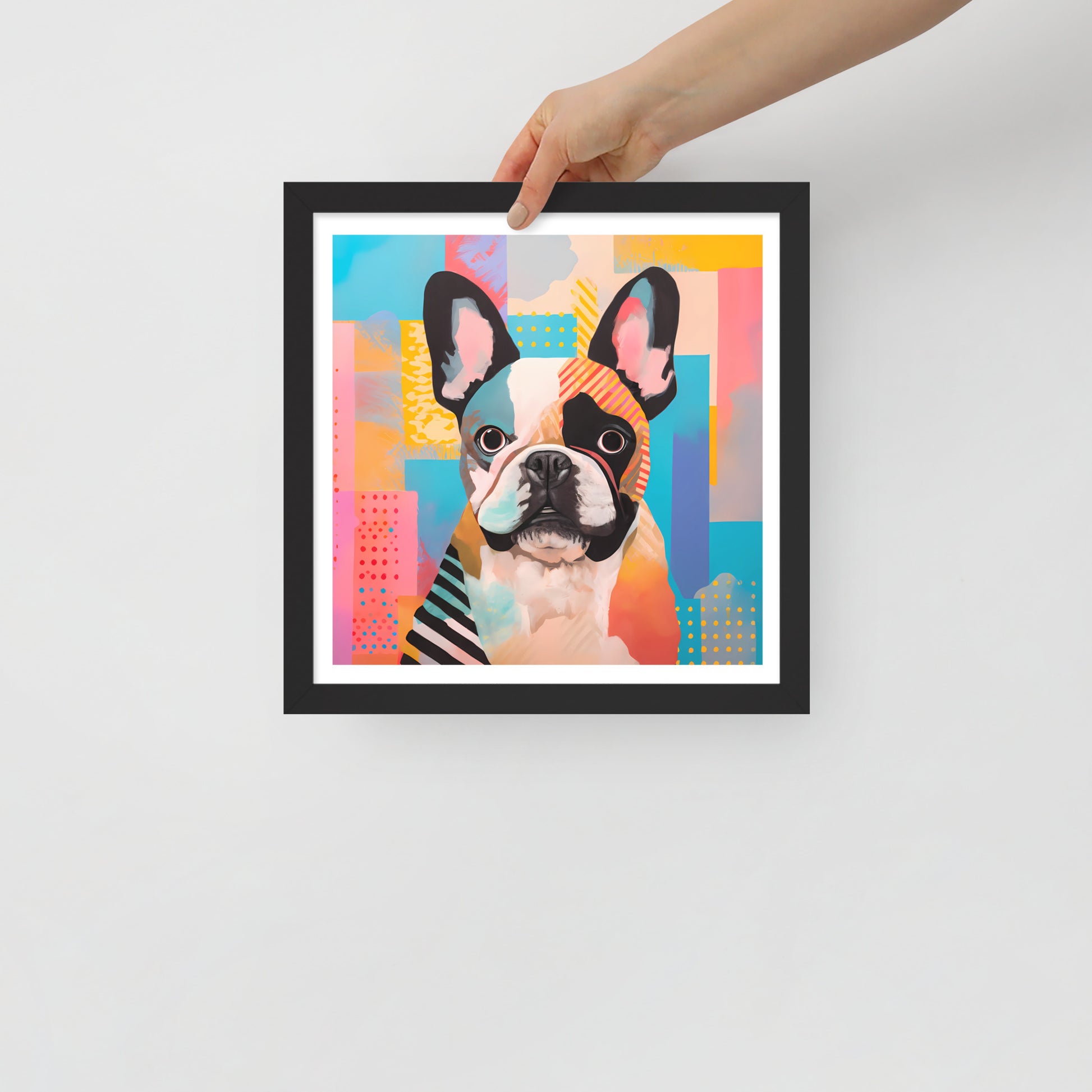 "Patchy Pooch" is a contemporary framed artwork that brings the lively essence of a Fawn Pied French Bulldog to life through a vivid and whimsical color palette. This mixed-media marvel layers the dog's charming persona with exuberant splashes of neon hues that sing with vibrancy and movement. From the soothing light blues to playful pinks, radiant yellows, and vivid oranges, each color weaves into the next, creating an abstract melody of shapes and shades.