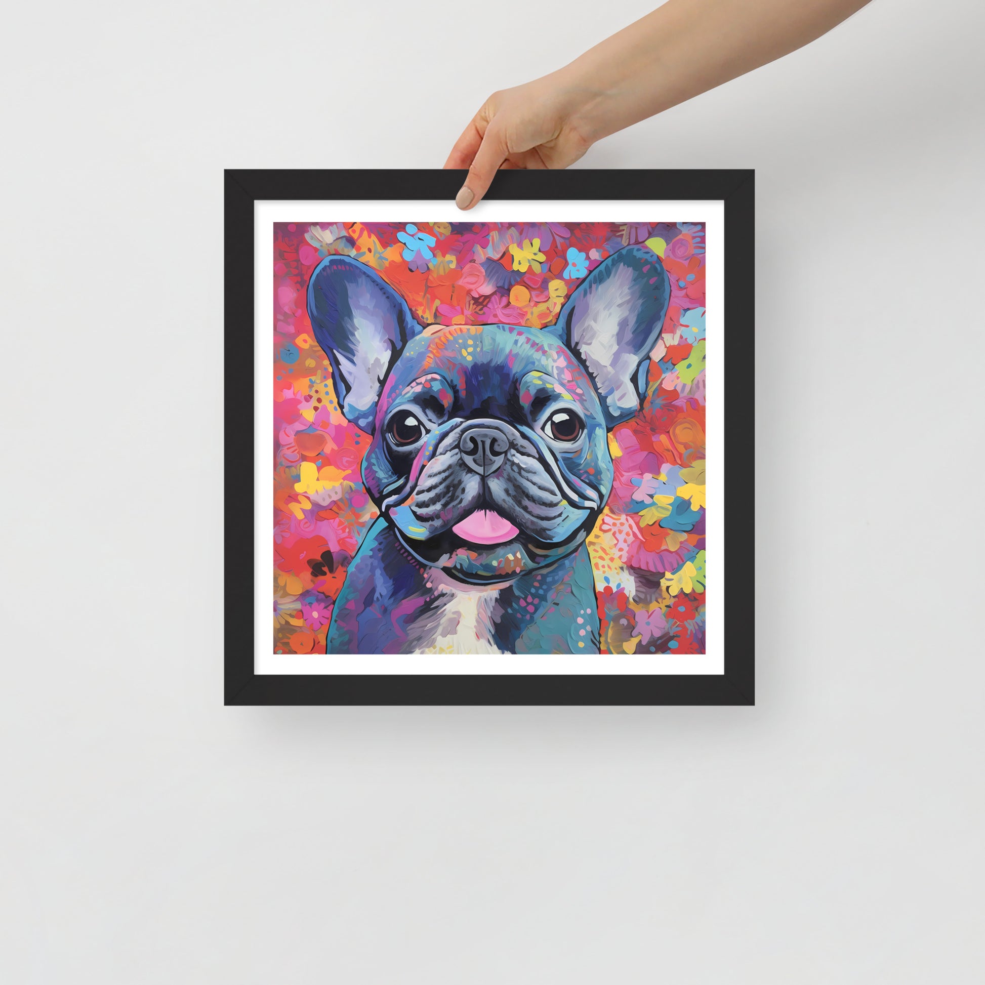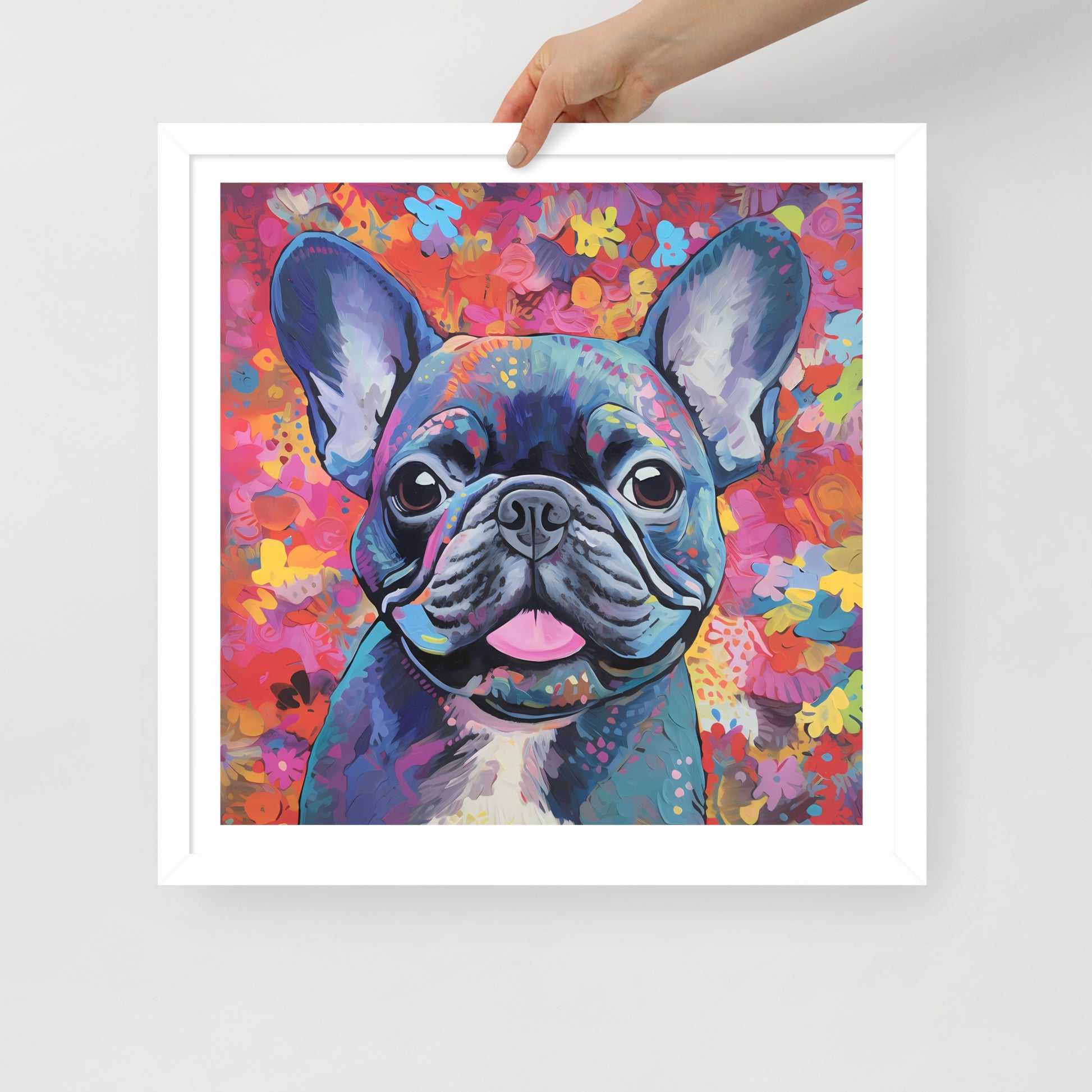 Step into a world where color bursts into life with "Petal Pooch," an enchanting framed artwork that celebrates the radiant spirit of a blue French Bulldog amidst a blossoming floral tapestry. This captivating piece is more than just a visual delight—it's a confluence of jubilant innocence and exuberant color play that captures the essence of the French Bulldog's charm.