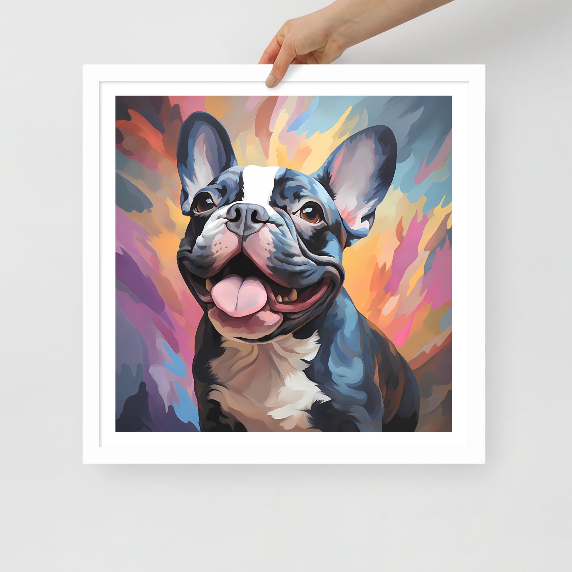 Embrace the lively spirit of the "Pied Pastel Splash" framed artwork, a dynamic display of a pied French Bulldog seemingly leaping through a vivacious splash of pastel tones. This artwork doesn't just capture a moment; it encapsulates the essence of exuberance, with every brushstroke adding to the sensation of movement and joy.