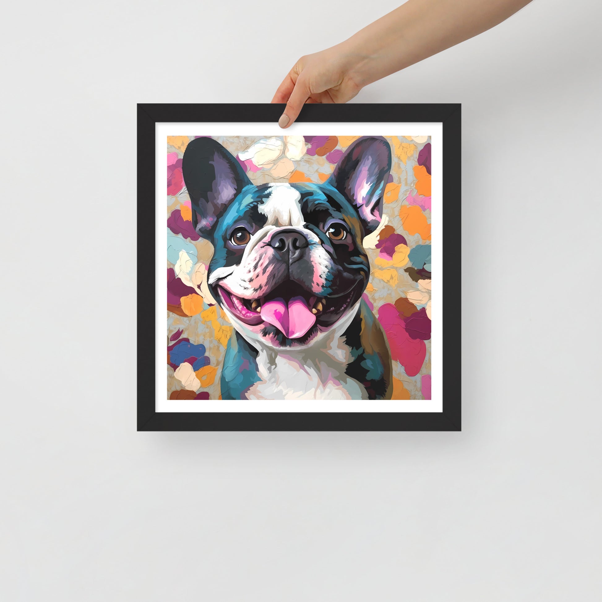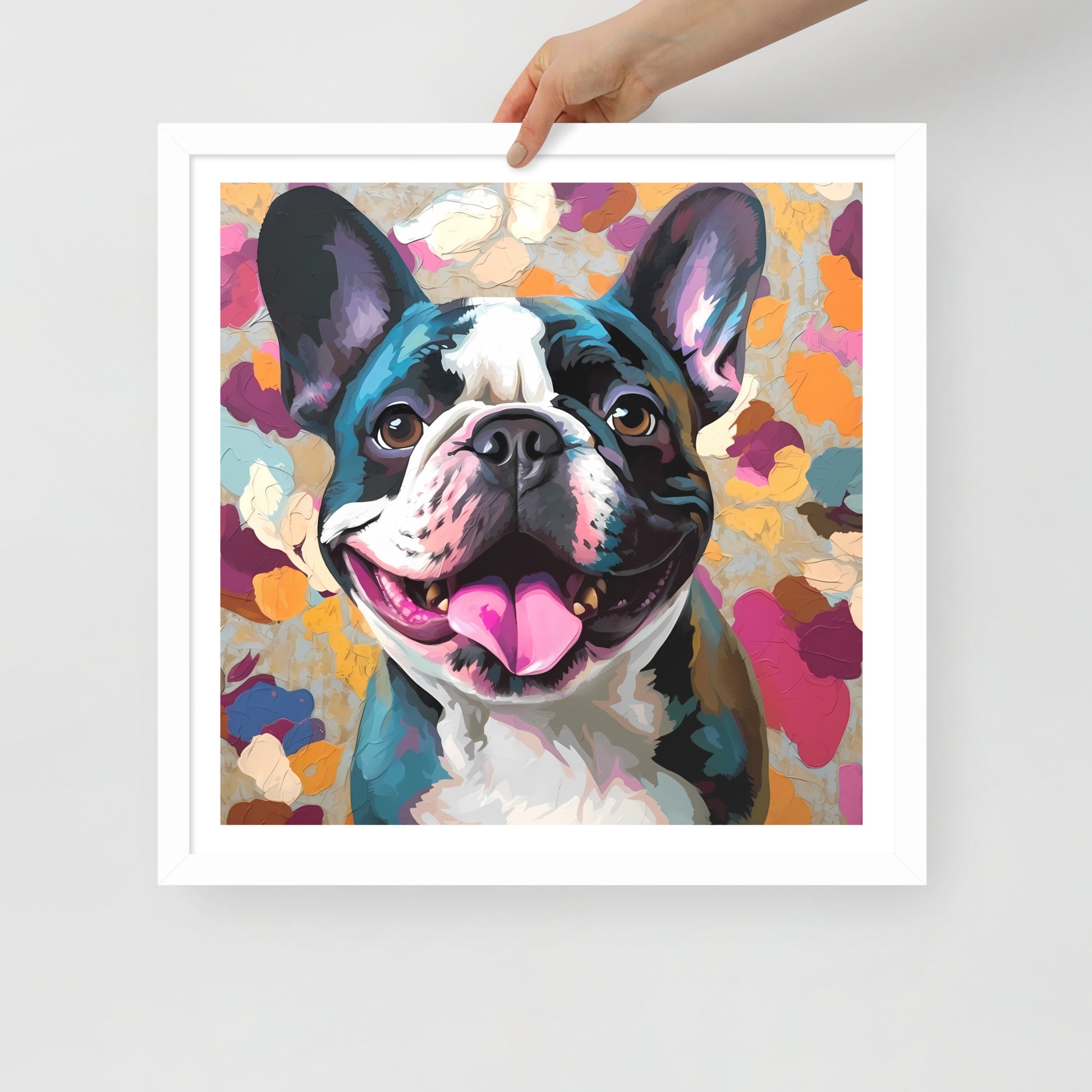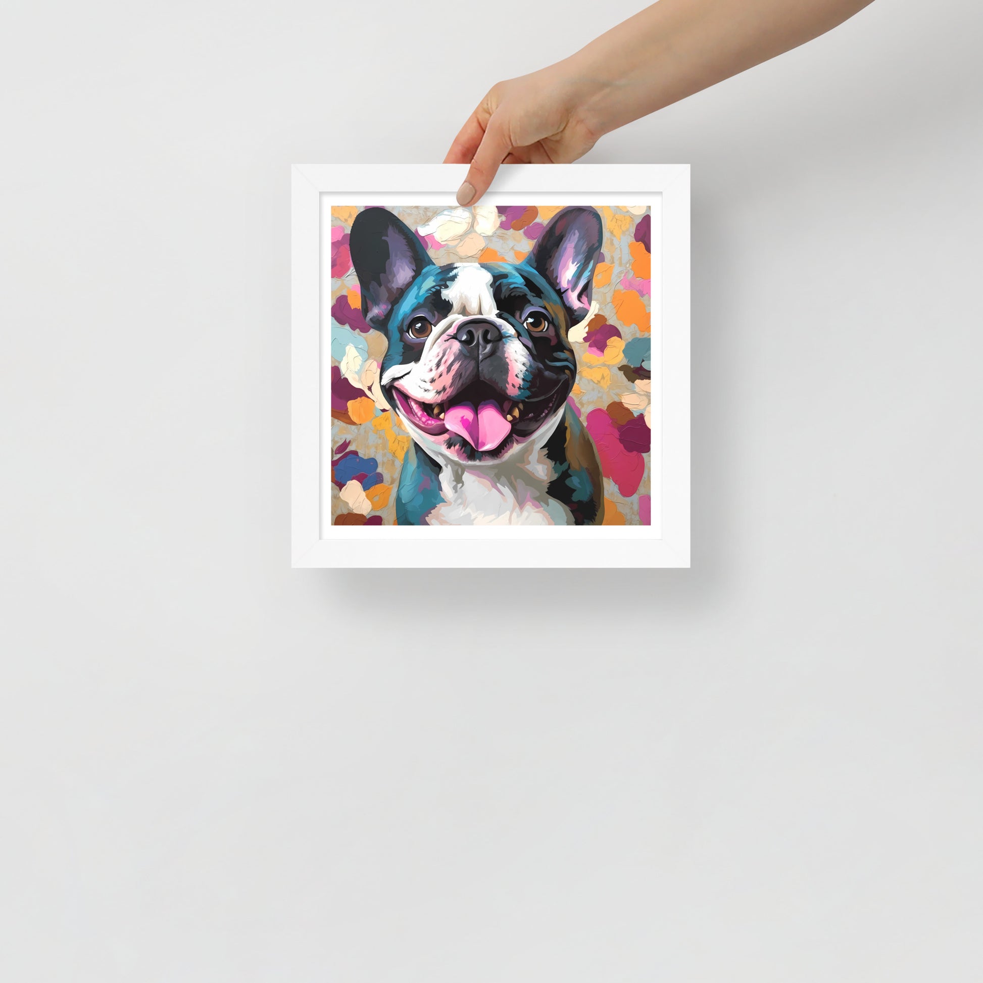 Celebrate the charm of the pied French Bulldog with our "Pied Patchy Pooch" framed artwork, a vivid portrayal that radiates joy with every patch of color. This piece captures the playful essence of a pied Frenchie, set against an effervescent backdrop reminiscent of rich flora in a myriad of warm, inviting tones.