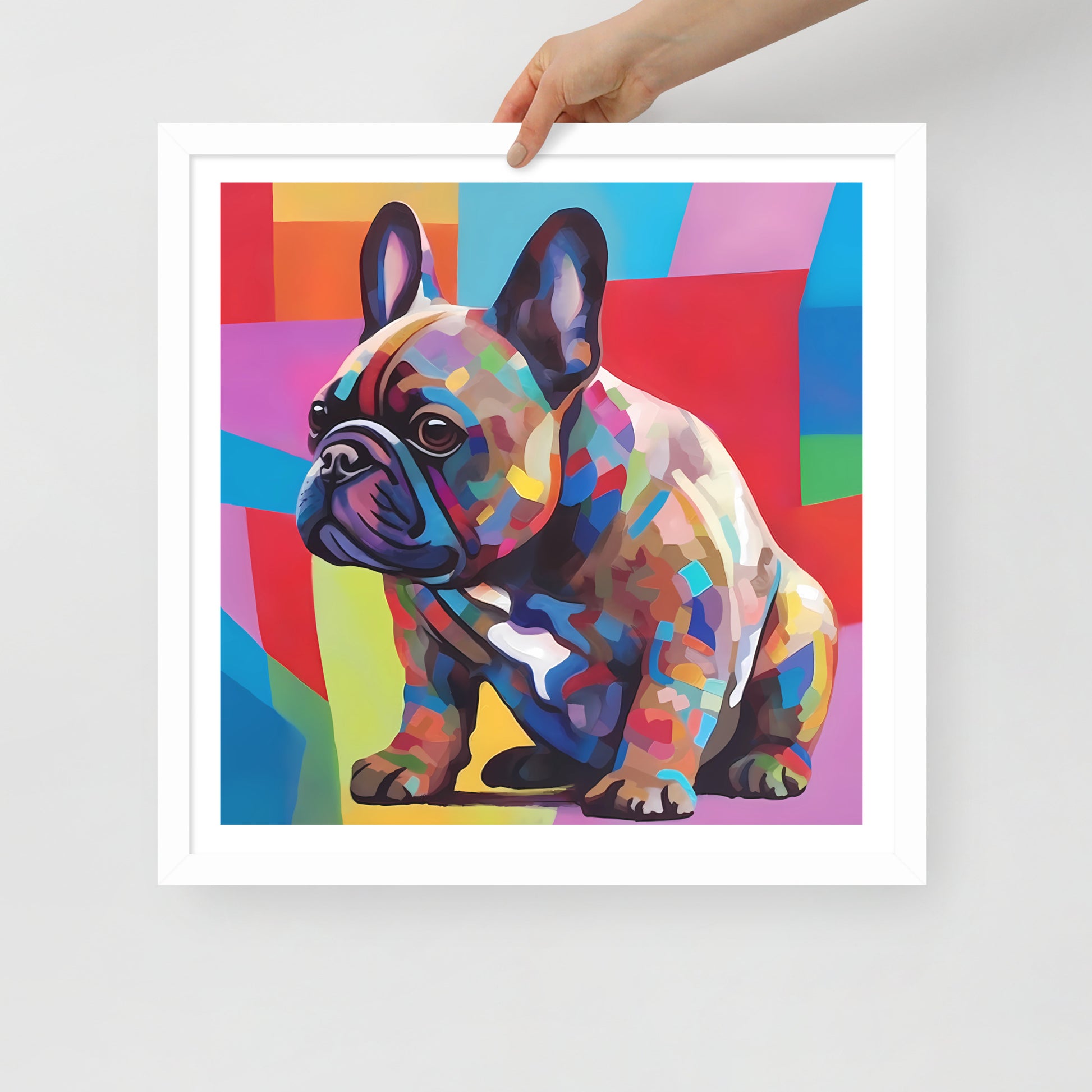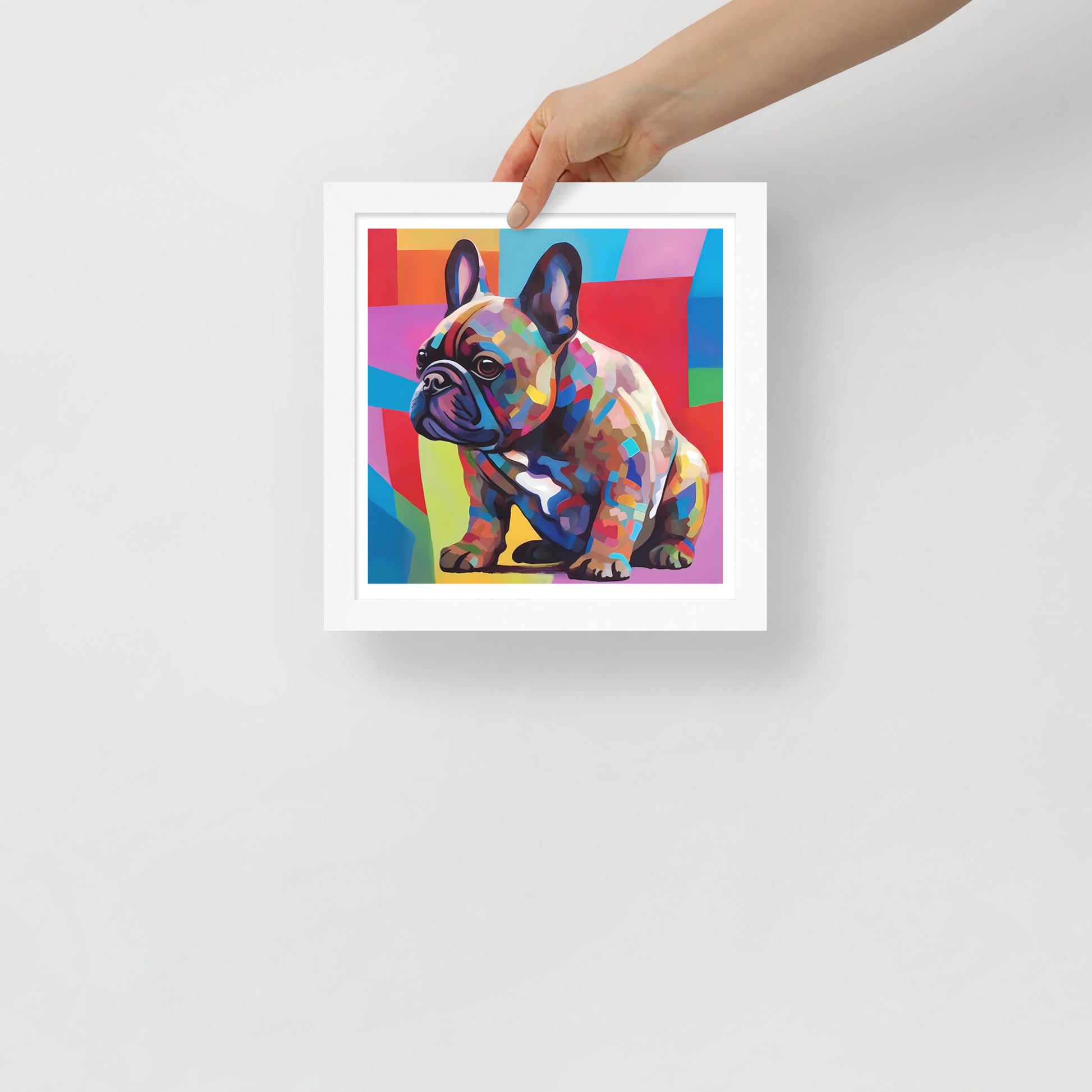 Immerse yourself in the artistic allure of "Pixel Patch Pup," a framed artwork that captures the playful yet thoughtful essence of a fawn French Bulldog. This piece juxtaposes the Frenchie's iconic silhouette against a vividly abstract background, each color block telling its own story.