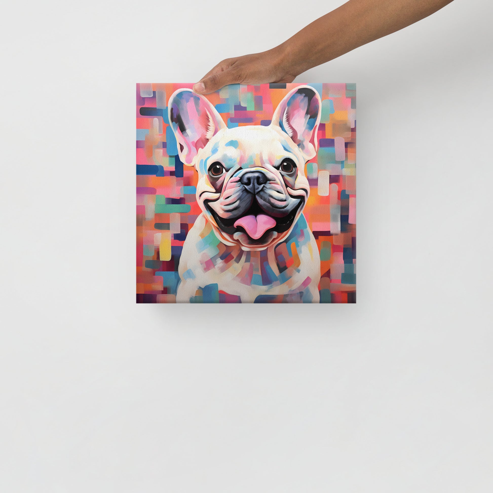 The backdrop is a complex grid of color, reminiscent of a digital pixel display, that creates an intriguing depth and texture, drawing the eye in for a closer look. Each square of color serves to highlight the Frenchie's playful grin and bright, expressive eyes, creating a striking contrast that's both modern and endearing. This piece is not just a representation of a Frenchie; it's a bold statement in color and form, a testament to the joy and companionship these pets provide.