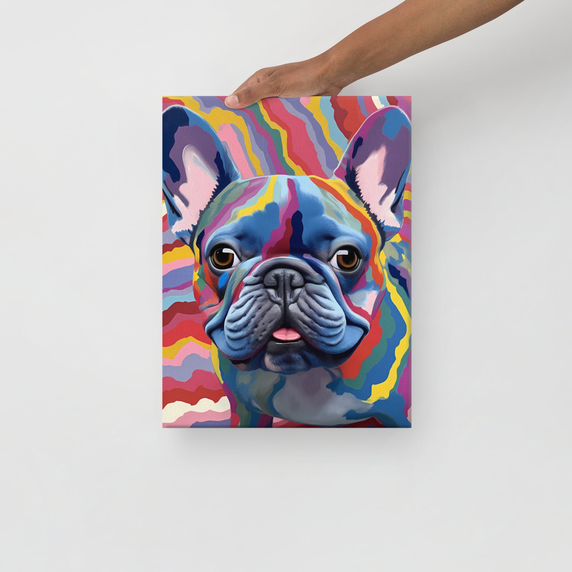 Immerse yourself in the dynamic energy of "Psychedelic Pooch," where the iconic French Bulldog is reimagined through a vivid, psychedelic lens. This canvas print captures the essence of a blue Frenchie amidst a sea of saturated, wavy contours, each one a brushstroke of vibrant hues that dance across the canvas in a harmonious symphony of color.