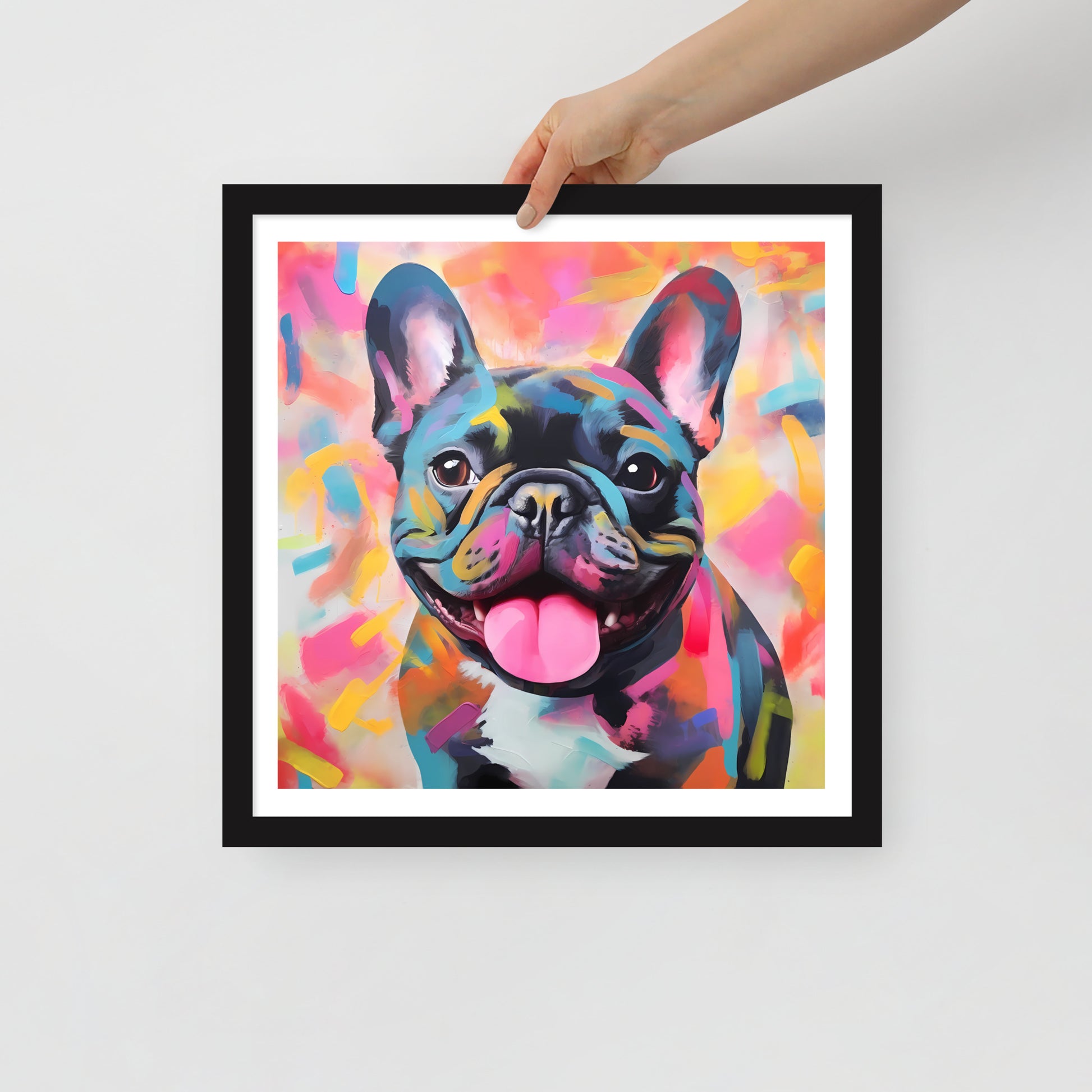 As the centerpiece, our Frenchie's tongue lolls out in a candid expression of bliss, embodying the pure, uninhibited happiness that these lovable dogs bring into our lives. The artwork's abstract spray-paint style might strike you as spontaneously chaotic at first glance, yet a closer look reveals an underlying sense of balance and order – a perfect visual metaphor for the delightful unpredictability of a Frenchie's charm.