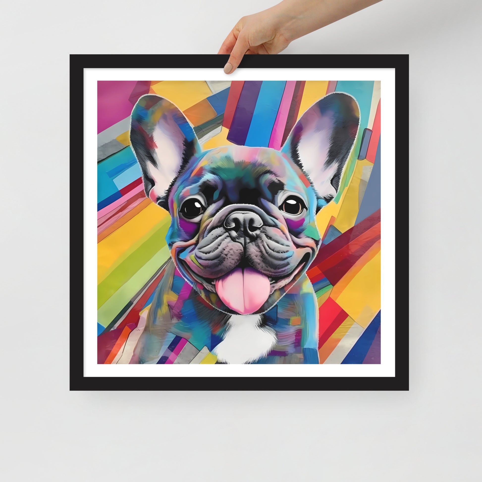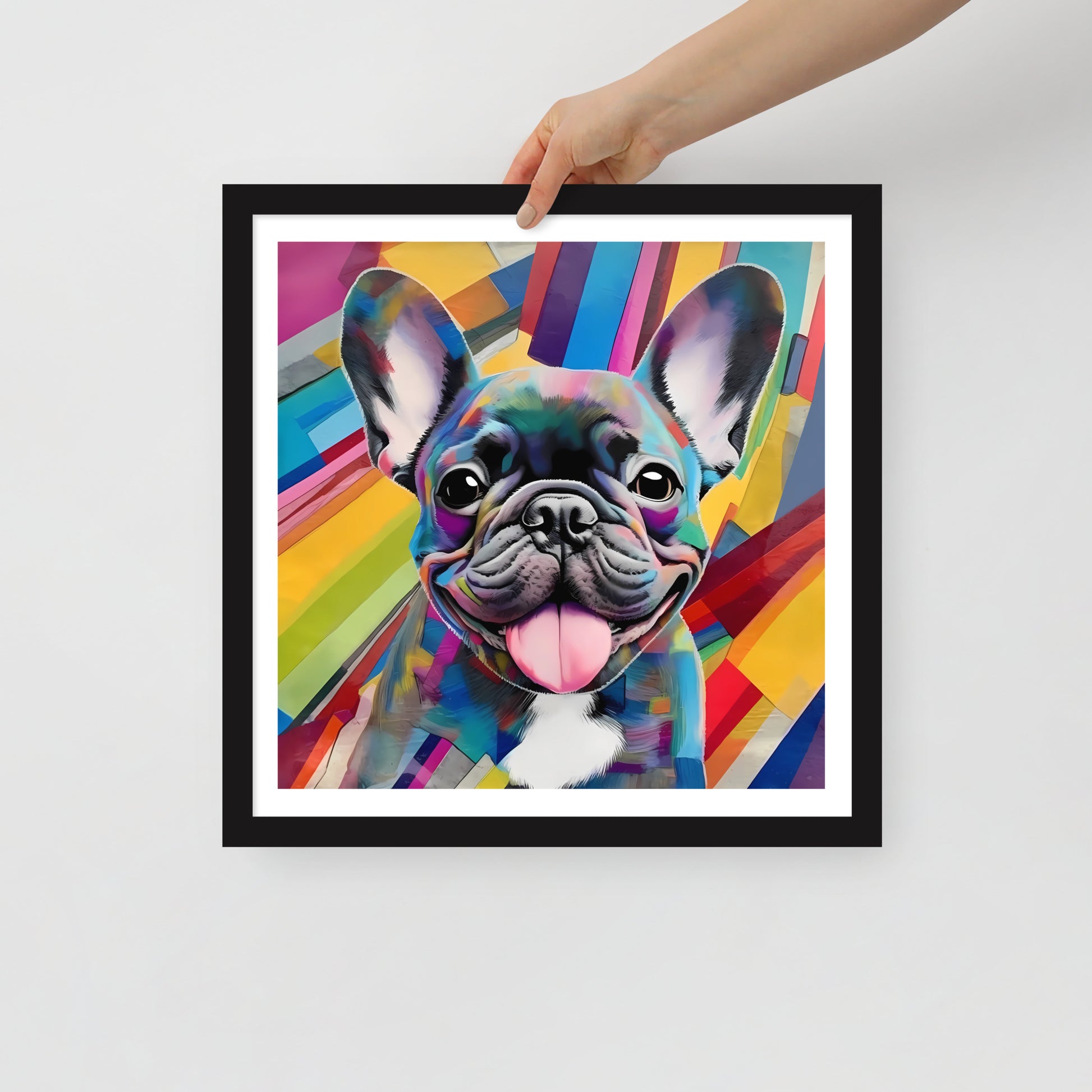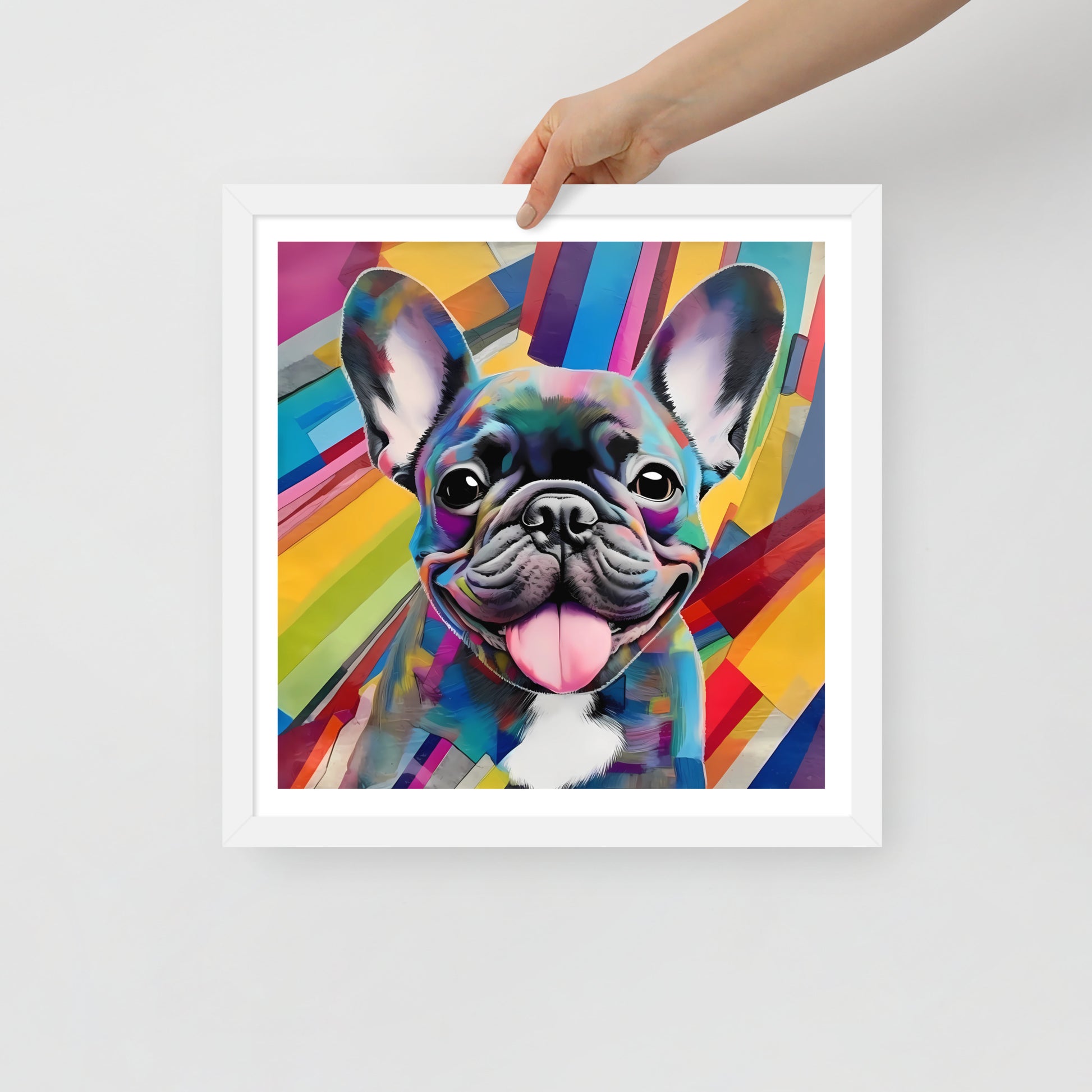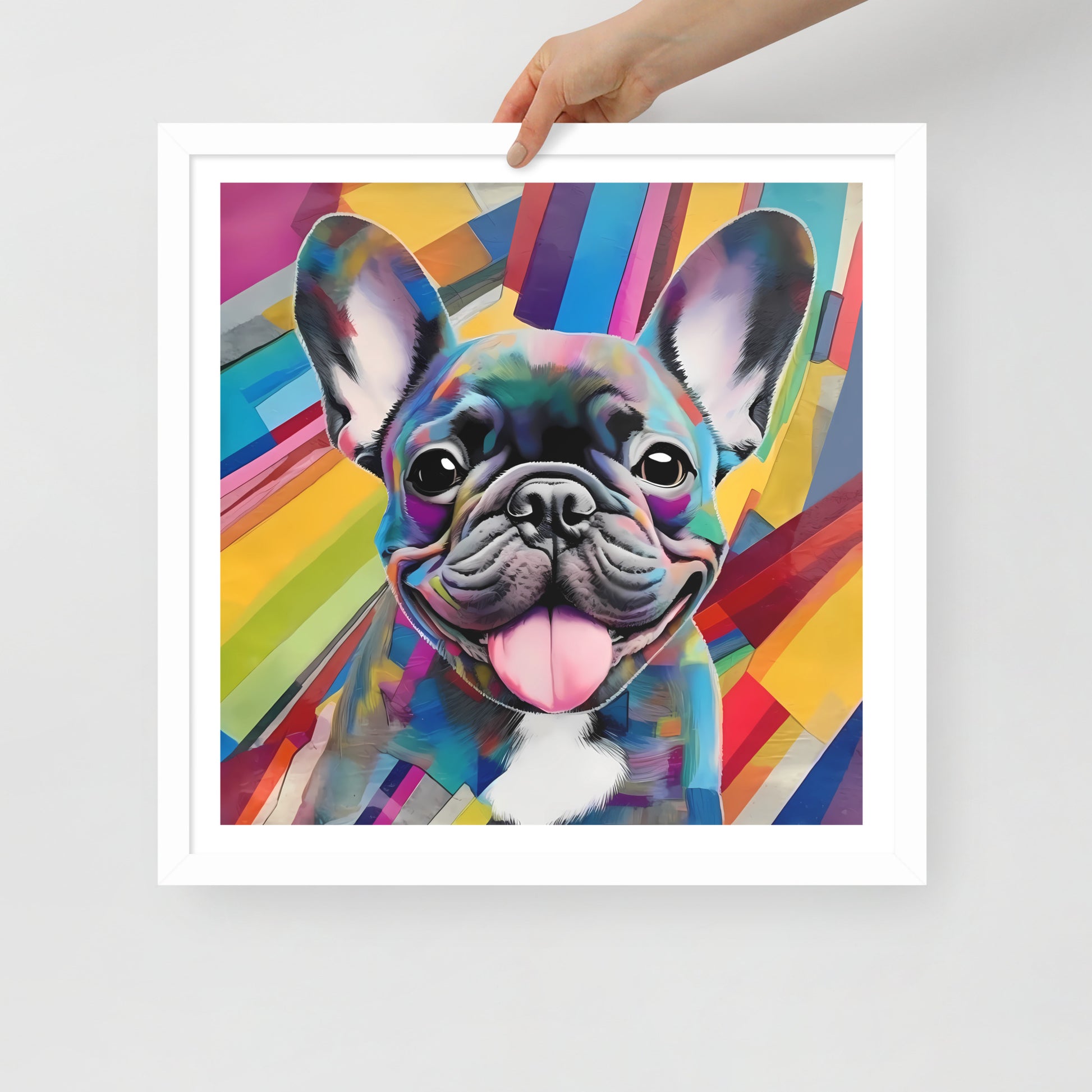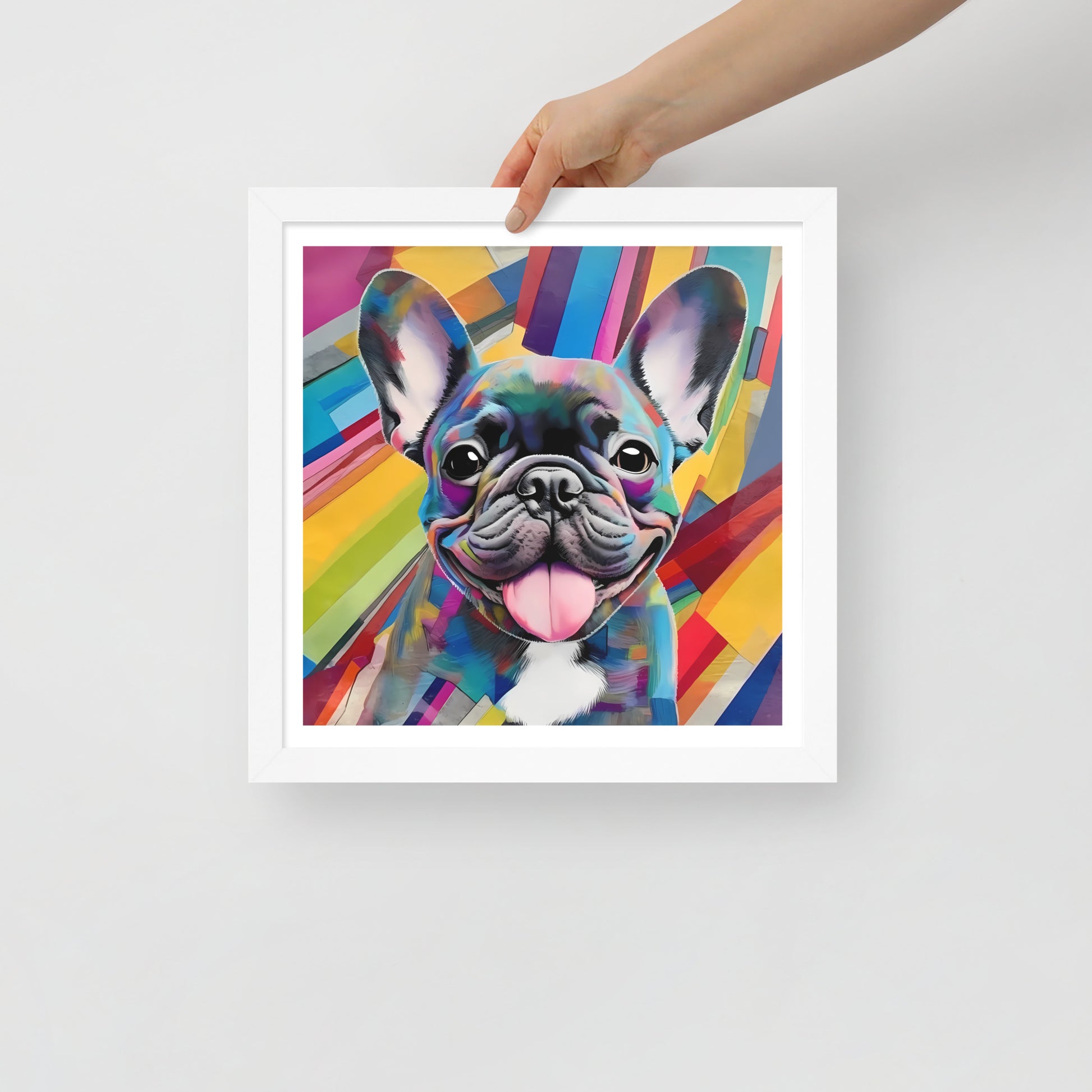 Indulge in the harmonious blend of hues with "Striped Symphony," a framed artwork that encapsulates the whimsical spirit of a French Bulldog through an explosion of colors. The lilac Frenchie, set against a canvas of kaleidoscopic stripes, embodies the joy and playfulness of these cherished canines. This piece is not just a visual journey through color and form but a tribute to the structured yet joyful chaos of life with a furry friend.