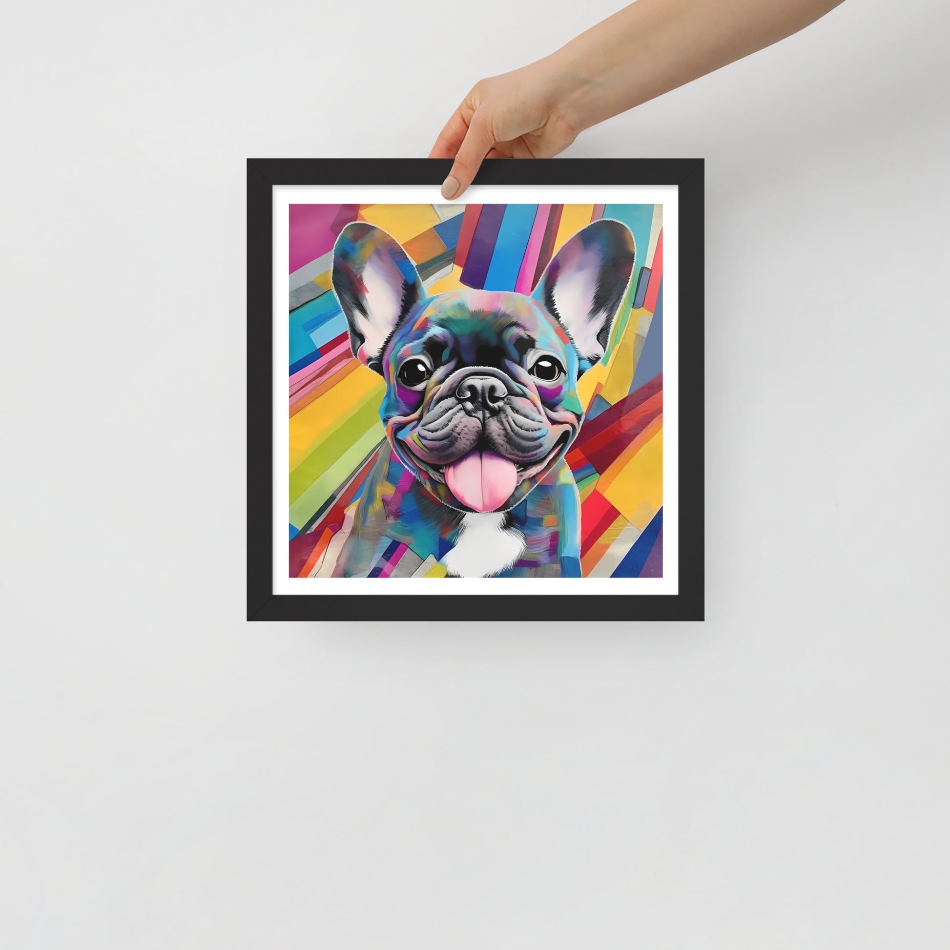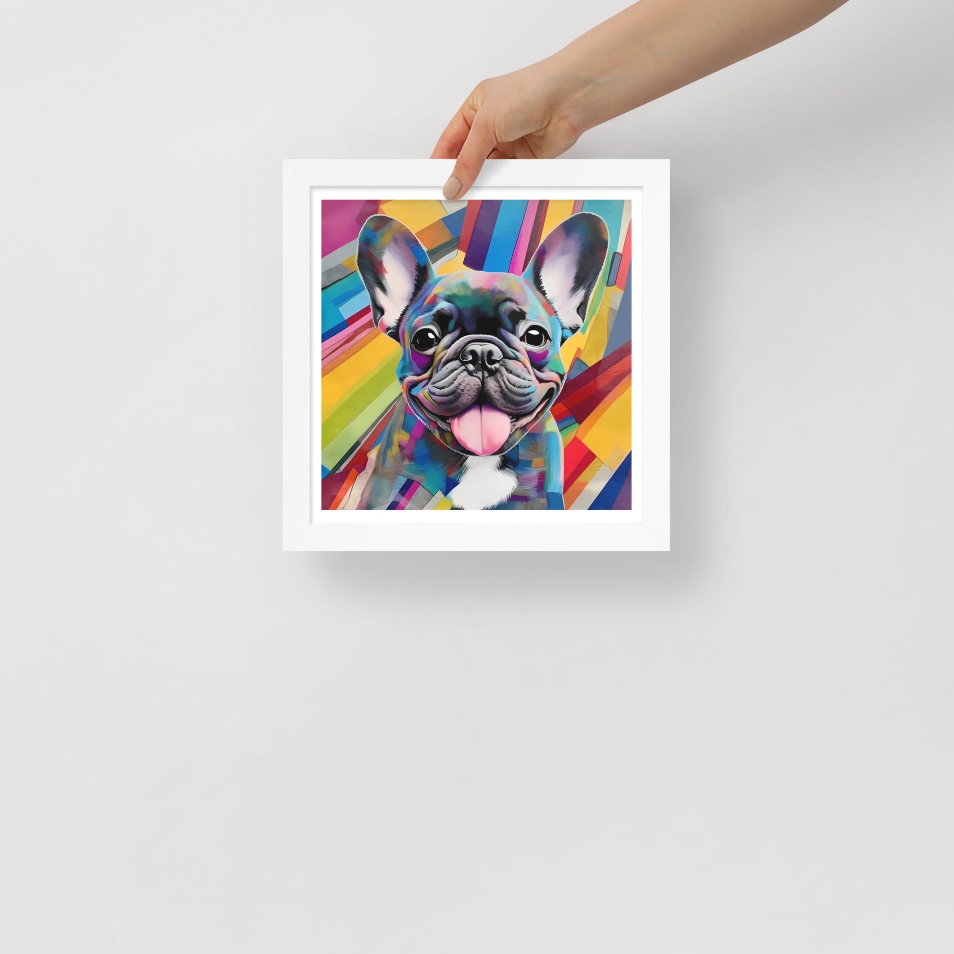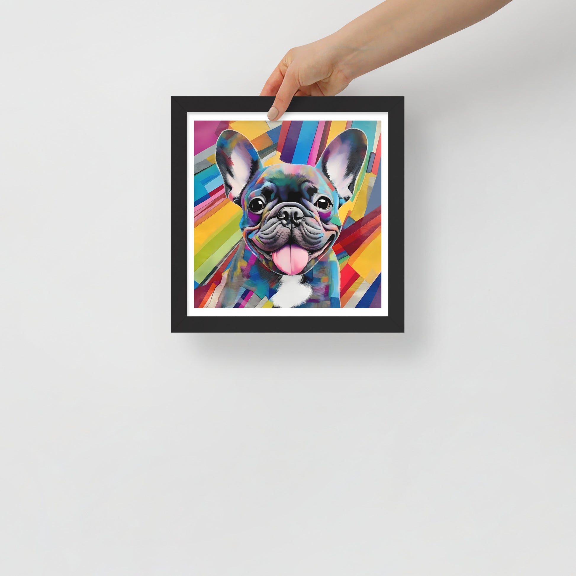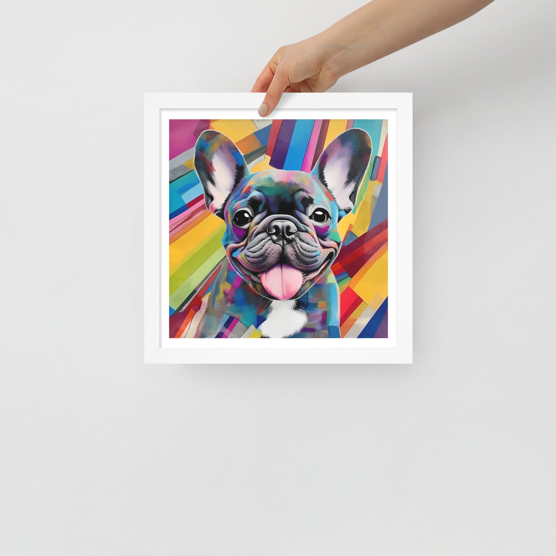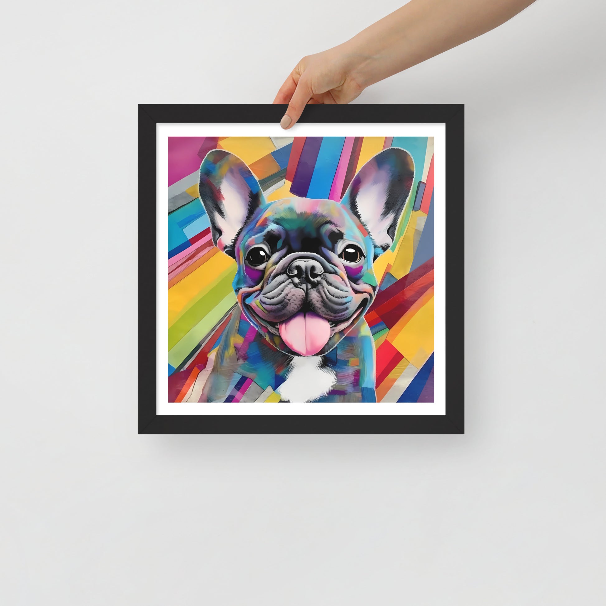 Indulge in the harmonious blend of hues with "Striped Symphony," a framed artwork that encapsulates the whimsical spirit of a French Bulldog through an explosion of colors. The lilac Frenchie, set against a canvas of kaleidoscopic stripes, embodies the joy and playfulness of these cherished canines. This piece is not just a visual journey through color and form but a tribute to the structured yet joyful chaos of life with a furry friend.