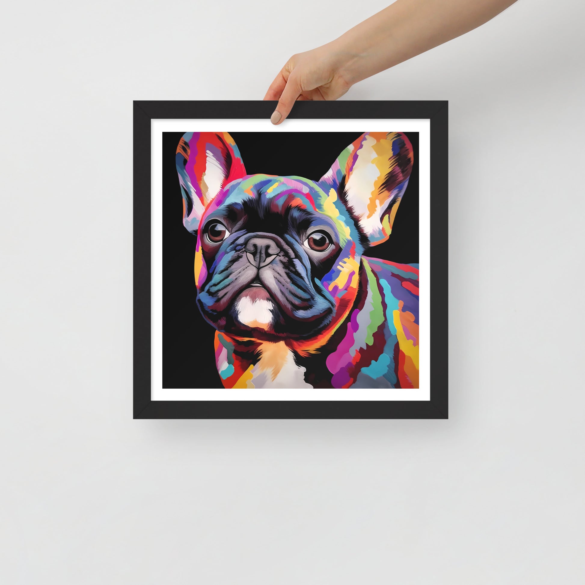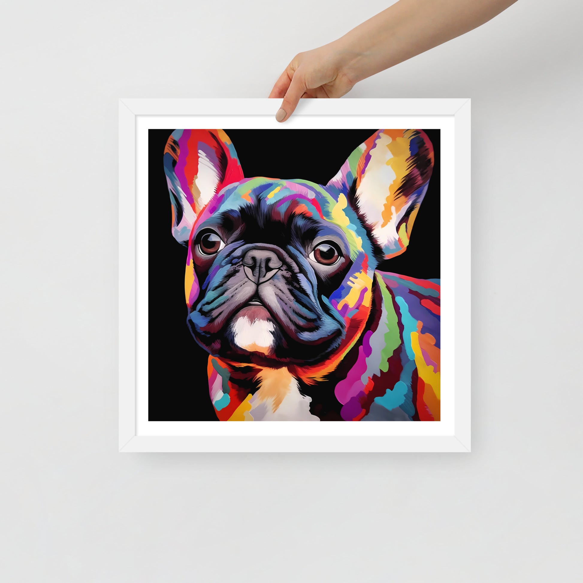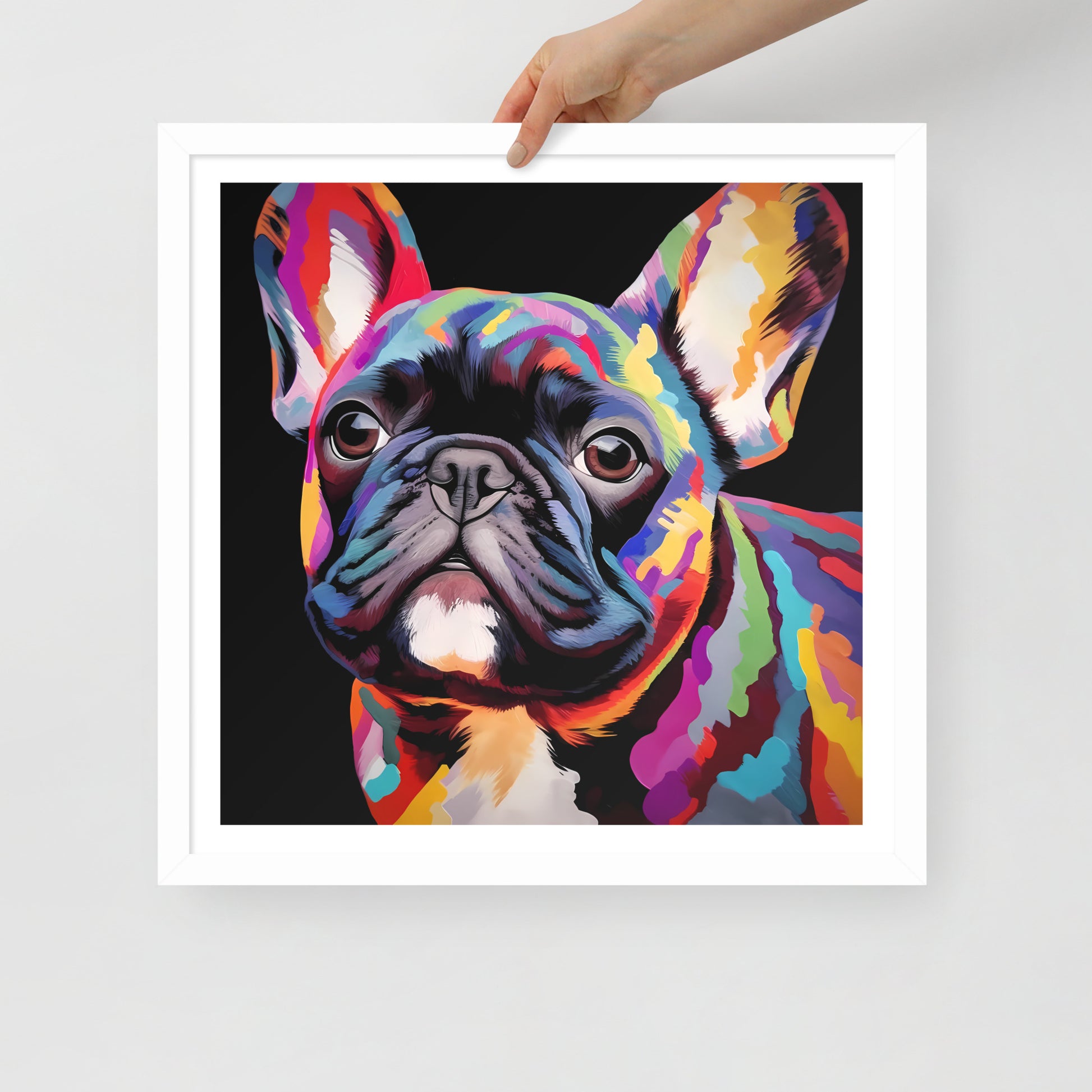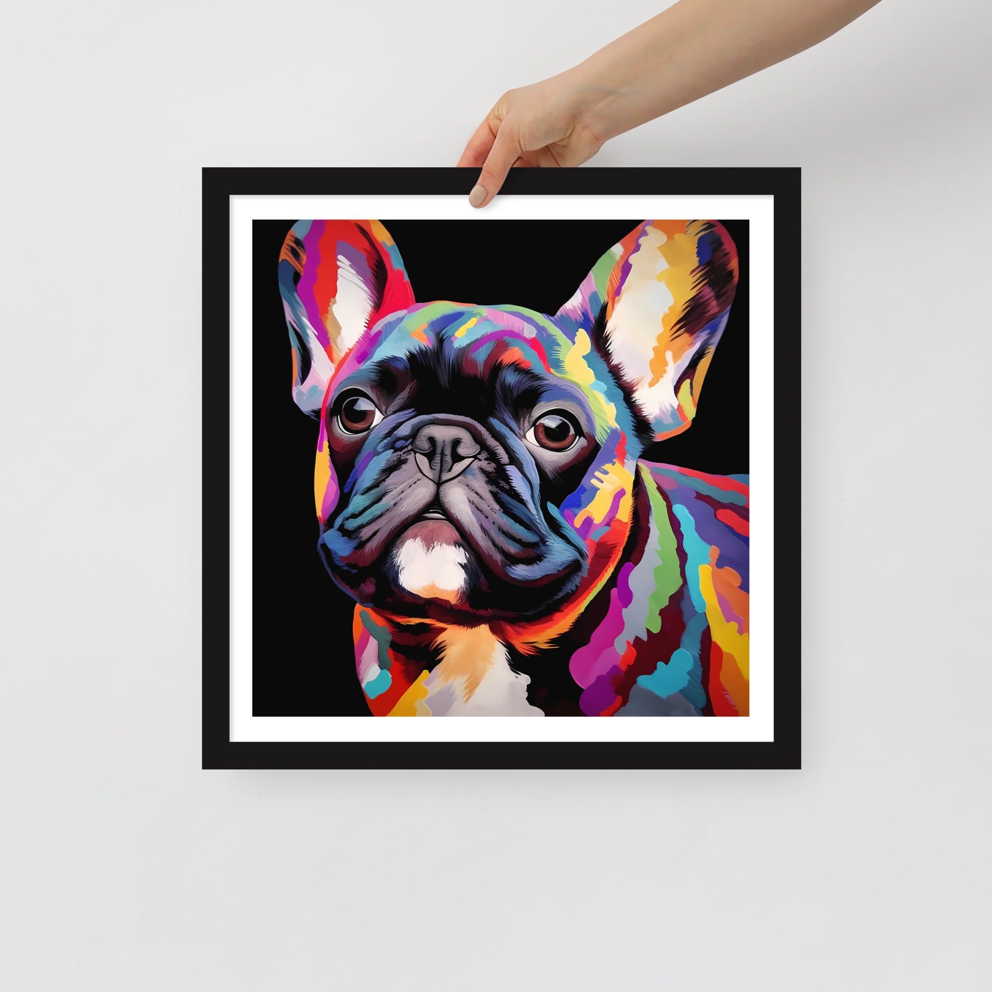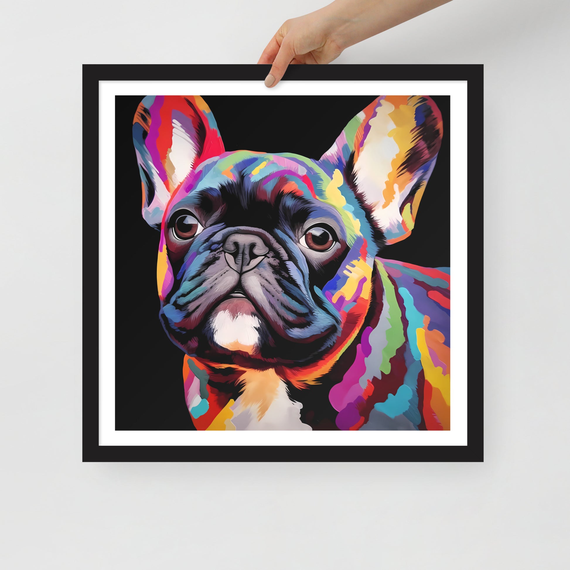 This art piece is a bold juxtaposition of color and darkness, embodying the essence of modern art with the timeless charm of one of the most adored canine breeds. It invites viewers into a world where tradition meets a vivid, contemporary aesthetic, encapsulating the brindle Frenchie's spirit in a spectrum of swoon-worthy color.