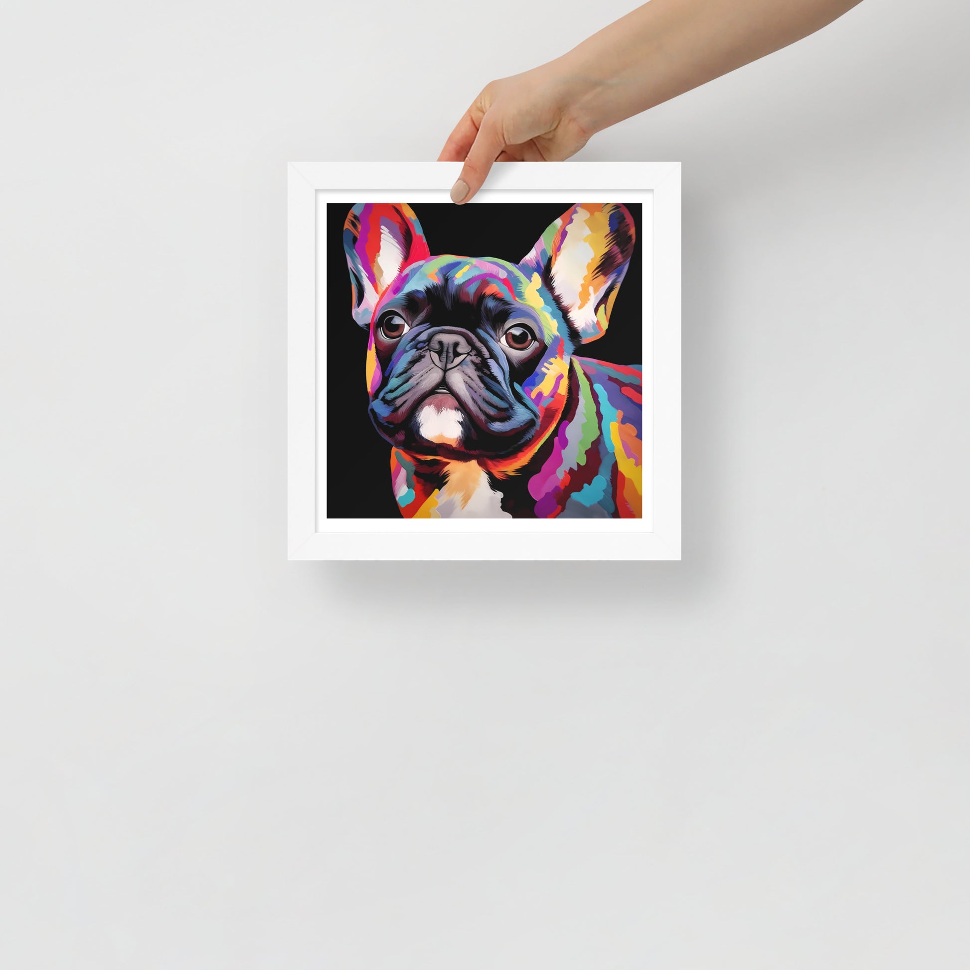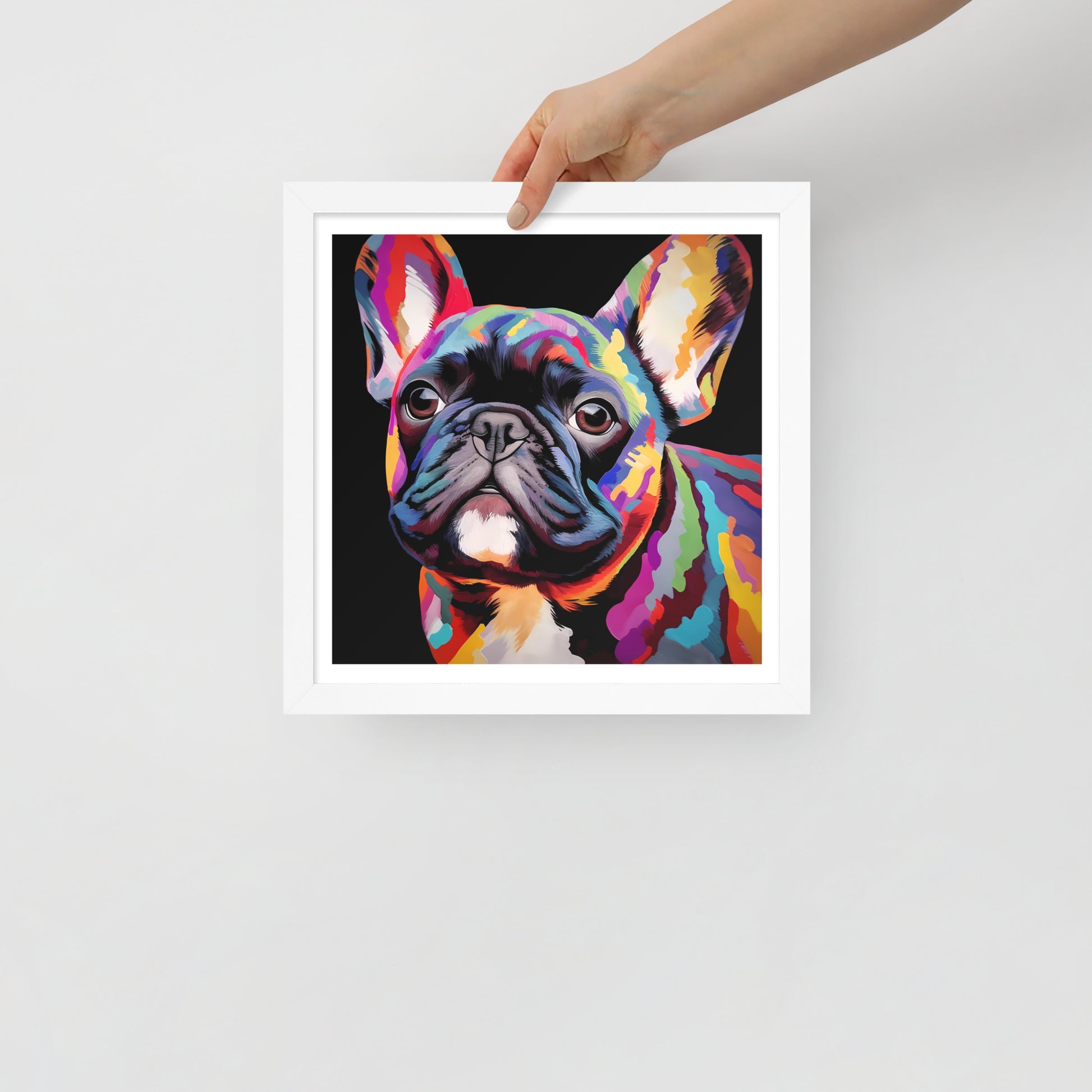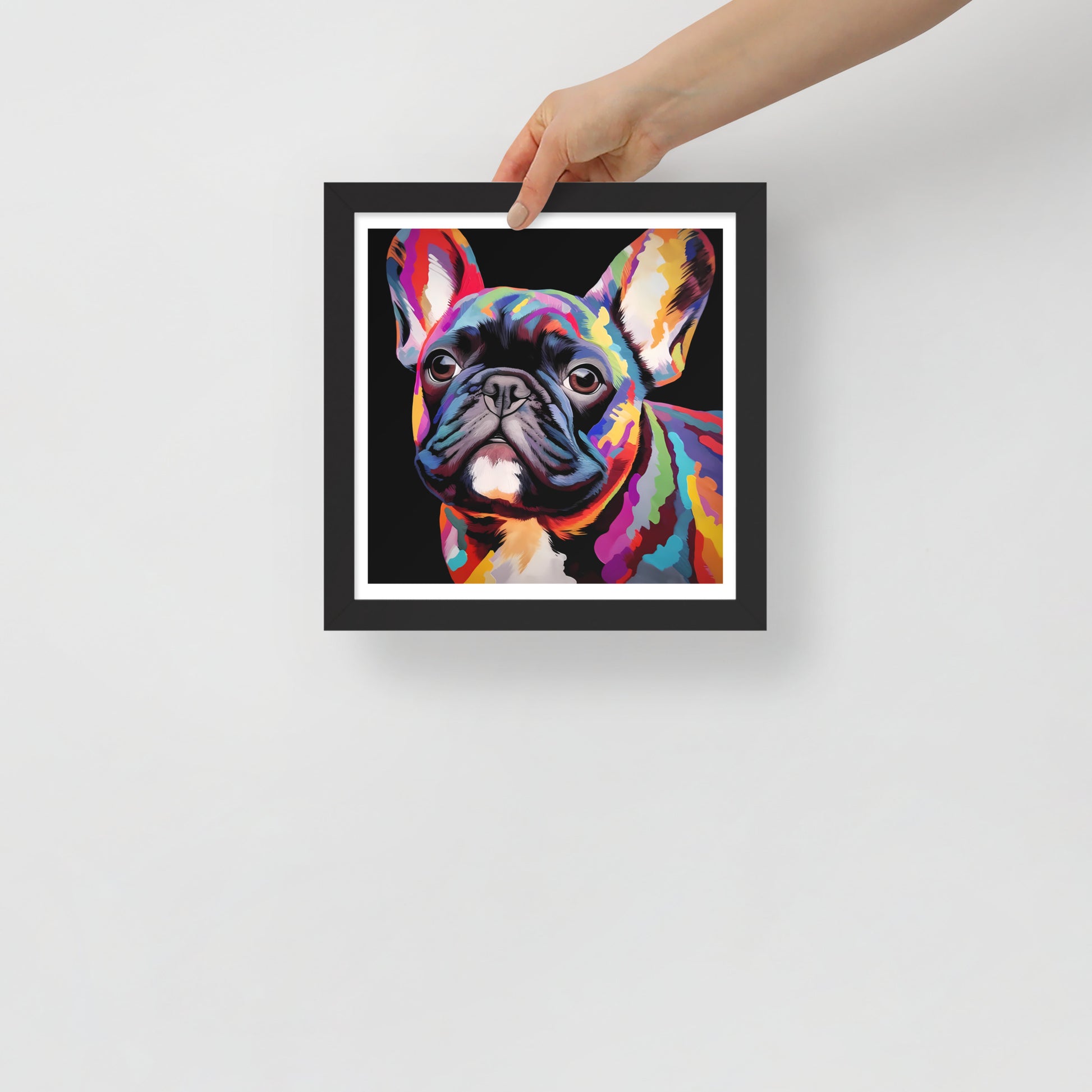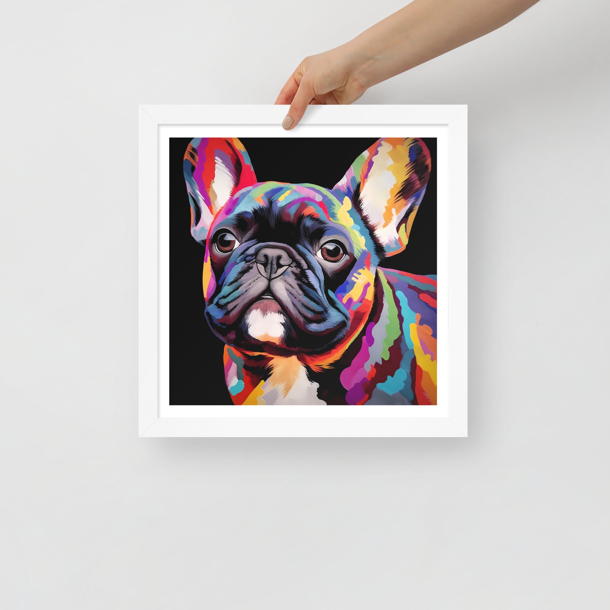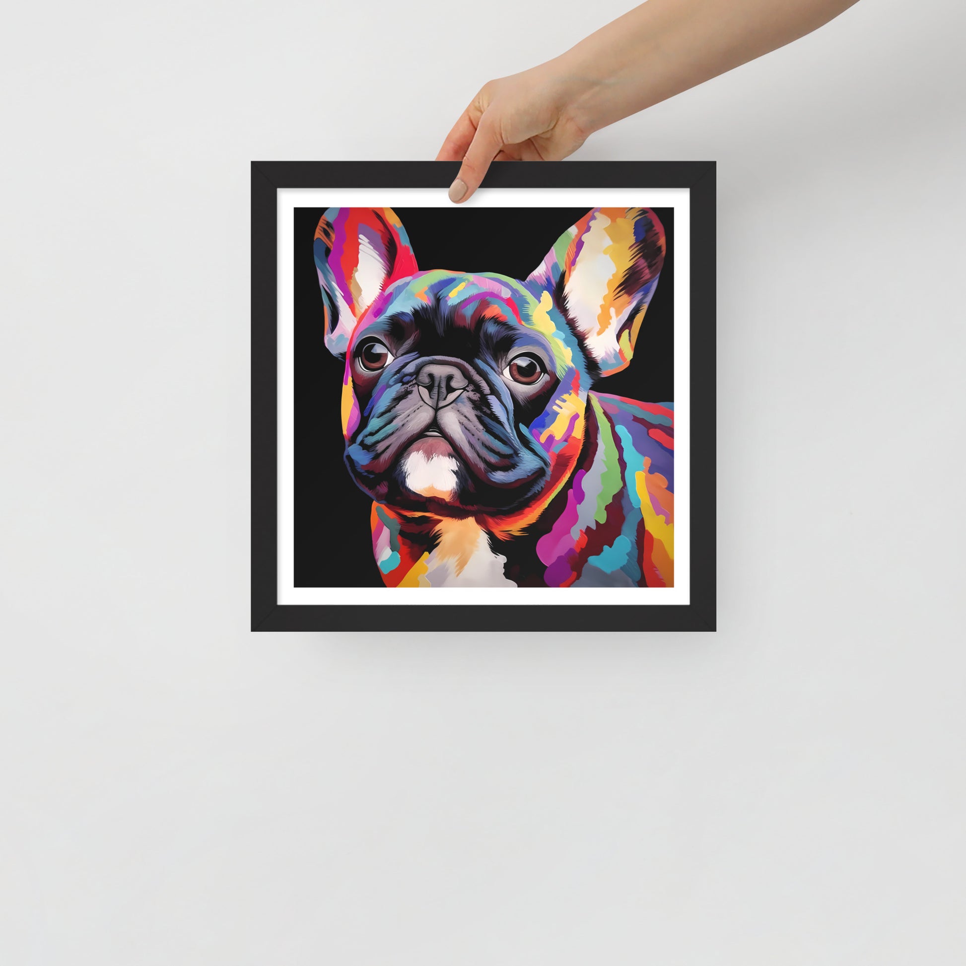 This art piece is a bold juxtaposition of color and darkness, embodying the essence of modern art with the timeless charm of one of the most adored canine breeds. It invites viewers into a world where tradition meets a vivid, contemporary aesthetic, encapsulating the brindle Frenchie's spirit in a spectrum of swoon-worthy color.