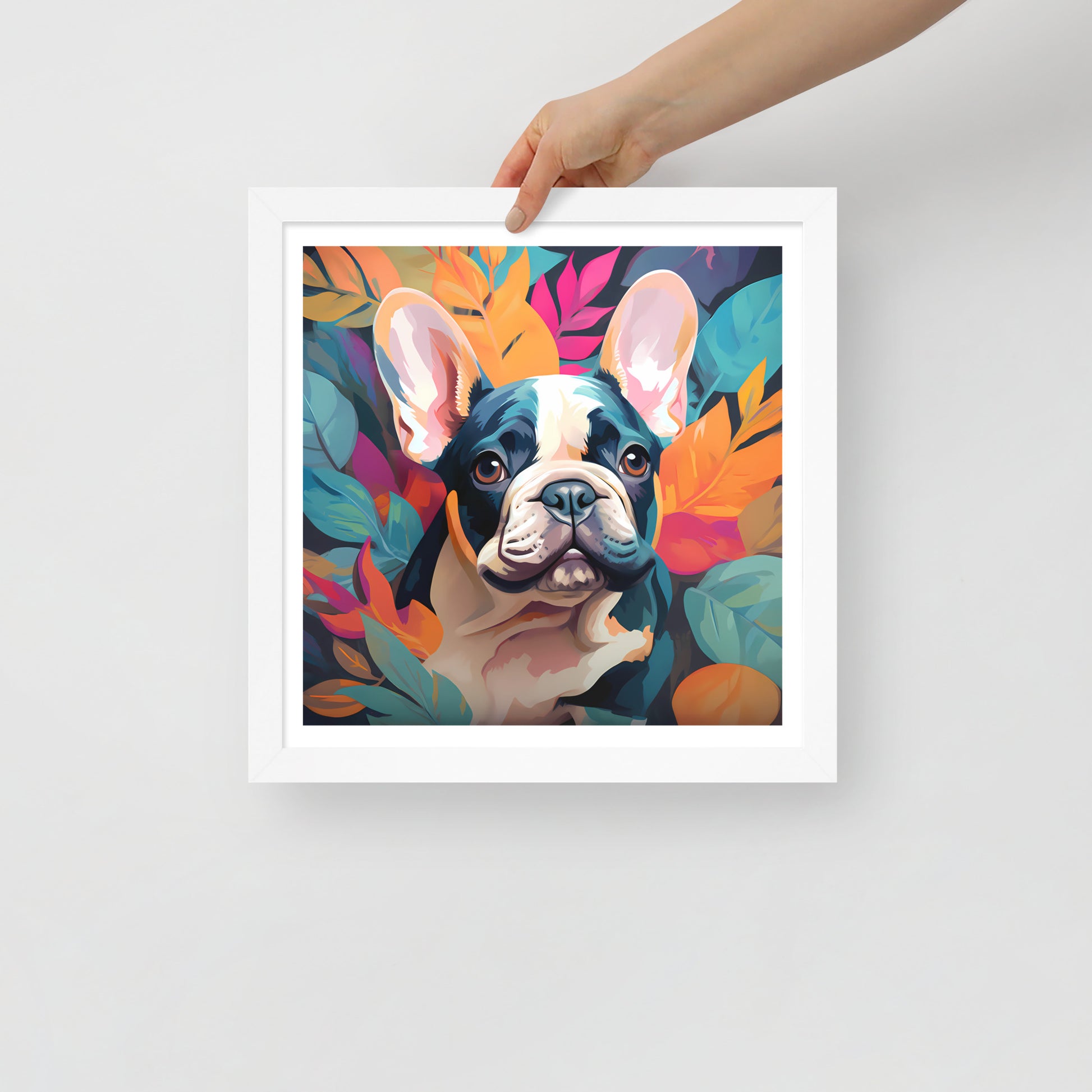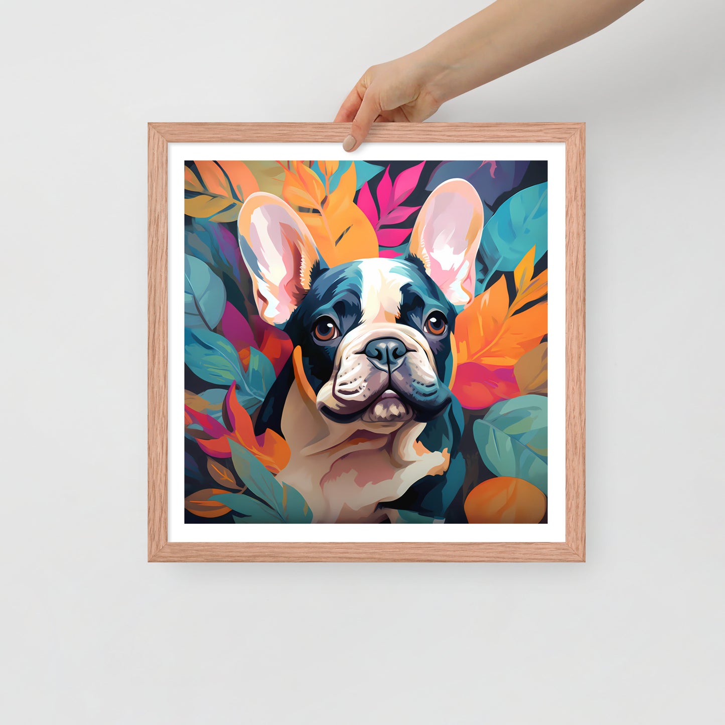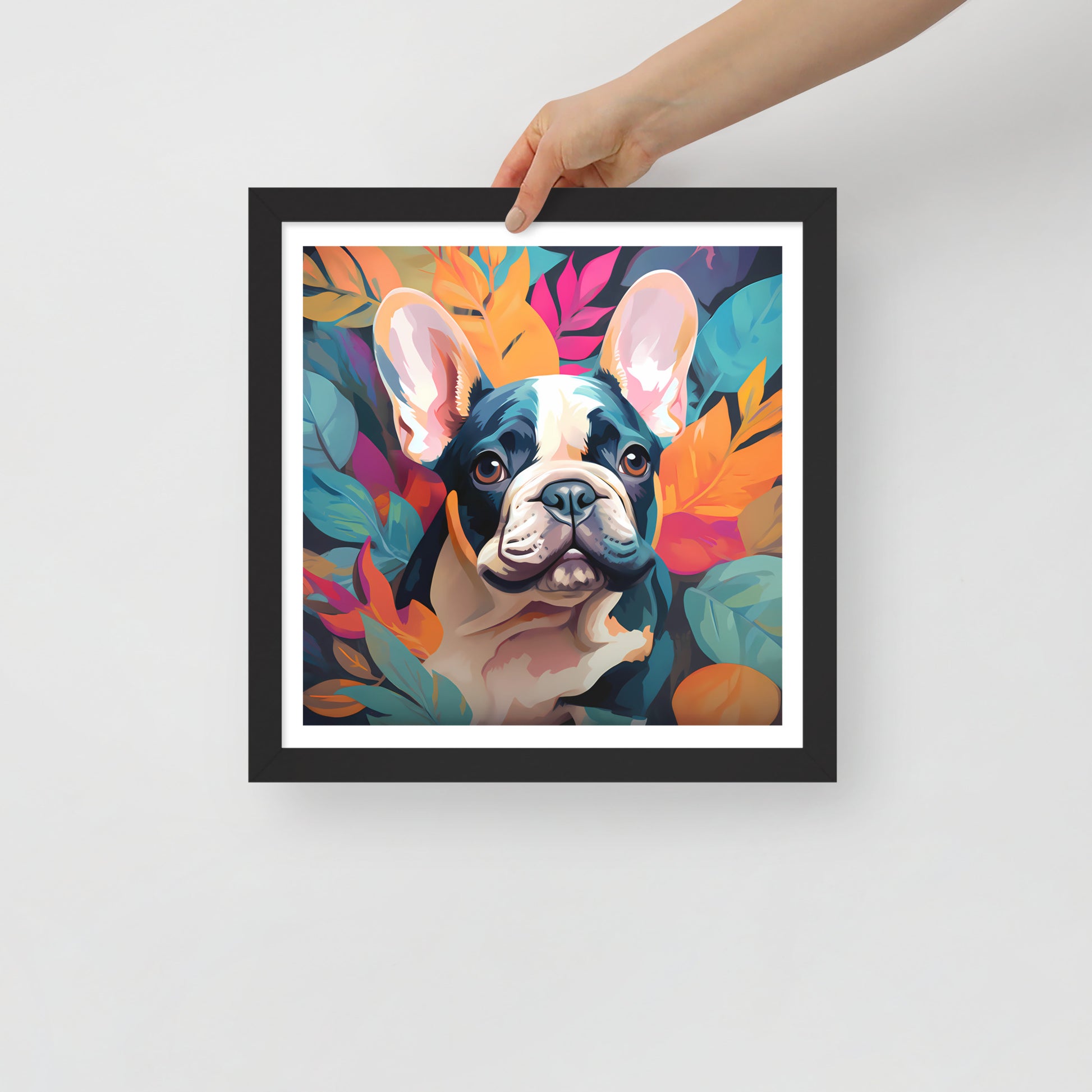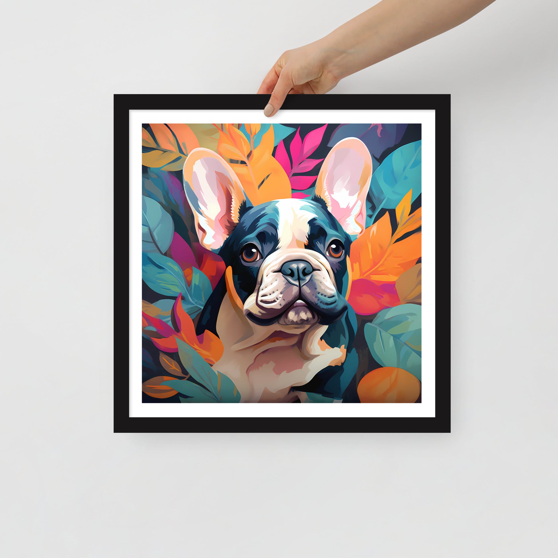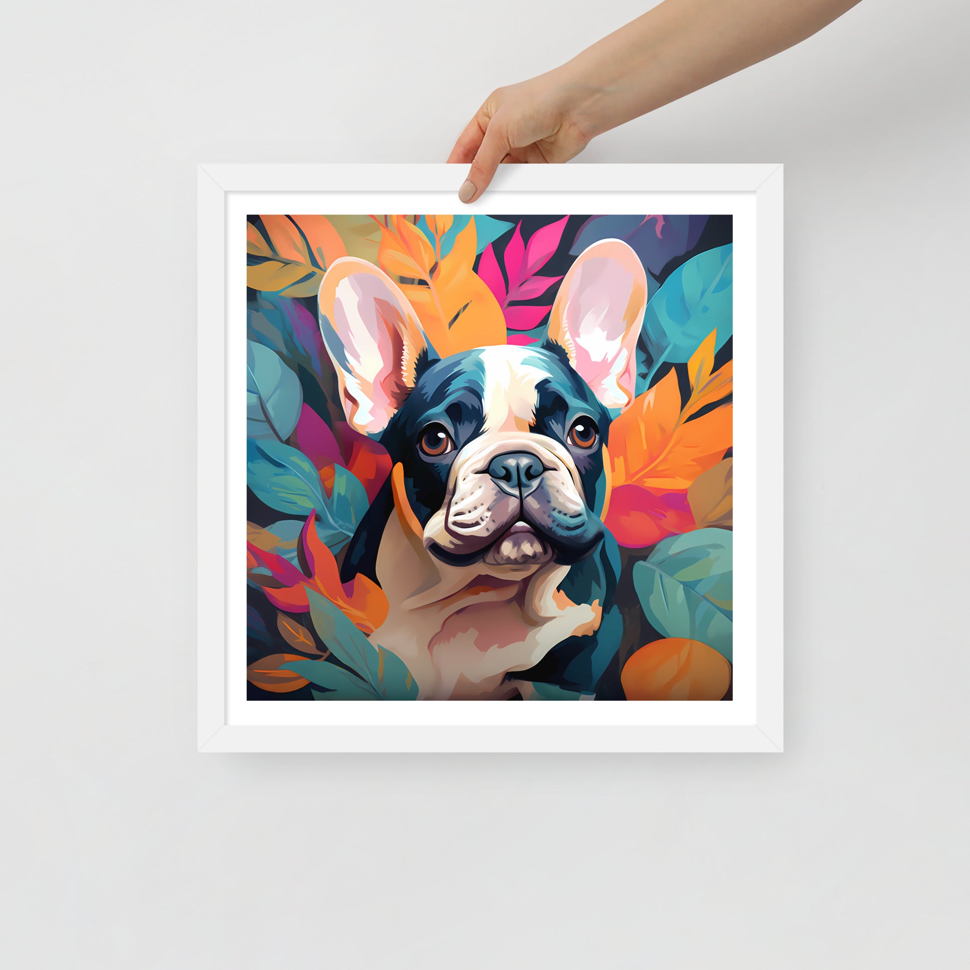 Embark on a visual journey with "Tropical Twilight," a framed artwork that captures the whimsical spirit of a pied French Bulldog against an explosion of lush, tropical flora. This piece is a celebration of nature's vivid palette and the charming personality of one of the most beloved dog breeds.