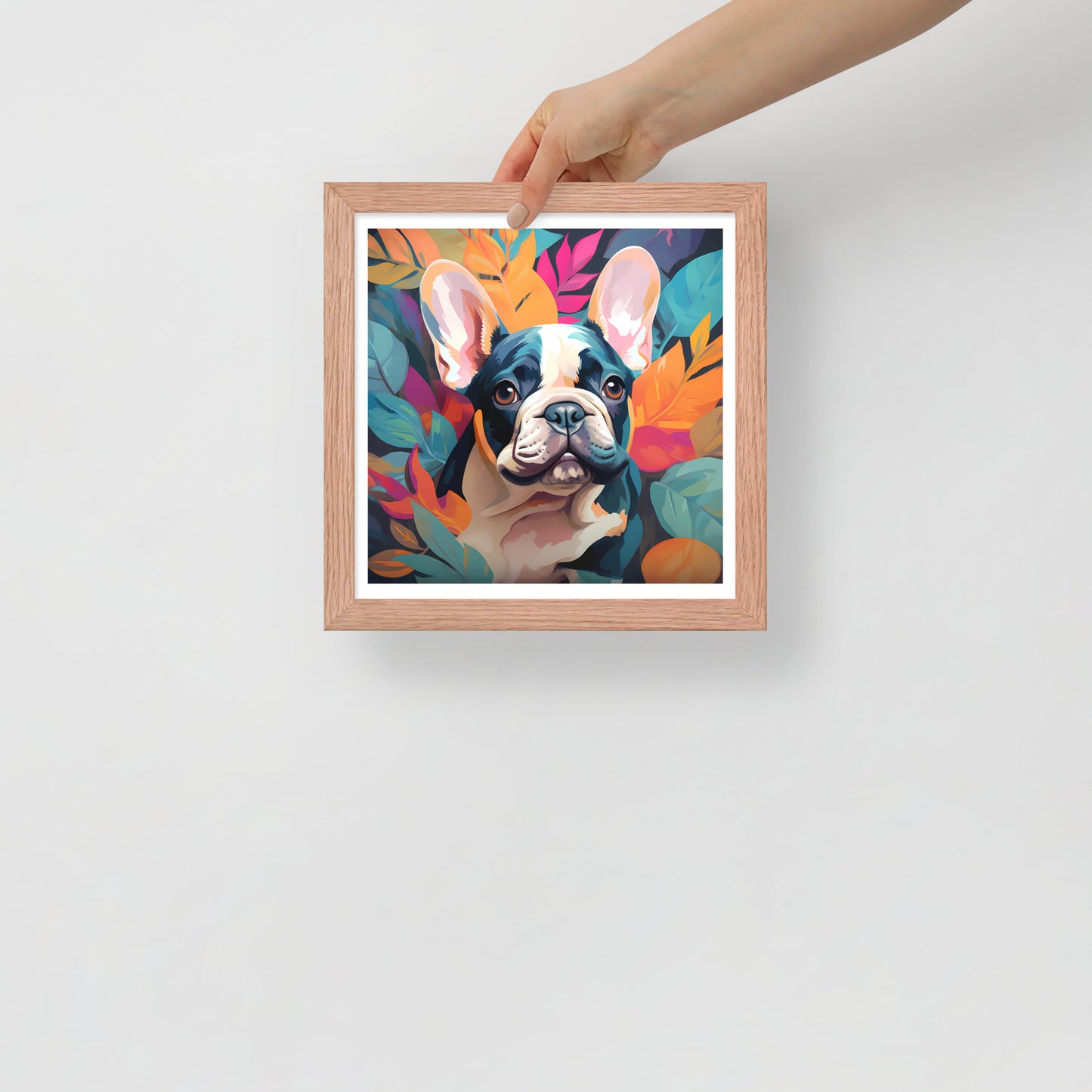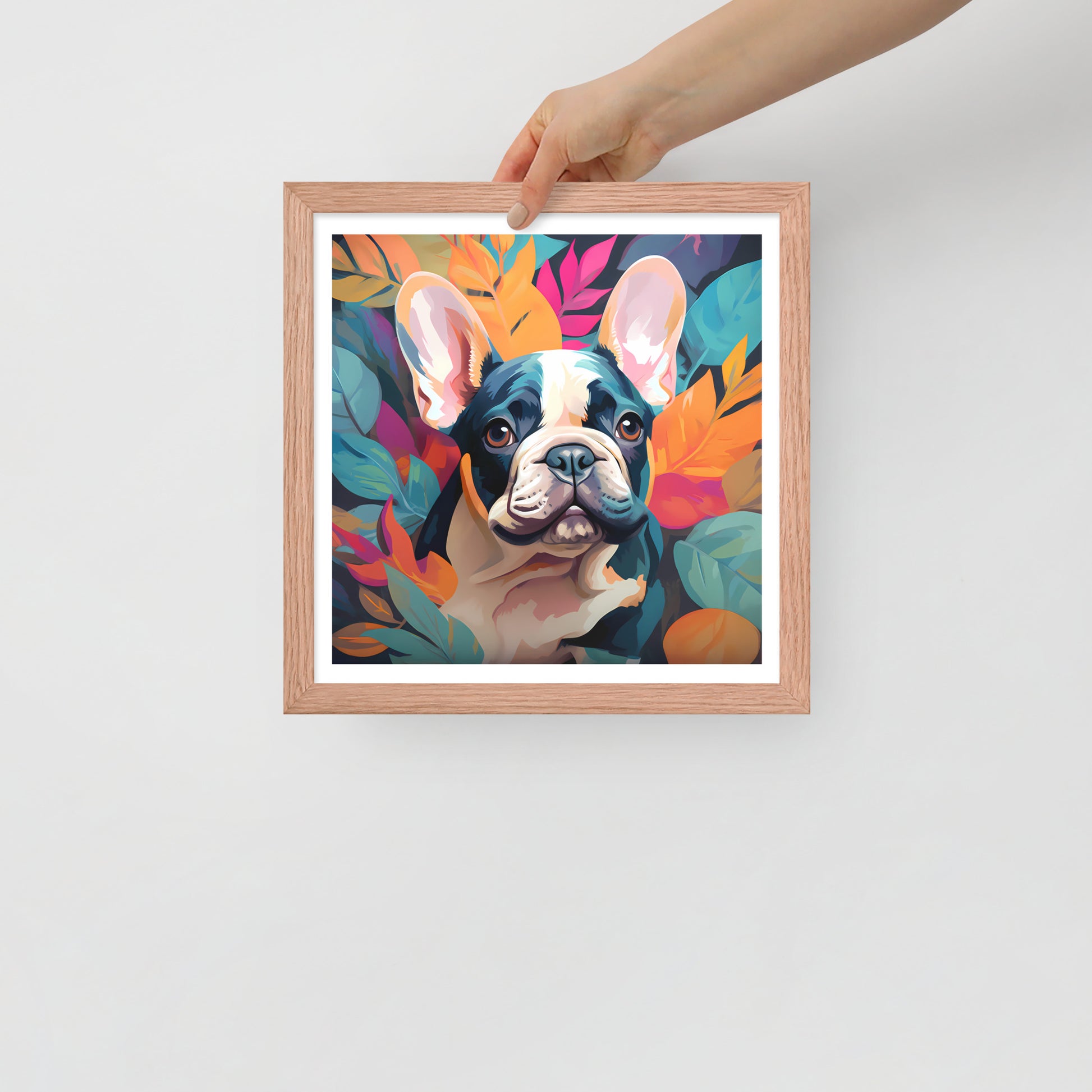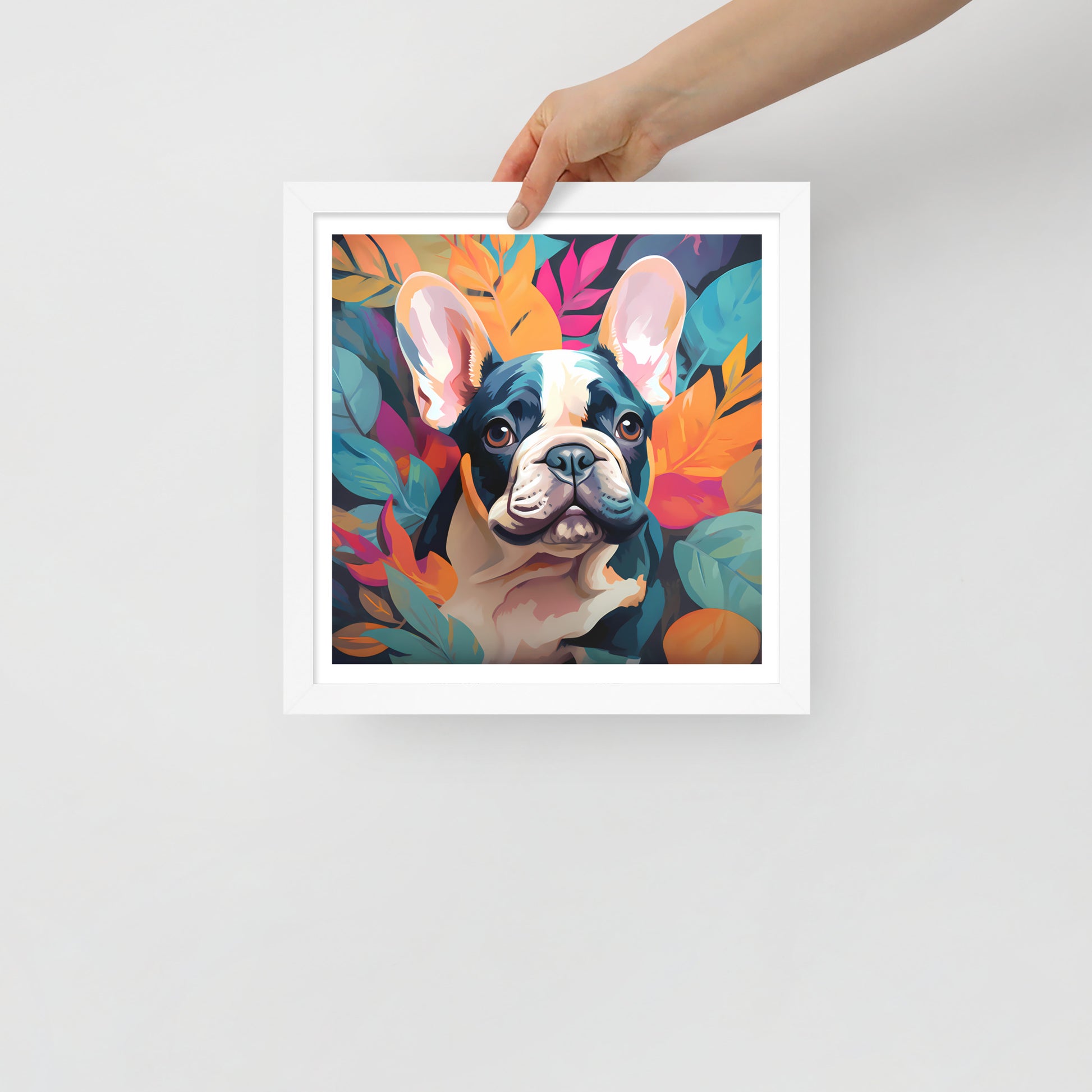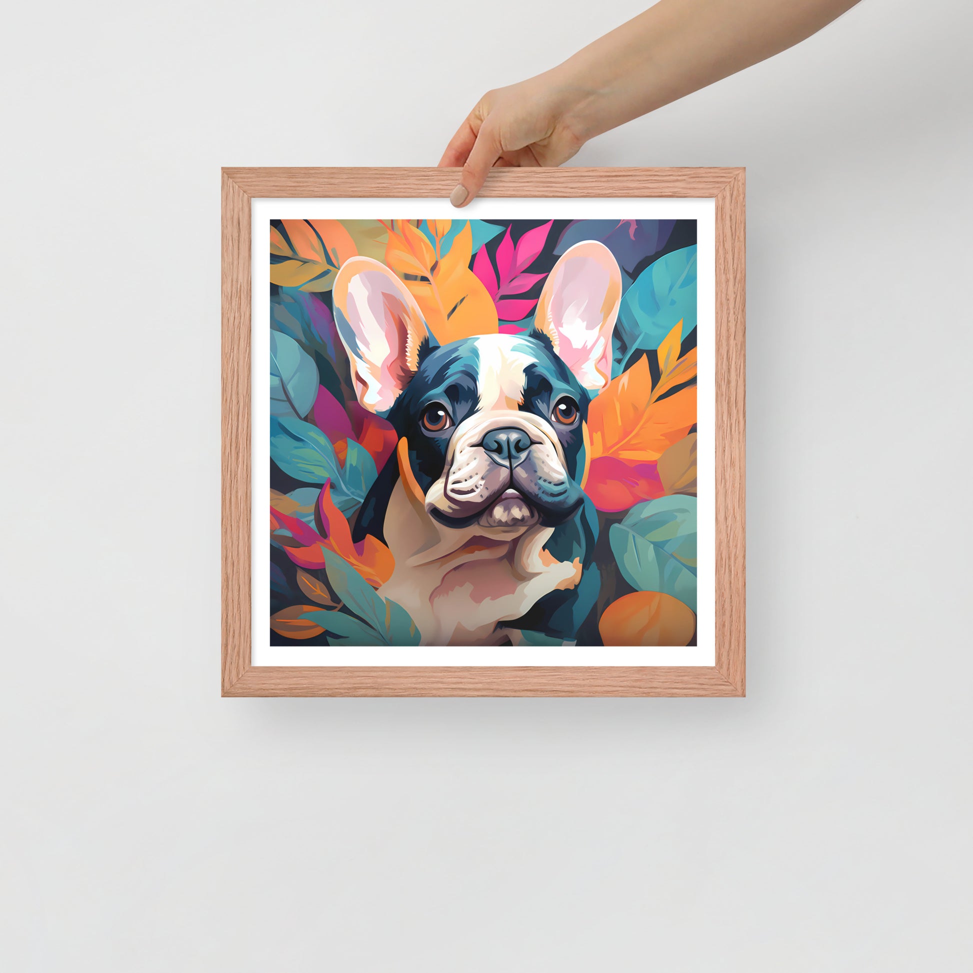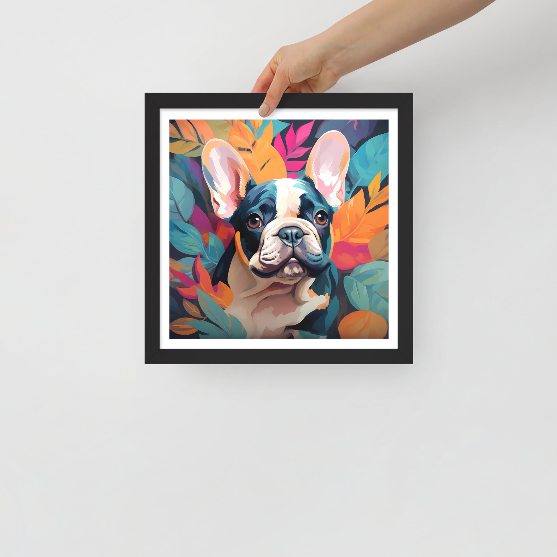 Embark on a visual journey with "Tropical Twilight," a framed artwork that captures the whimsical spirit of a pied French Bulldog against an explosion of lush, tropical flora. This piece is a celebration of nature's vivid palette and the charming personality of one of the most beloved dog breeds.