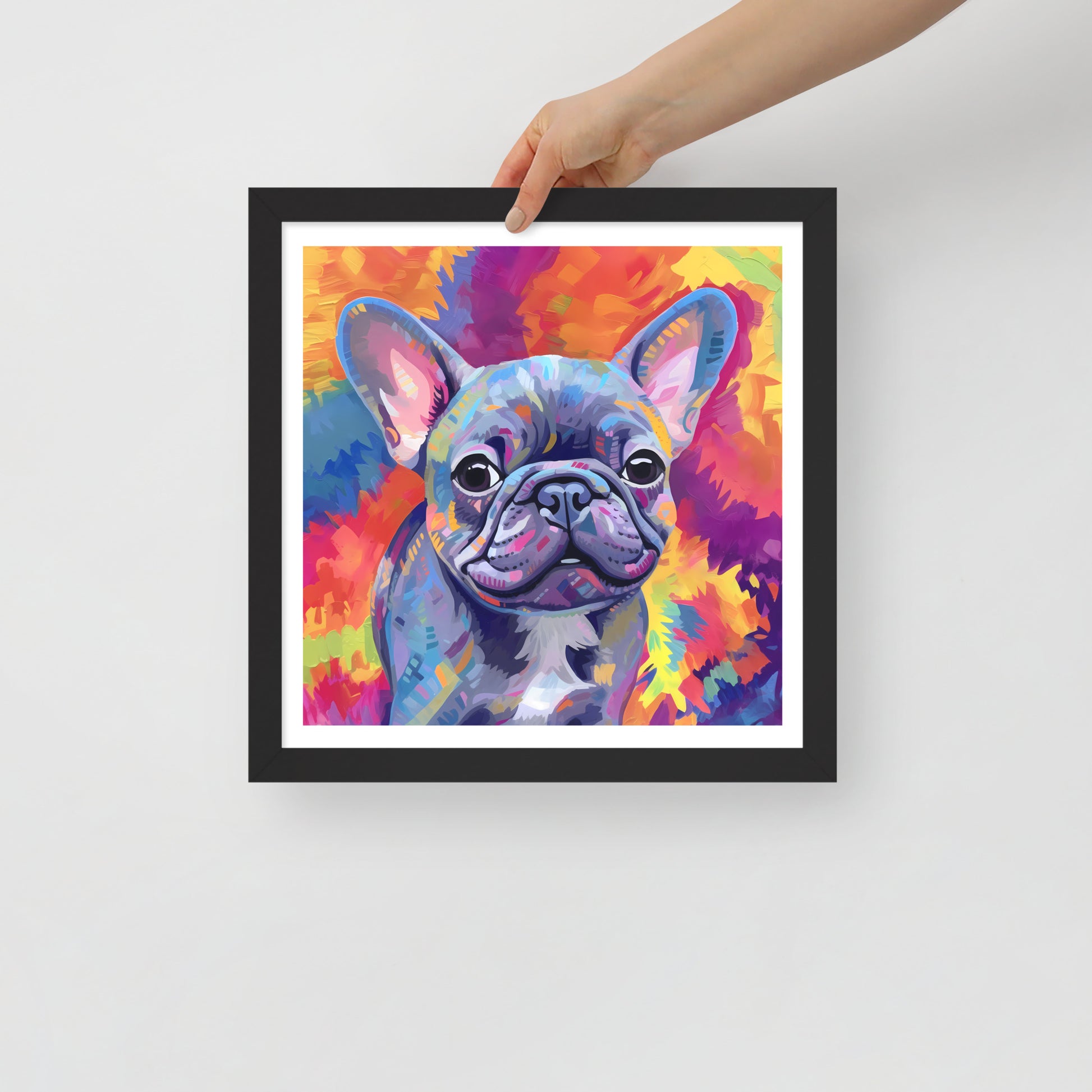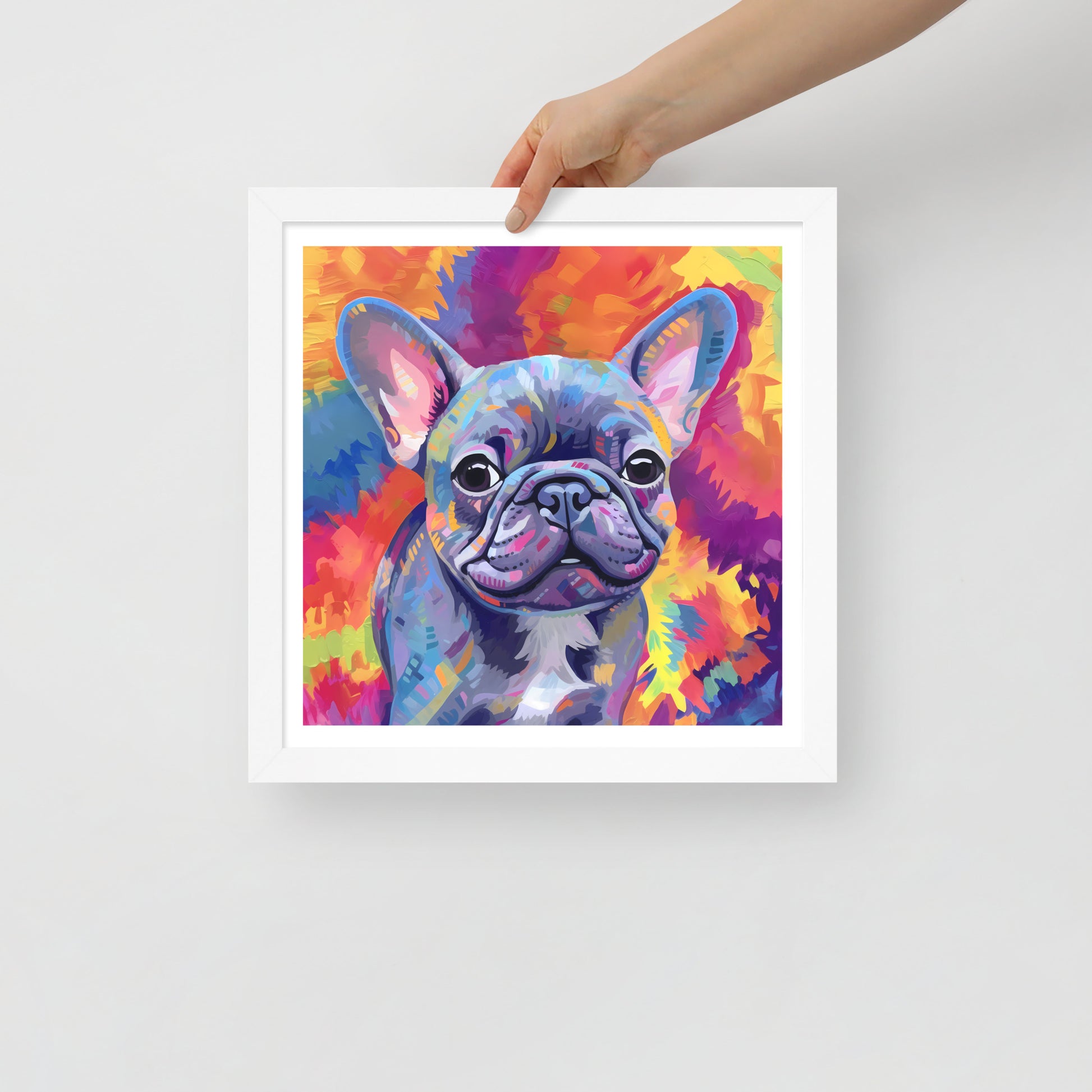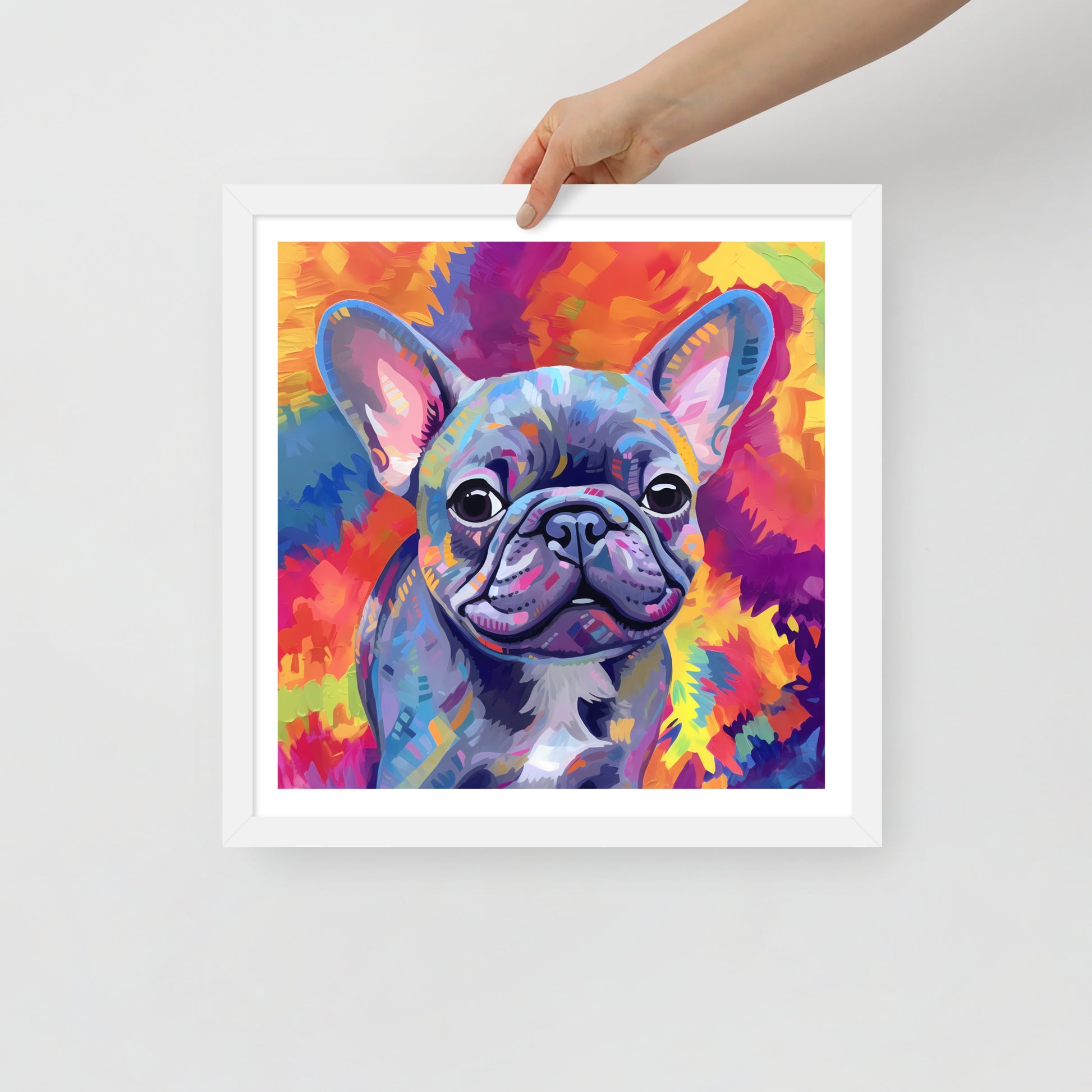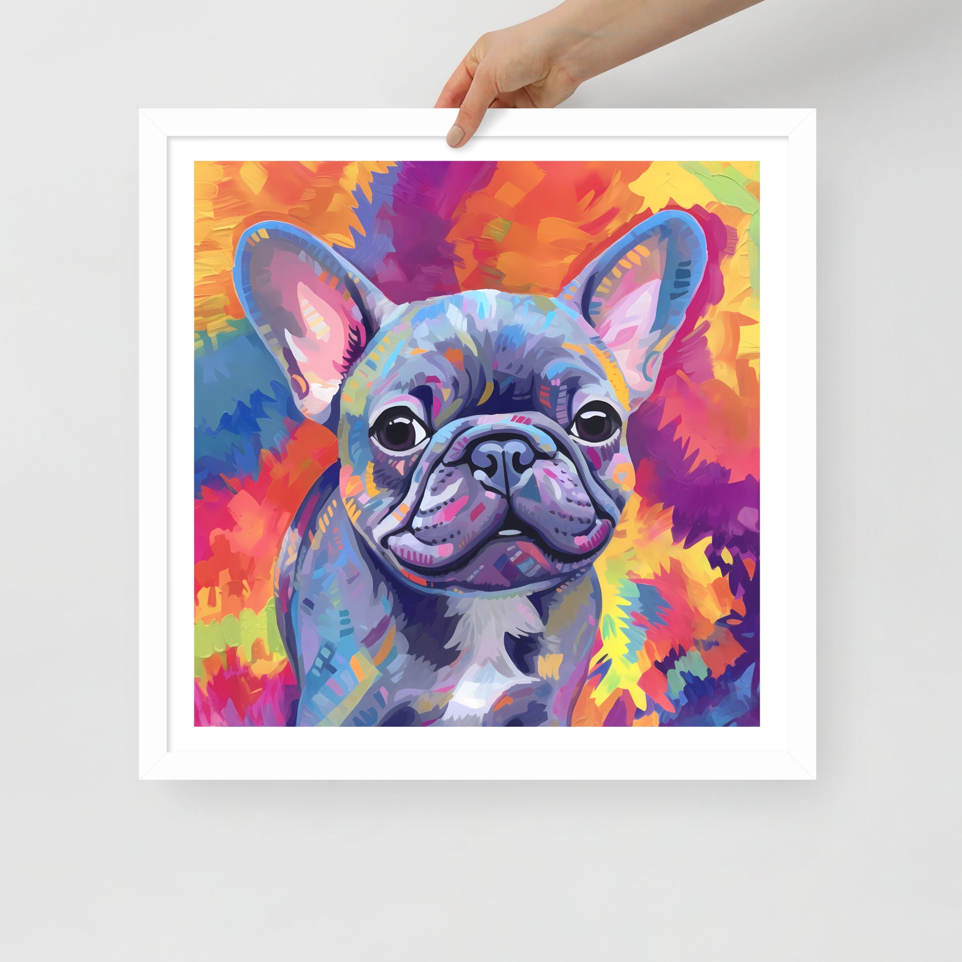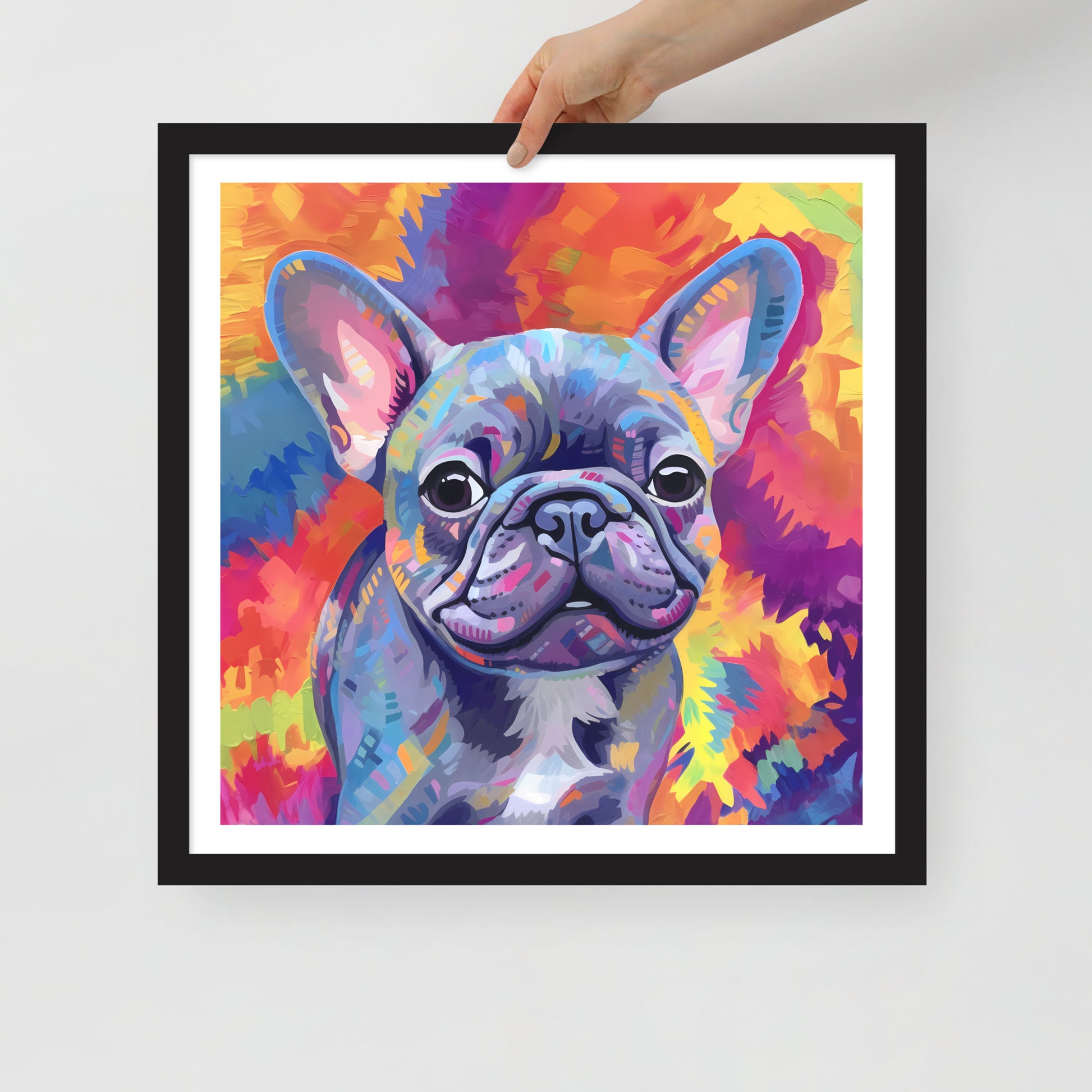 Dive into the chromatic wonder of "Vividly Violet," a framed artwork that captures the whimsical essence of a lilac French Bulldog through a vibrant spectrum of color. This piece is a true celebration of hues, where the warmth of a radiant abstract background meets the cool composure of our beloved Frenchie's gaze. The artwork is a harmonious dance between color and emotion, where the Frenchie's tranquil lilac shade is playfully juxtaposed against a dynamic backdrop, bursting with vivid brushstrokes that conjure the energy of a spontaneous color symphony.