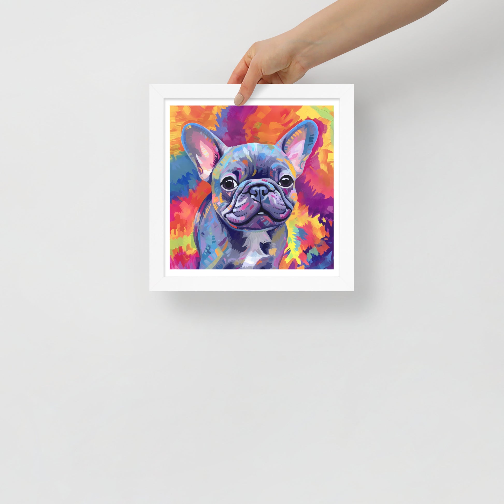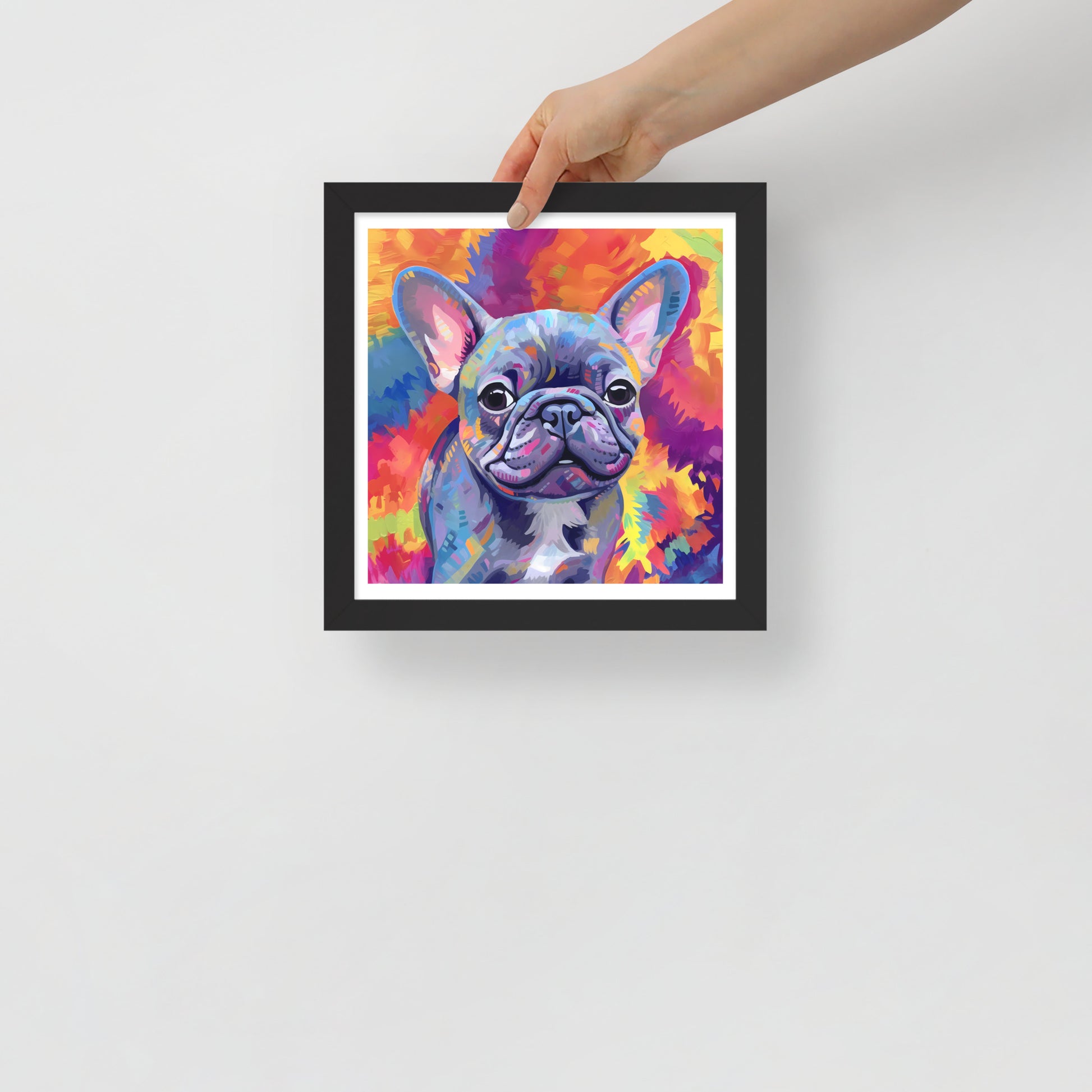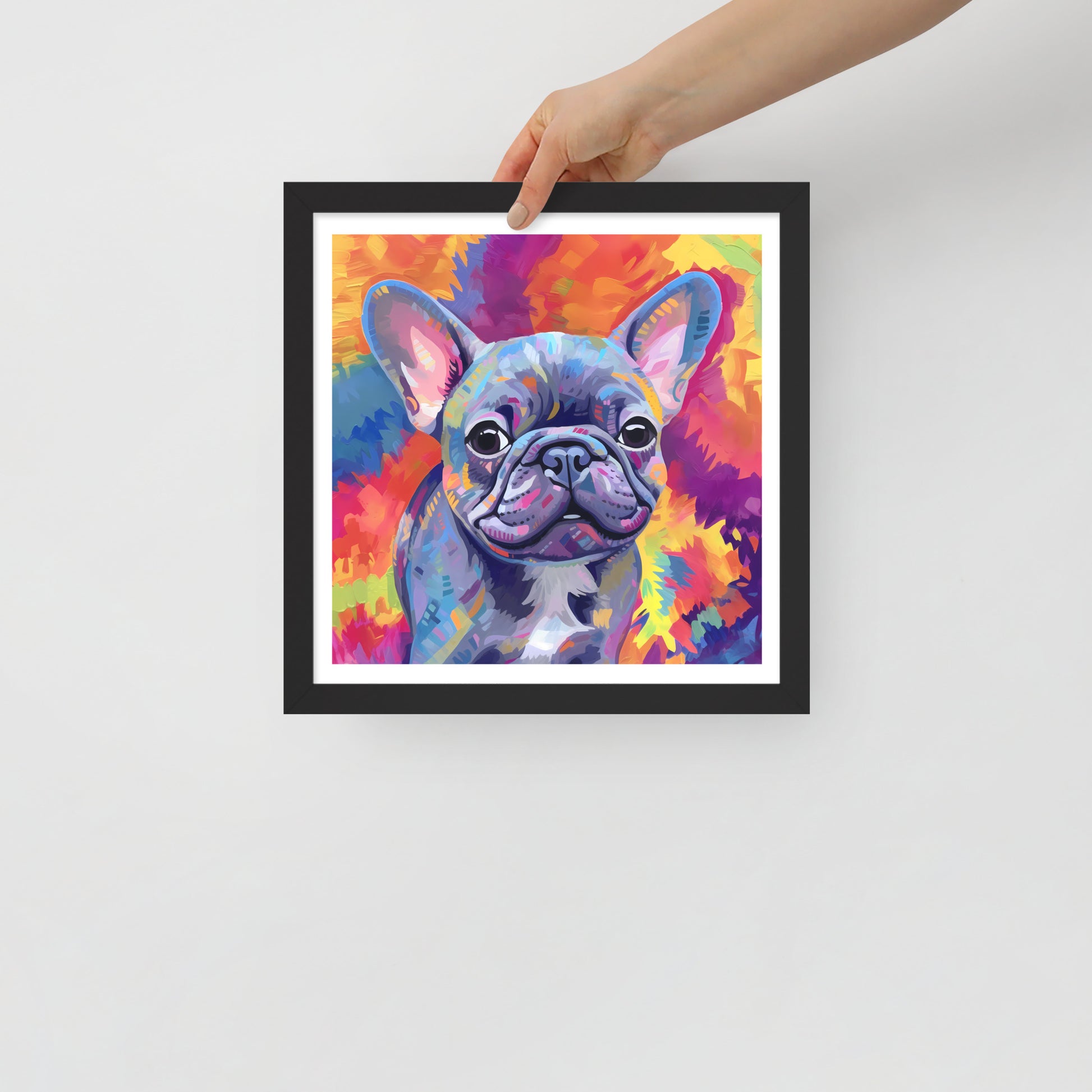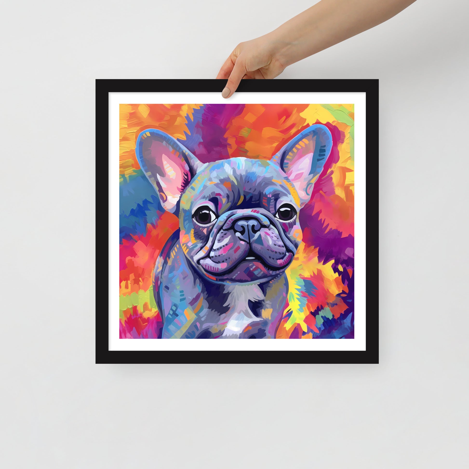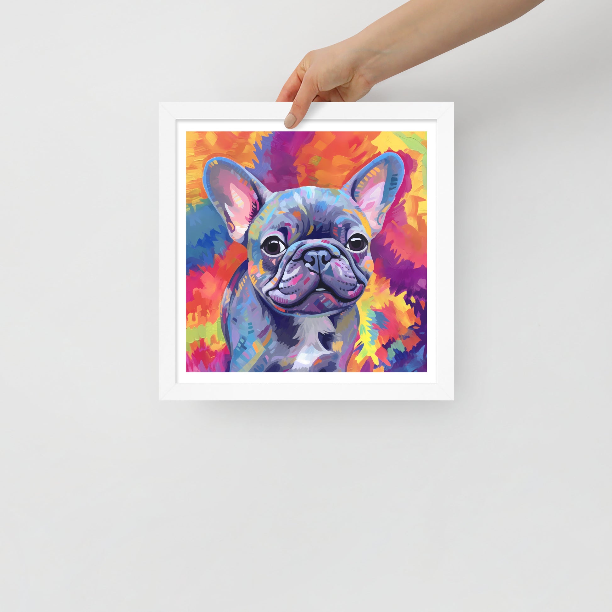 Dive into the chromatic wonder of "Vividly Violet," a framed artwork that captures the whimsical essence of a lilac French Bulldog through a vibrant spectrum of color. This piece is a true celebration of hues, where the warmth of a radiant abstract background meets the cool composure of our beloved Frenchie's gaze. The artwork is a harmonious dance between color and emotion, where the Frenchie's tranquil lilac shade is playfully juxtaposed against a dynamic backdrop, bursting with vivid brushstrokes that conjure the energy of a spontaneous color symphony.